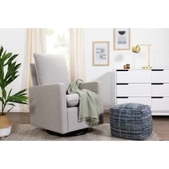 The Cali Pillowback Swivel Glider has been designed for mamas and papas with a high plush pillowback for head and neck support. The smooth gliding, 360-degree swivel base allows you to gently lull your babe to sleep. It’s a stylish but also more sustainable choice for the modern nursery. Upholstered by hand in our eco-performance fabric, that is stain resistant, water repellent, and made from recycled materials.