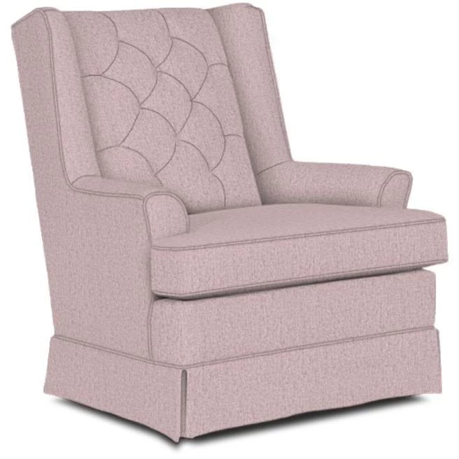Neat, sweet, and definitely a treat! Â The simplistic style of this traditionally tufted wingback swivel glider makes Nikole easily adaptable to any environment. Â Perfectling styled for the nursery, this swivel glider can easilty transition to the living room, reading den or bedroom. The whisper smooth gliding motion, tall back, and plush supportive seat cushion will be a winner in everyone’s eyes. Â This swivel glider can be custom built in any of Best Chairs’ designer select fabrics, and you can glide with your feet up with the matching ottoman.