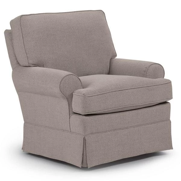 Traditionally styled this Swivel Glider chair features a heavily cushioned pillow back and reversible, banded seat cushion. The large, rolled arms are accented with cording, dressing up this beautiful chair. The look is finished off with a slightly taller skirt. Â It is also available as a stationary Club Chair. Â Put your feet up with the matching glide ottoman.