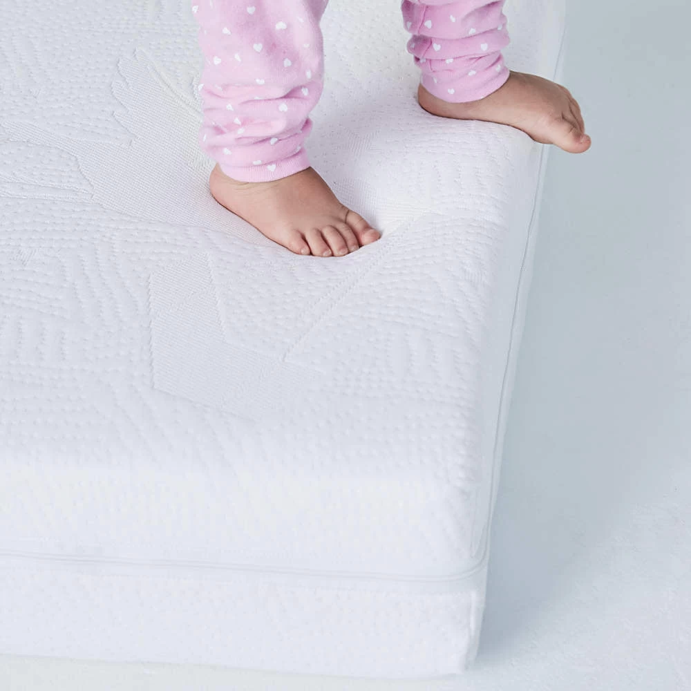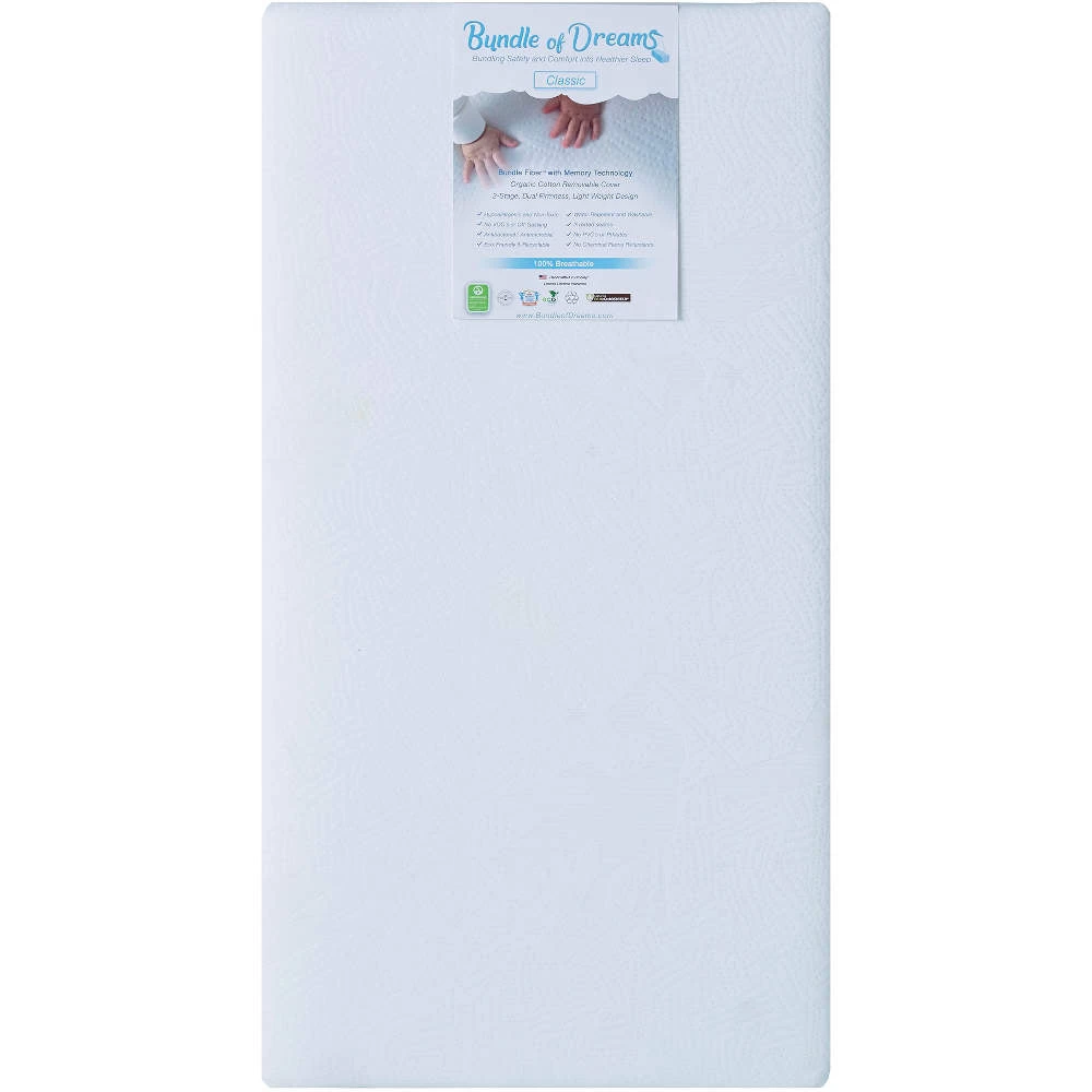 This 6 Inch 2-Stage Crib & Toddler Mattress has a split fabric consisting of Organic Cotton and our unique cooling Celsius fabric. The cooling fabric has Glacier Cooling yarns, Tencel Rayon, and, like the Organic Cotton fabric, is also water repellent. The entire cover is removable & machine washable. This 100% Breathable mattress not only helps regulate temperature by allowing air to pass through the entire mattress, but there are no VOC’s, no off-gassing (that chemical smell when you open a mattress with foam), and no toxic emissions. It also has a water based, prop 65 complaint, cooling application on the infant side. Studies have shown that sleeping cooler helps people sleep better. We have applied this concept to our baby mattress. It’s designed for extra firm infant support, and a comfortable plush side for your growing toddler. Around the entire perimeter of the mattress, is a 2 inch, firm edge guard to support children as they begin standing. All materials used are eco-friendly, hypoallergenic, and breathable. This mattress is GreenGuard Gold Certified.