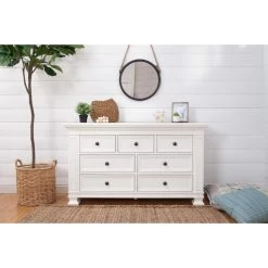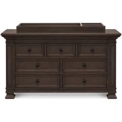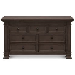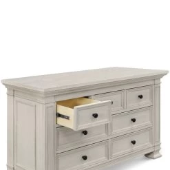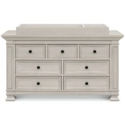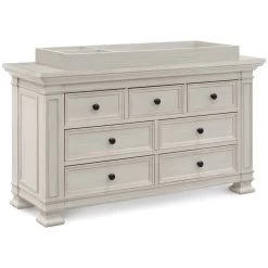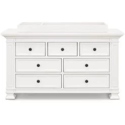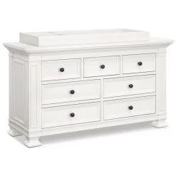 The Classic Double-Wide Dresser is designed to pair with the Tillen 4-in-1 Crib – mirroring its recessed details, molding, and luxurious footprint. Four spacious drawers on bottom provide ample storage space, while three top drawers provide added organization for baby’s necessities. With timeless details and solid construction, the majestic Classic dresser can transition beyond the baby years into any room in your home.