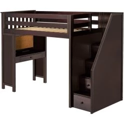 Sleep/Study Solution – Twin Loft with built-in drawers. Desk has pencil-stop lip & smooth drawer glides, can face inwards or outwards. Full Bed fits L-Shaped under Loft. Solid knot free Pine construction with flush, color coordinated hardware creates a clean & modern look. Oversized steel hardware ensures solid connections. Each bed tested for 400lb to comfortably sleep kids or adults. Pre-assembled components for fast & easy assembly. 15″ guardrails accommodate standard mattresses (slat rolls included). Recommended for 8 feet ceiling height above. This bed meets or exceeds federal safety standards. Mattress, Cork board for desk & bedside tray sold separately.