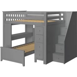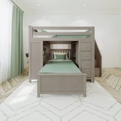 Study and storage now in a stylish package. The Buxton 4 Loft Bed handles it all in one beautiful setup. This bed’s unique design has a freestanding lower bed that can be moved for ultimate versatility. The desk with two drawers is the perfect place for studying and storing your school essentials. An included storage tower with extra-long drawers organizes your clothes, books, and bedding. A wide, anti-slip staircase makes climbing up simple and easy. The staircase also features built-in storage for your shoes and other everyday items. Safety and security come standard with tall 15″ guard rails for the top bunk. Crafted with solid, knot-free New Zealand pine wood and metal-on-metal connections, this bed offers strong support for years to come. The durable, non-toxic low VOC finishes make this bed the clean and healthy choice for your home. A slatted headboard and flush, color-matched hardware create a modern look. Combining superior quality with classic design, this Loft with Staircase + Desk + Storage + Lower Bed is the perfect all-in-one solution for every room.