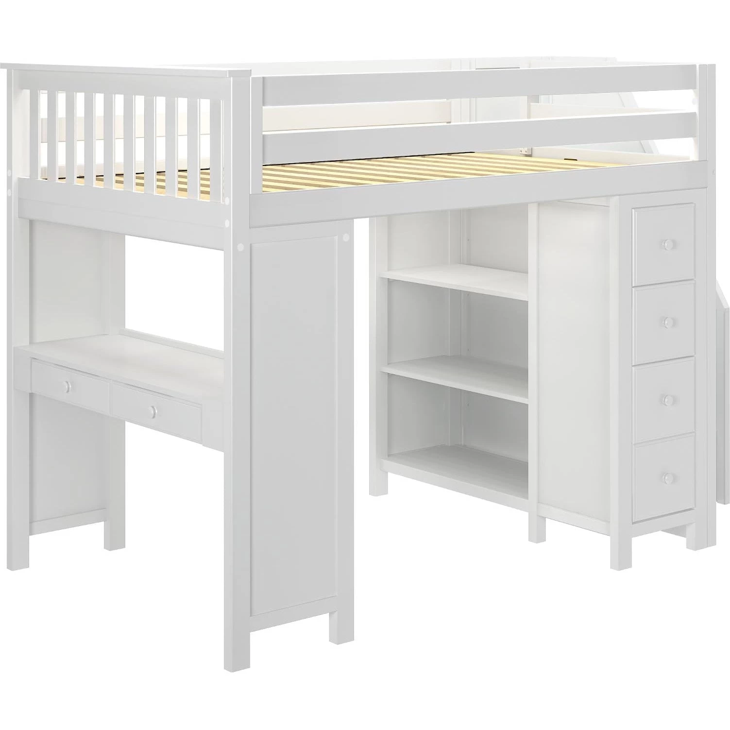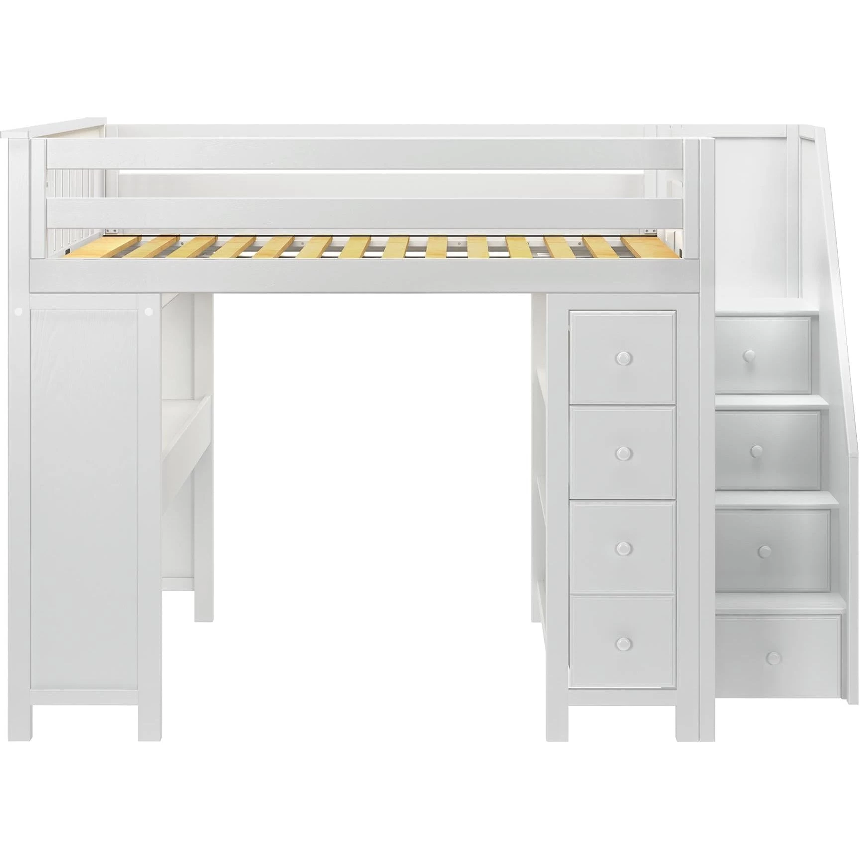 Sleep, study, and storage spaces come together in the Buxton 3 Loft Bed. The compact desk space pairs with two drawers to store your schoolwork essentials. A storage tower with extra-long shelves organizes your clothes, books, and bedding. A wide, anti-slip staircase makes climbing up simple and easy. The staircase also features built-in storage for your shoes and other everyday items. This bed’s raised loft design maximizes the space in your room. Crafted with solid, knot-free New Zealand pine wood and strong metal-on-metal connections, this bed offers strong support for years to come. A beautiful slatted headboard and flush, color-matched hardware create a modern look. Solid plywood slats with a metal support bar contribute to a high 400 lb. resting weight capacity. Durable, non-toxic low VOC finishes make this bed the clean and healthy choice for your home. Combining superior quality with classic design, this Loft with Staircase + Desk + Storage is the perfect all-in-one solution for every room.