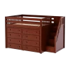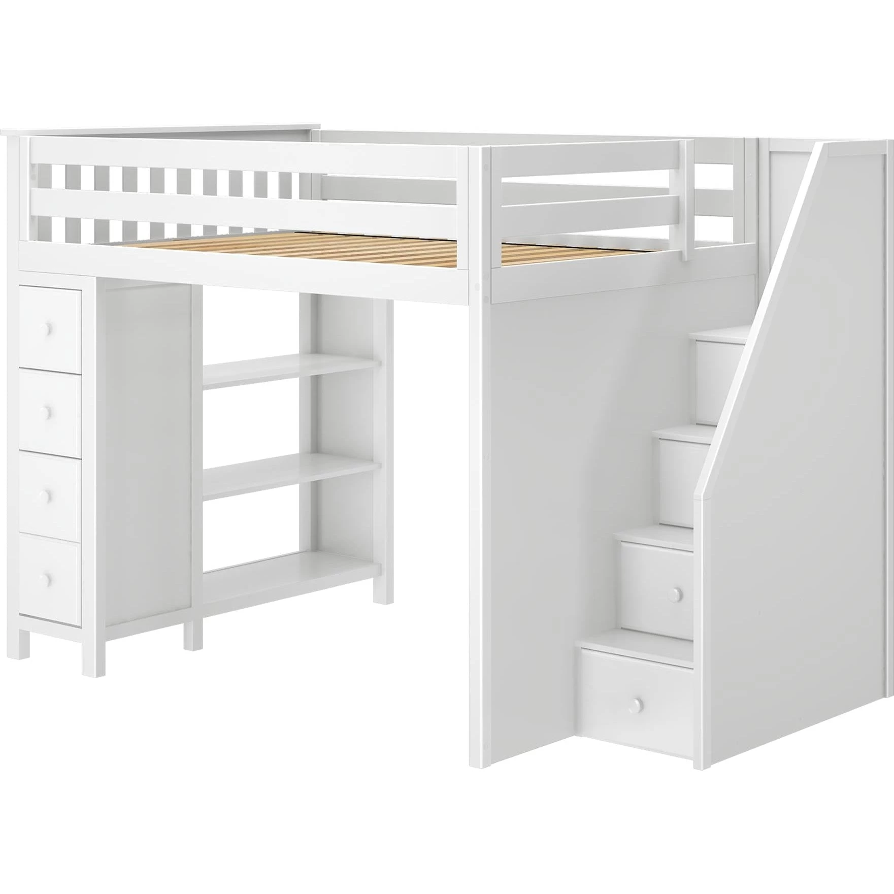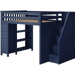 Your favorite sleep-storage solution. The Cheltenham Loft Bed allows you to organize all your favorite things effortlessly. With an included storage tower, each extra-long shelf creates the perfect place for your clothes, books, and bedding. This bed’s raised loft design maximizes the space in your room. The slatted headboard and flush color-matched hardware create a modern look that goes great with any decor. Made with solid, knot-free New Zealand pine wood and strong metal-on-metal connections, this bed’s frame offers amazing strength and support. The solid plywood slats and metal support bar create a high 400 lb. resting weight capacity per sleeping surface. Safety and security come standard with tall 15″ guard rails. Climbing up is simple and easy thanks to a wide anti-slip staircase. Durable, non-toxic low VOC finishes make this bed the clean, healthy choice for your home. Combining superior quality with classic design, this Loft with Staircase + Storage is the perfect all-in-one choice for every room.