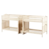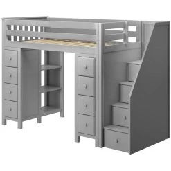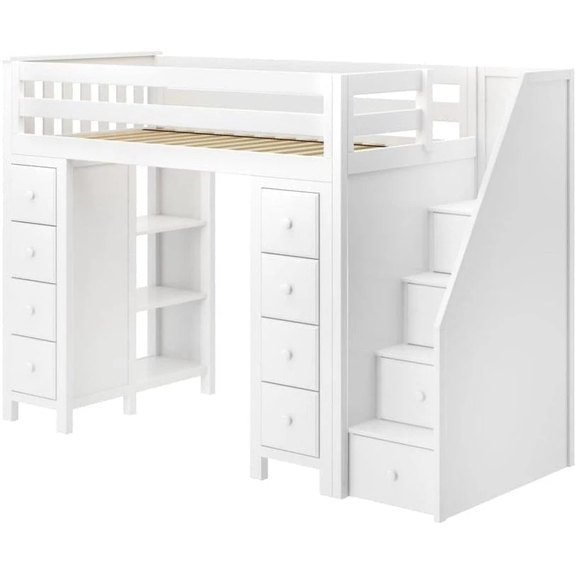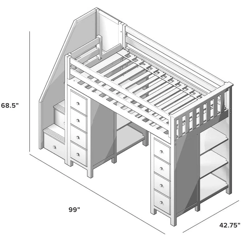 Sleep/Storage Solution – Twin Staircase Loft with built in drawers. Built-in storage towers combines 4 roomy front-facing drawers with 3 book shelves behind it. Solid knot free Pine construction with flush, color coordinated hardware creates a clean & modern look. Oversized steel hardware ensures solid connections. Each bed tested for 400lb to comfortably sleep kids or adults. Pre-assembled components for fast & easy assembly. 15″ guardrails accommodate standard mattresses (slat rolls included). Recommended for 8 feet ceiling height above. This bed meets or exceeds federal safety standards. Mattress & Bedside tray sold separately.