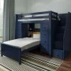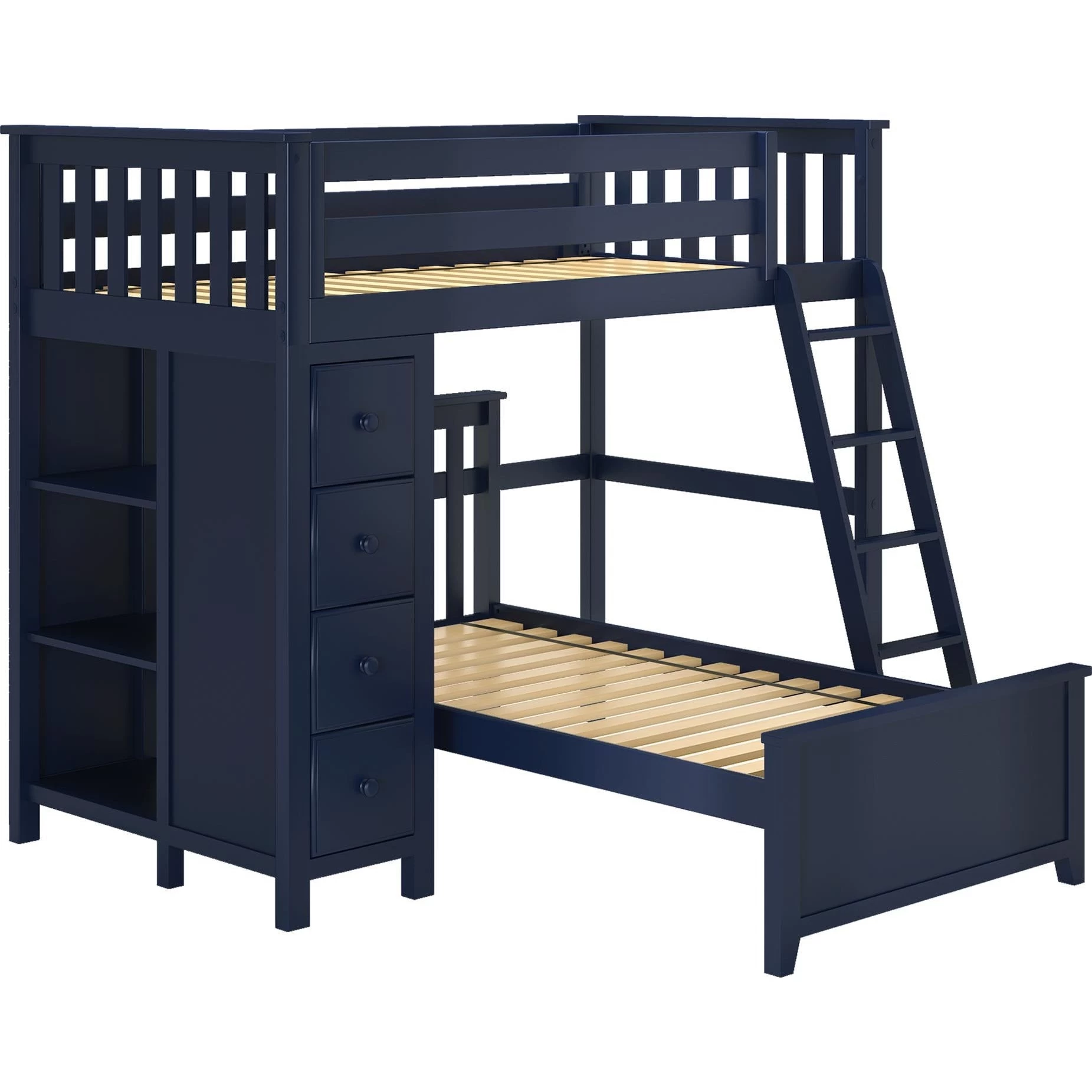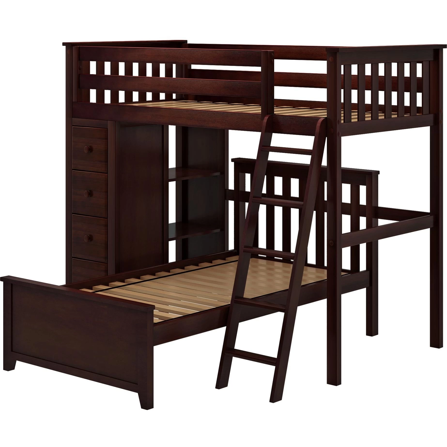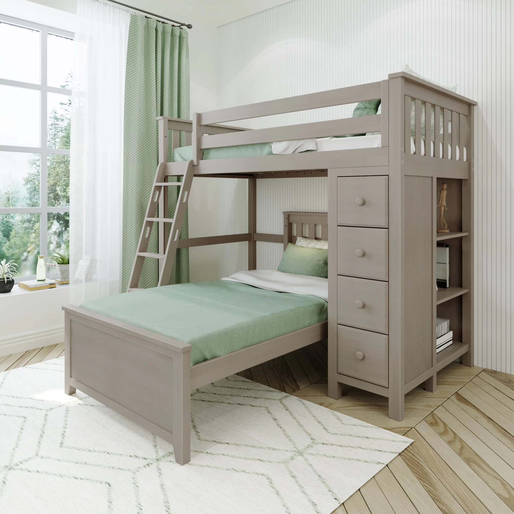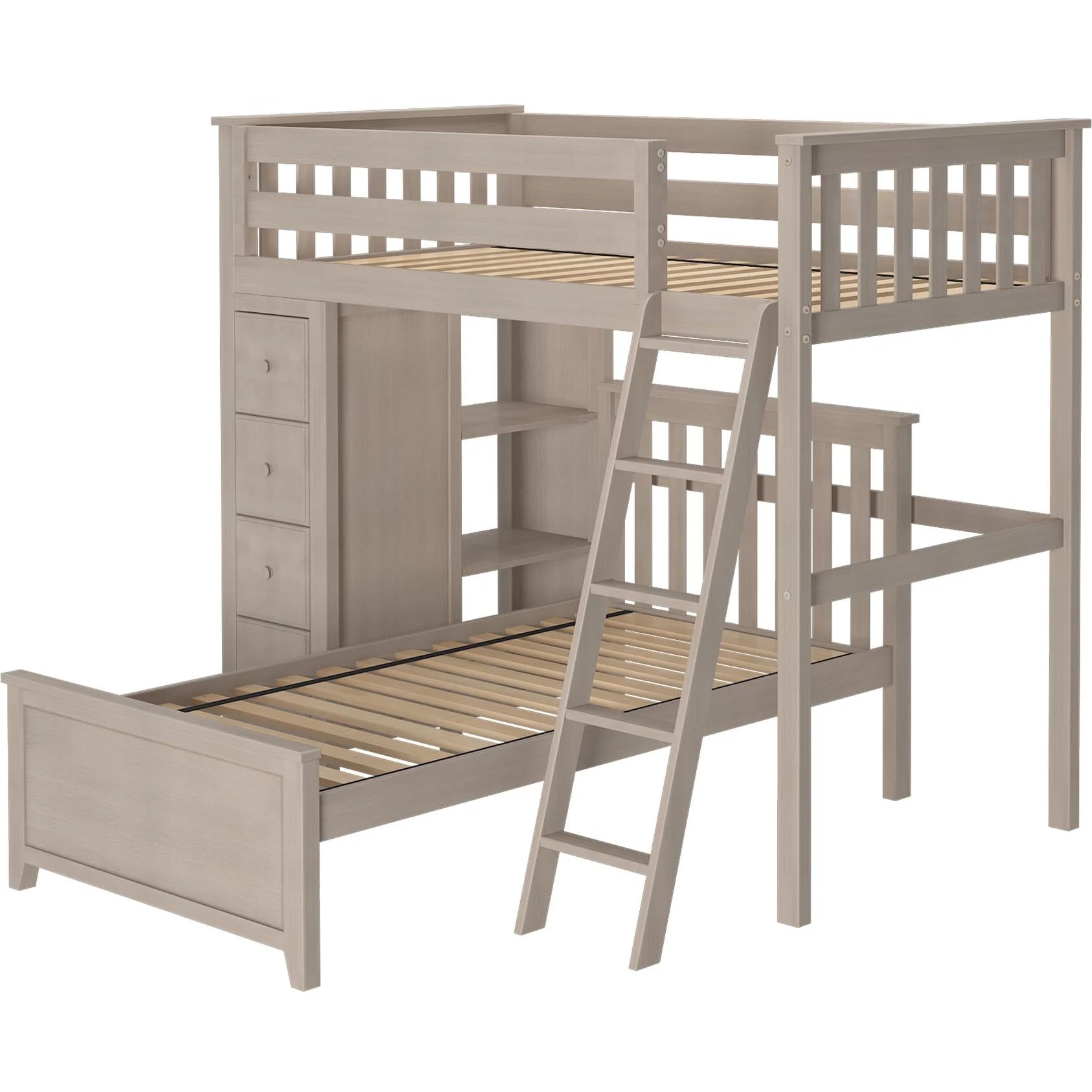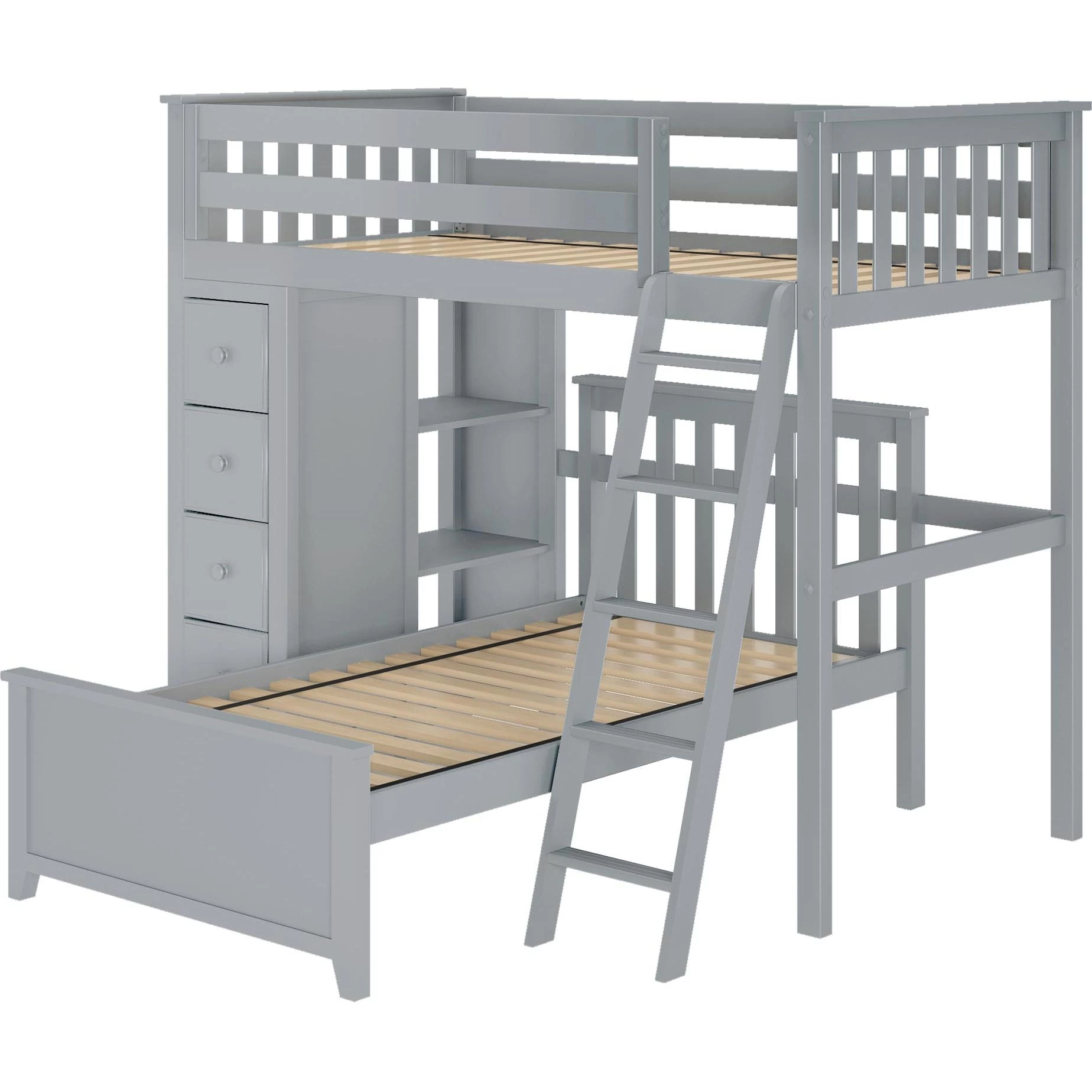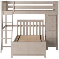 Sleep/Storage Solution – Twin Loft with built-in storage tower with 4 roomy front-facing drawers & 3 book shelves behind it. Twin Bed fits L-Shaped under Loft. Solid knot free Pine construction with flush, color coordinated hardware creates a clean & modern look. Oversized steel hardware ensures solid connections. Each bed tested for 400lb to comfortably sleep kids or adults. Pre-assembled components for fast & easy assembly. 15″ guardrails accommodate standard size mattresses (slat rolls included). Recommended for 8 feet ceiling height above. This bed meets or exceeds federal safety standards. Mattress & Bedside tray sold separately.