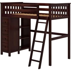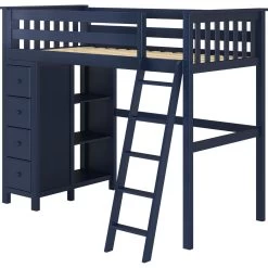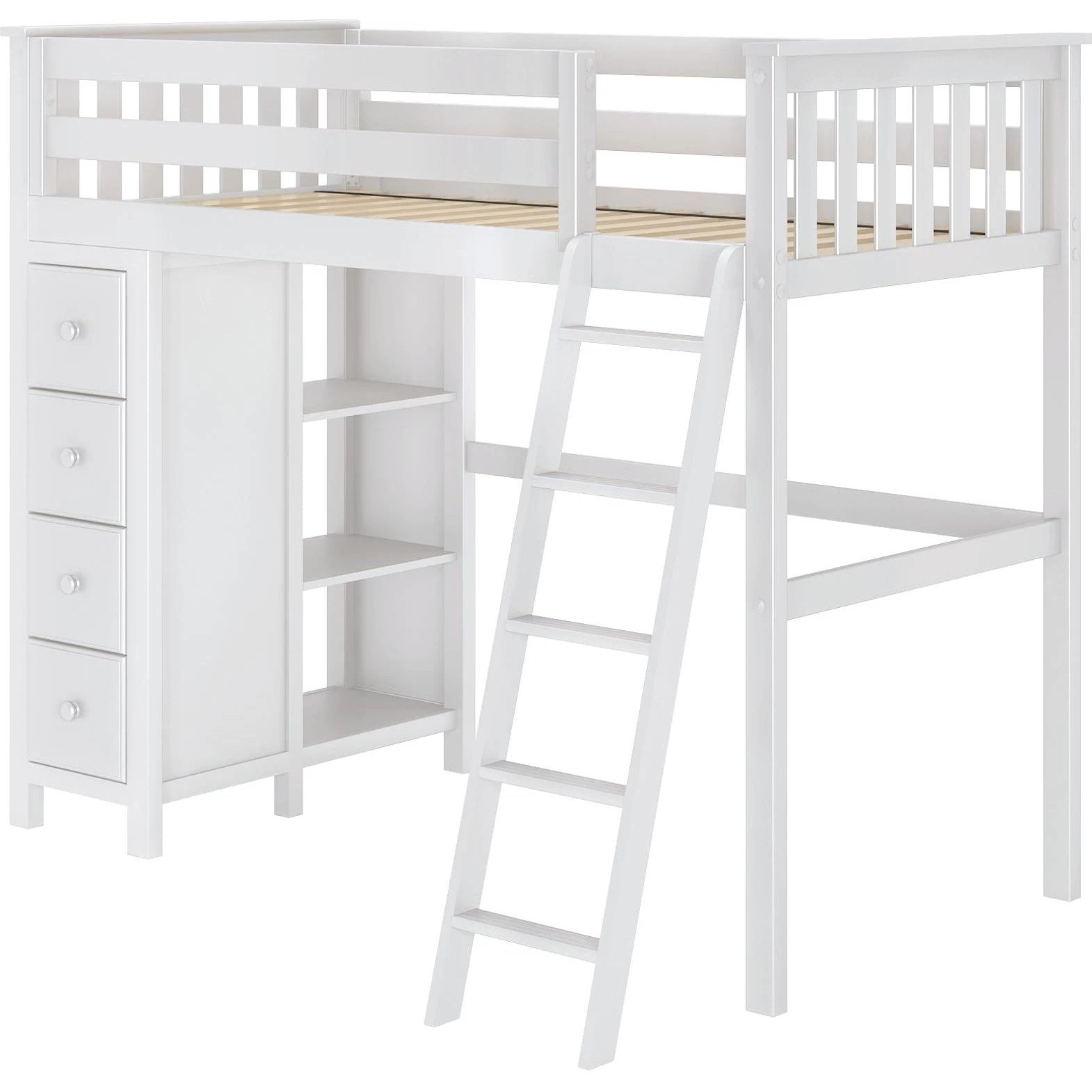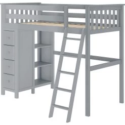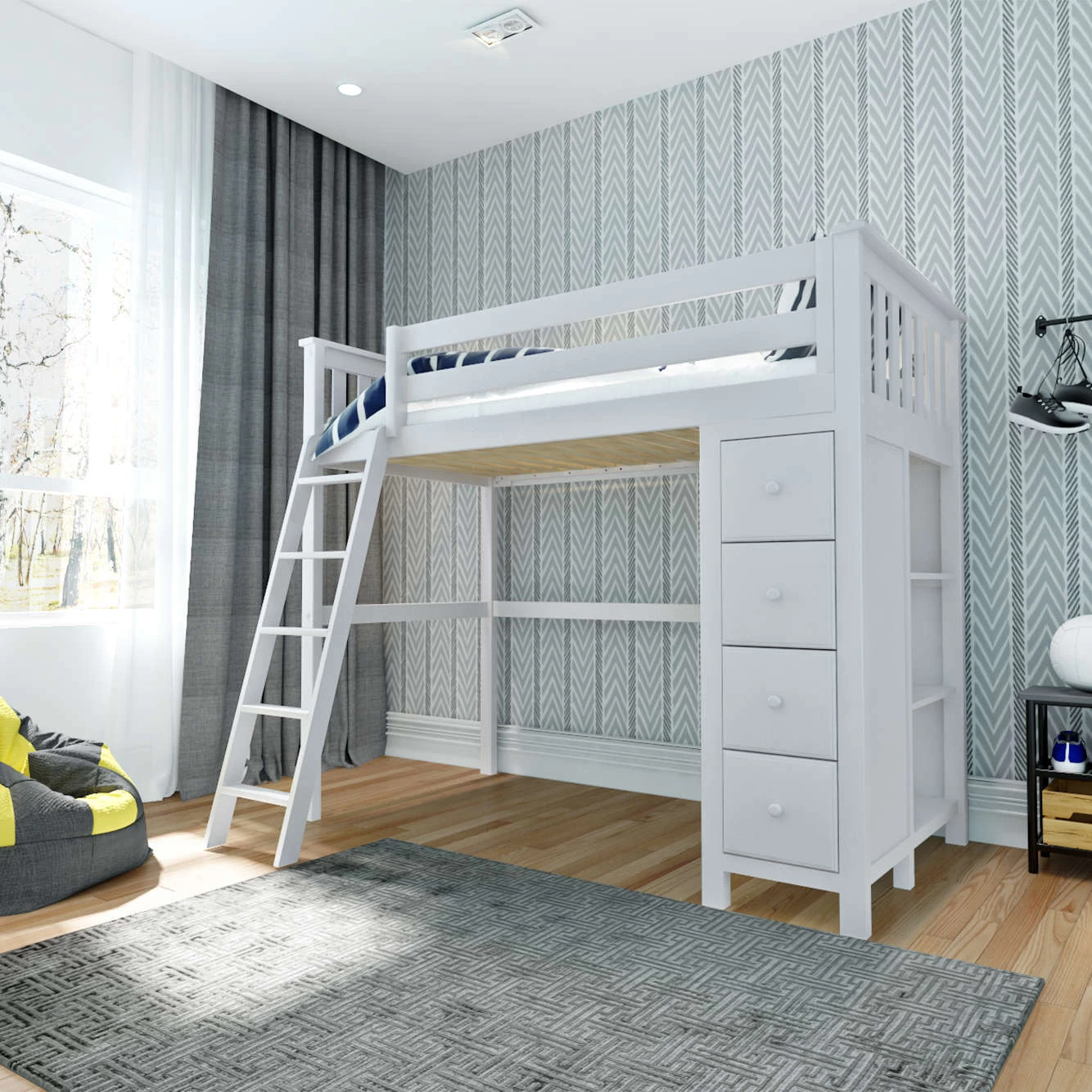 Sleep/Storage Solution – Twin Loft with built-in storage tower with 4 roomy front-facing drawers & 3 book shelves behind it. Solid knot free Pine construction with flush, color coordinated hardware creates a clean & modern look. Oversized steel hardware ensures solid connections. Each bed tested for 400lb to comfortably sleep kids or adults. Pre-assembled components for fast & easy assembly. 15″ guardrails accommodate standard size mattresses (slat rolls included). Recommended for 8 feet ceiling height above. This bed meets or exceeds federal safety standards. Mattress & Bedside tray sold separately.