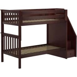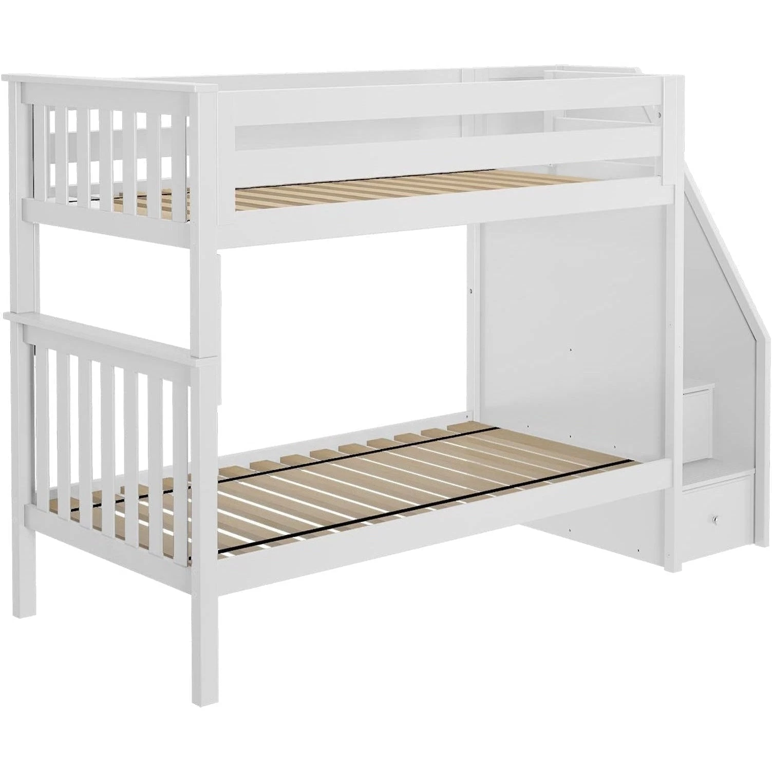 Staircase bunk with built-in storage drawers with dovetail drawer construction & soft close mechanism. Solid knot free Pine construction with flush, color coordinated hardware creates a clean & modern look. Oversized steel hardware ensures solid connections. Pre-assembled components for fast & easy assembly. Top/bottom slat rolls included – no bunkie board required. Each bed tested for 400lb to comfortably sleep kids or adults. With tall 15″ guardrails the bed safely accommodates standard size mattresses. Reversible staircase offers plenty of storage & safe entry. Extra deep bottom drawer (30”)! Recommended for 8 feet ceiling height above. Meets or exceeds federal safety standards. Mattresses, Trundles, Storage Drawers & Vanity panels sold separately.