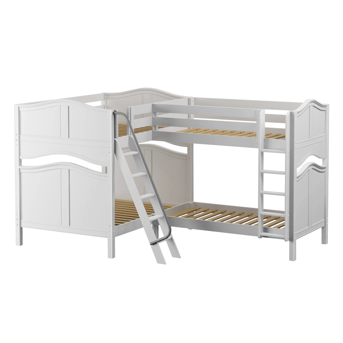 Our high corner bunk is just that! Two high bunk beds connected in a super functional “L” shape, designed to fit perfectly in your bedroom corner.