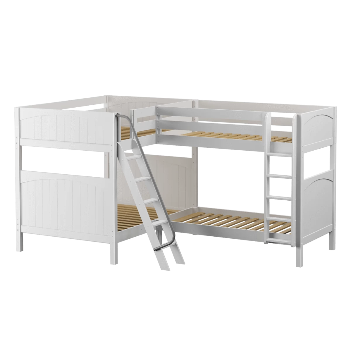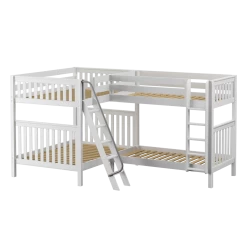 We connected a full size bunk + a twin bunk in an “L” shape to fit perfectly in a bedroom corner. This space-saving design sleeps 4 (or more!), making it the perfect solution for a shared bedroom or vacation home. Easy-to-climb, solid wood ladders on each end for dual access points. Patented Rock Lock system keeps stacked beds super sturdy and secure.
