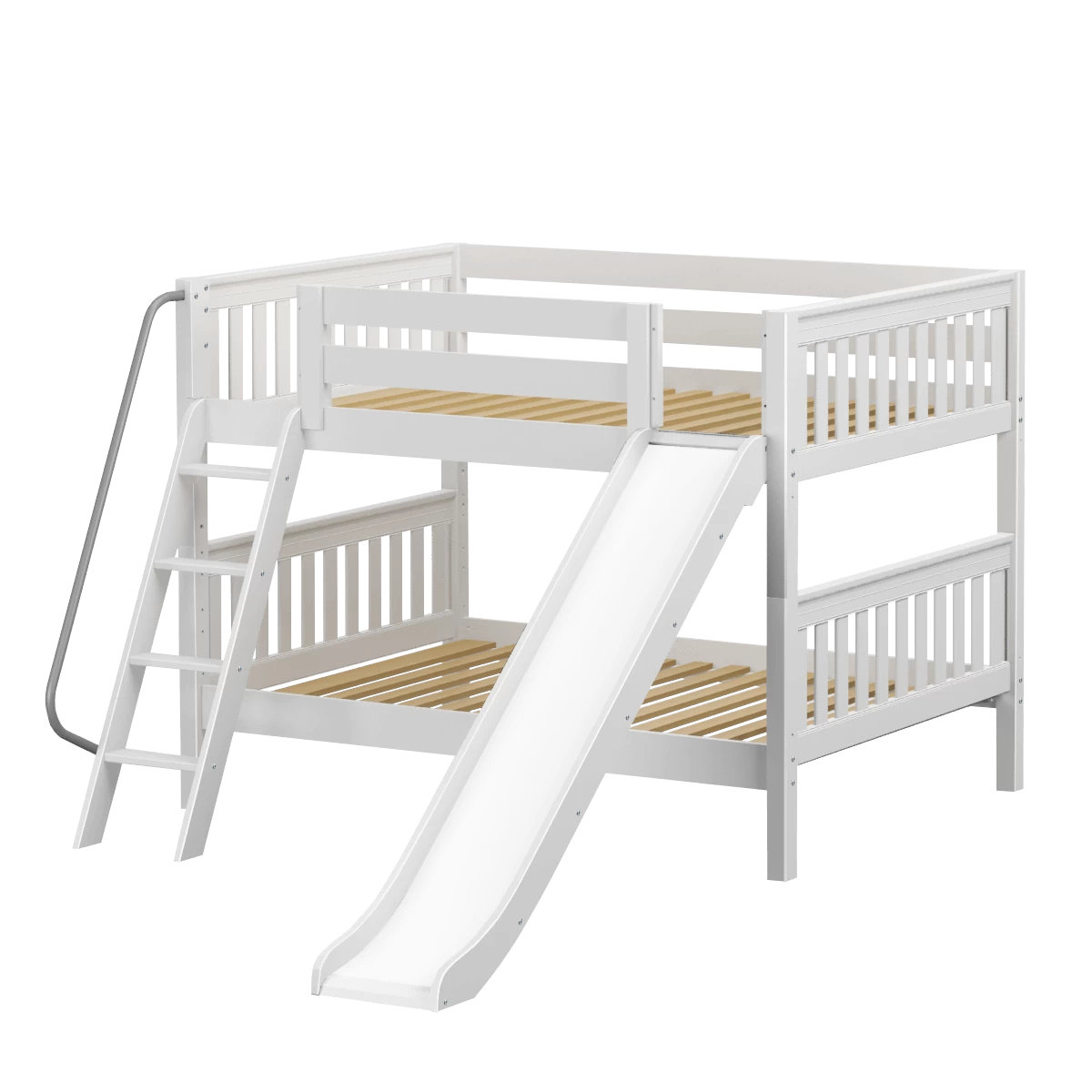 Our classic low bunk gets an extra dose of fun with the addition of a slide! Stacked design sleeps two comfortably – low height is perfect for small rooms and little ones. Full size = extra room for growing kids, sleepovers or snuggling with parents.
