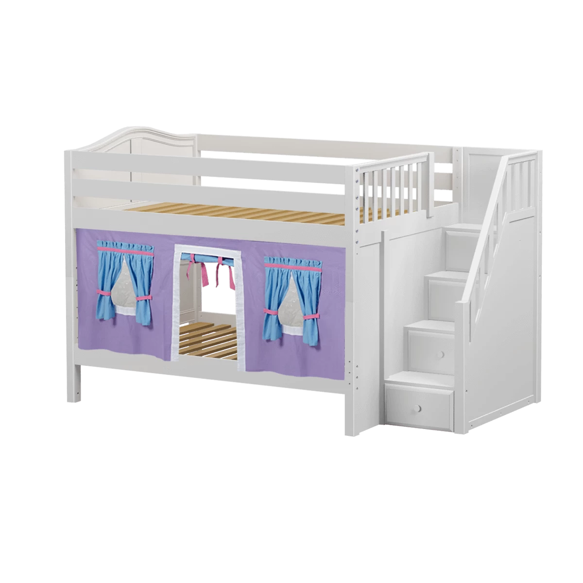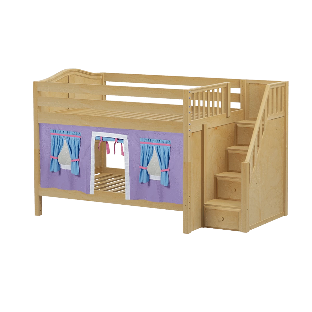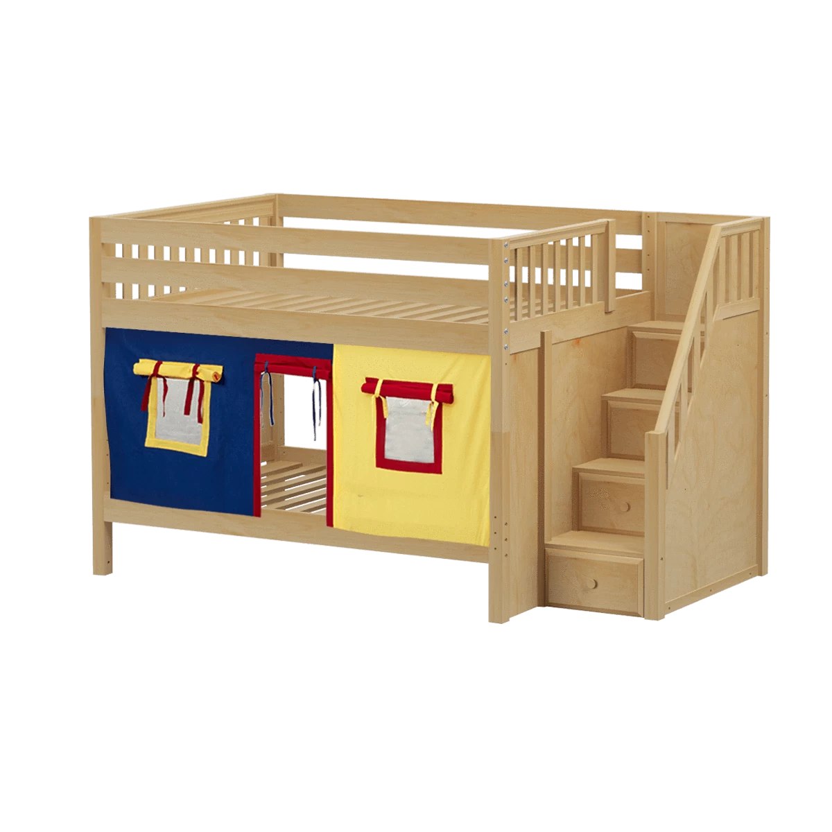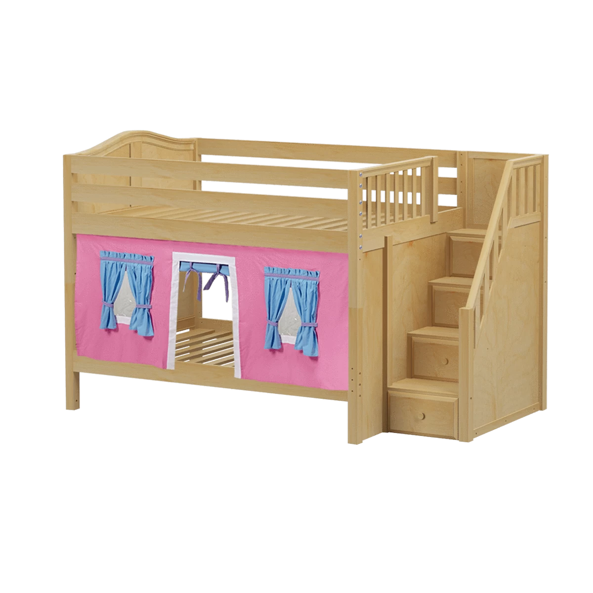 Colorful curtains turn up the fun on our full-size low bunk + staircase! Stacked design sleeps two comfortably – low height is perfect for small rooms and little ones. Stairs are a safe way to climb into bed, plus each step doubles as a drawer for built in storage.