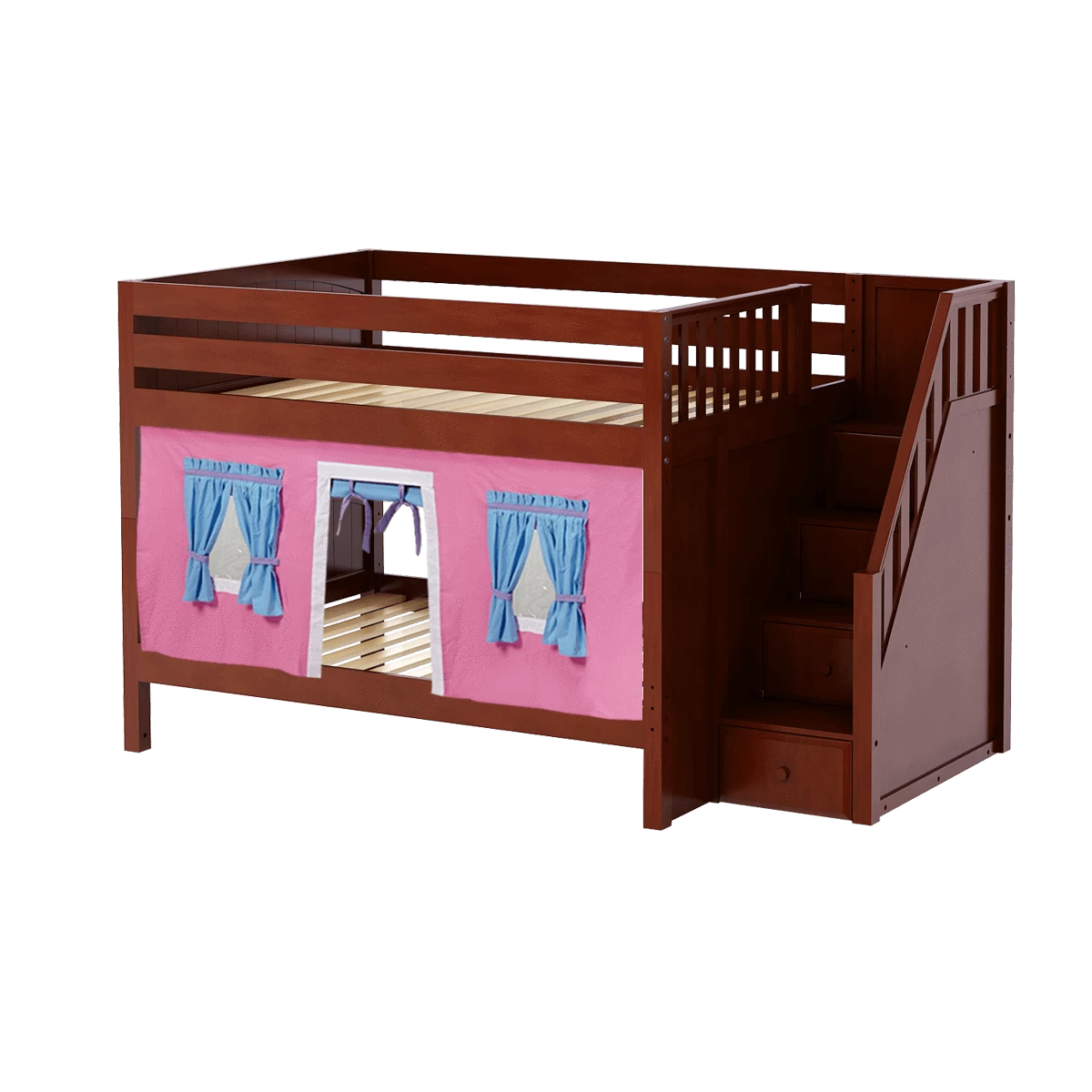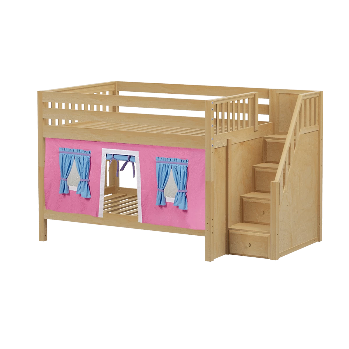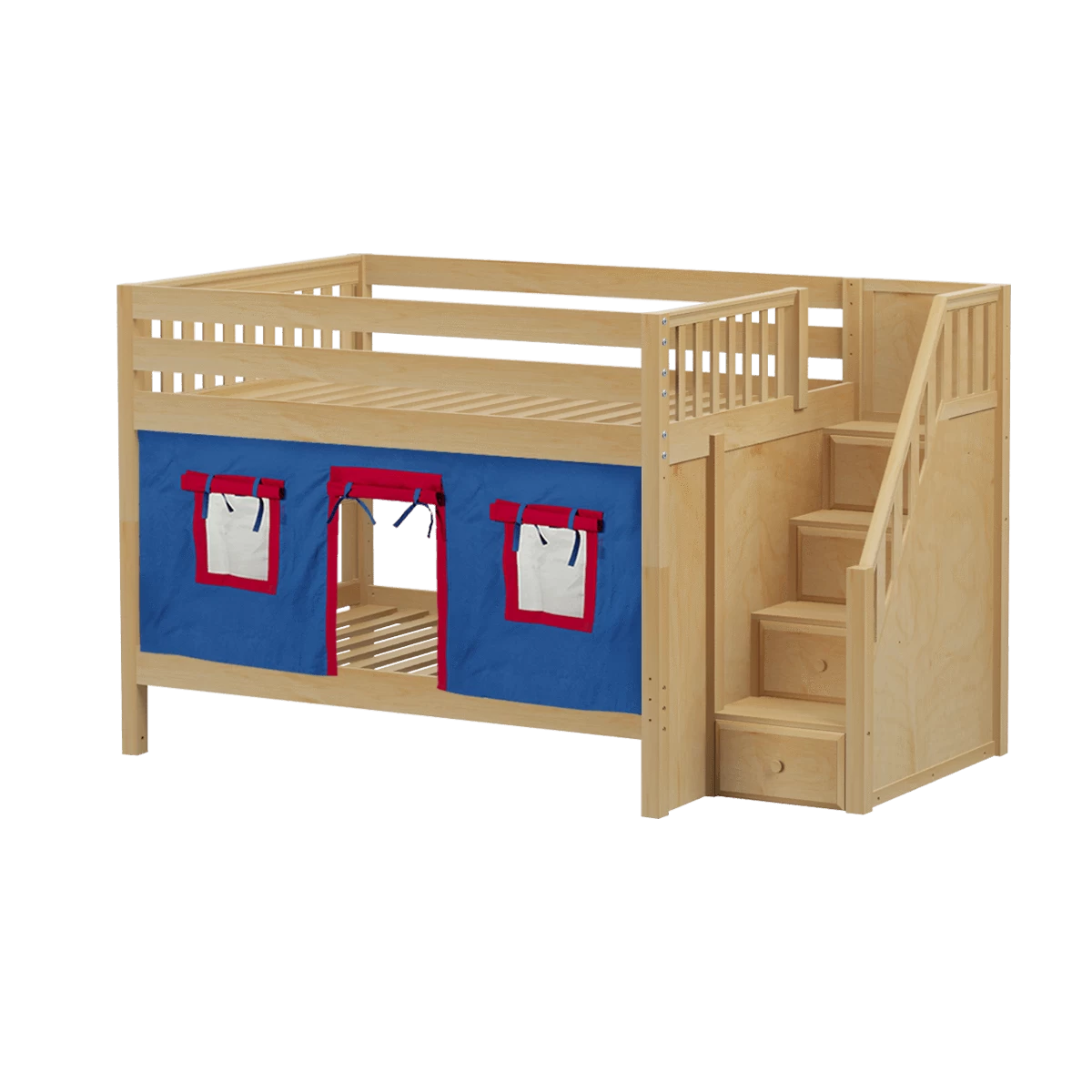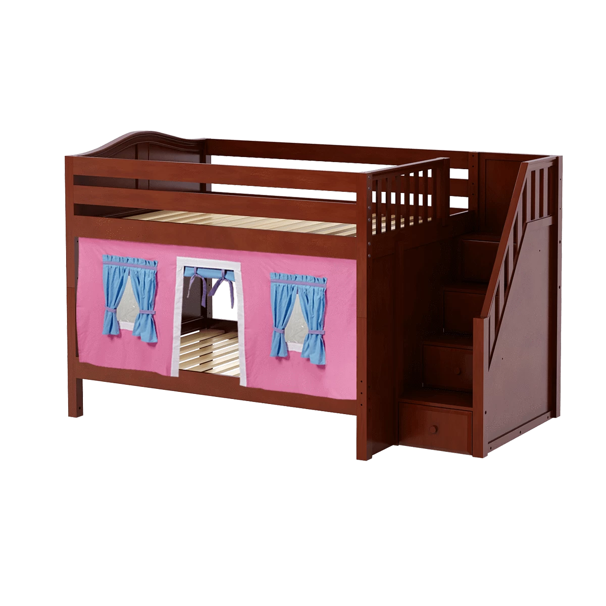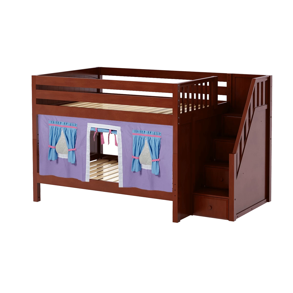 Colorful curtains turn up the fun on our full-size low bunk + staircase! Stacked design sleeps two comfortably – low height is perfect for small rooms and little ones. Stairs are a safe way to climb into bed, plus each step doubles as a drawer for built in storage.