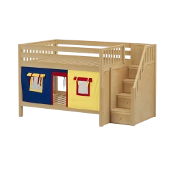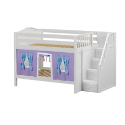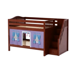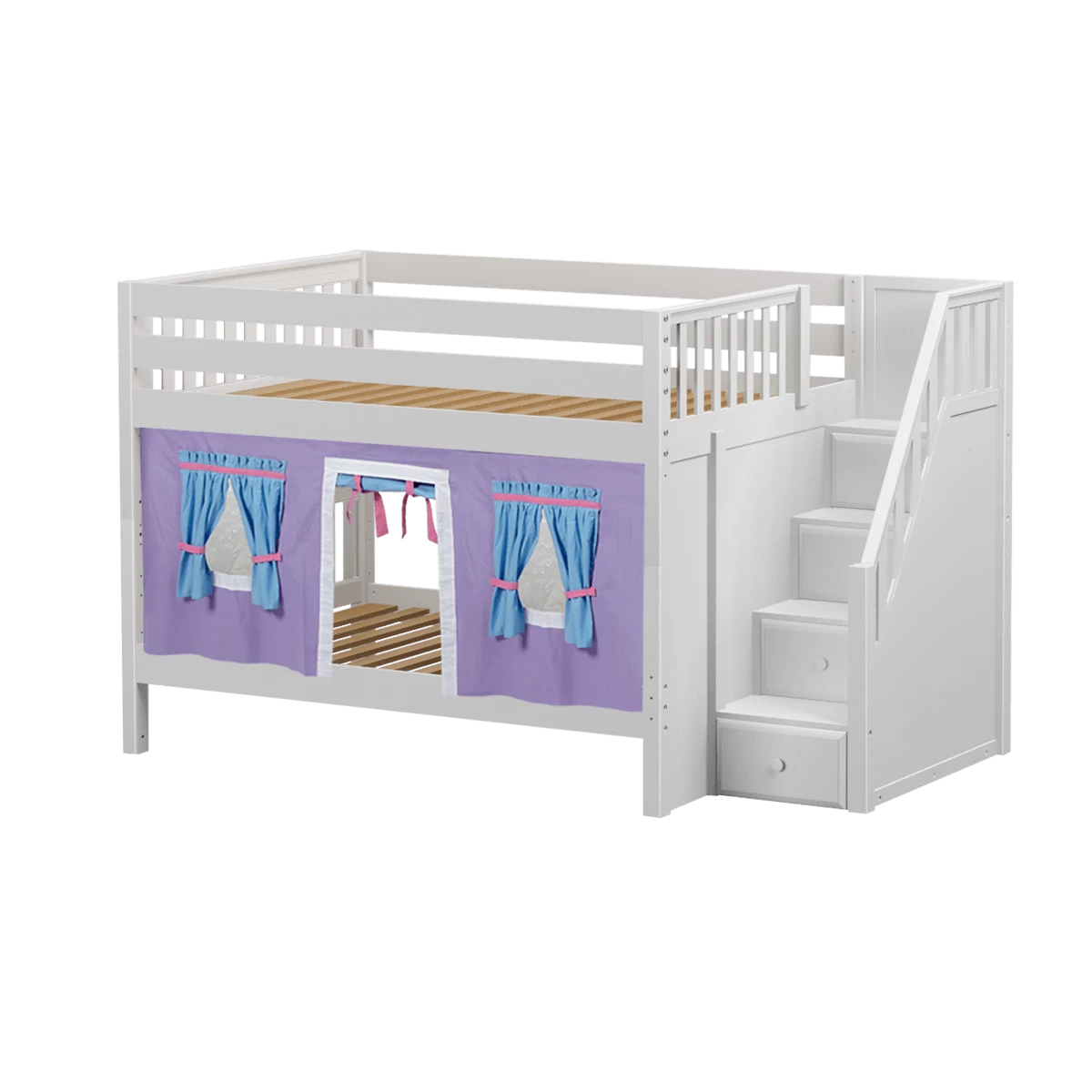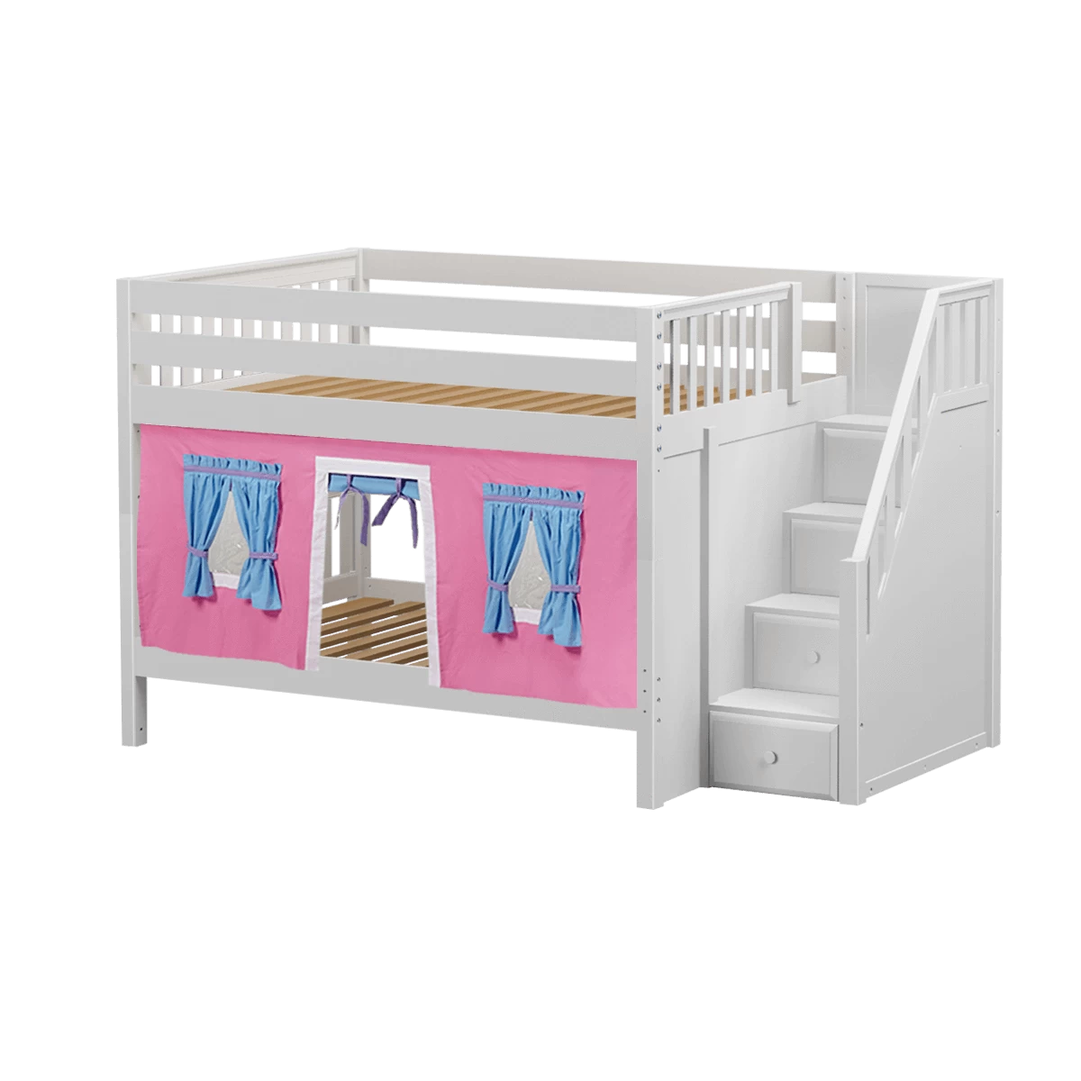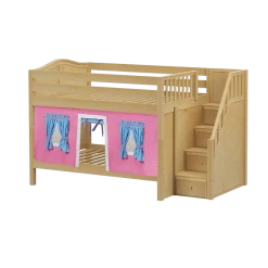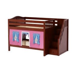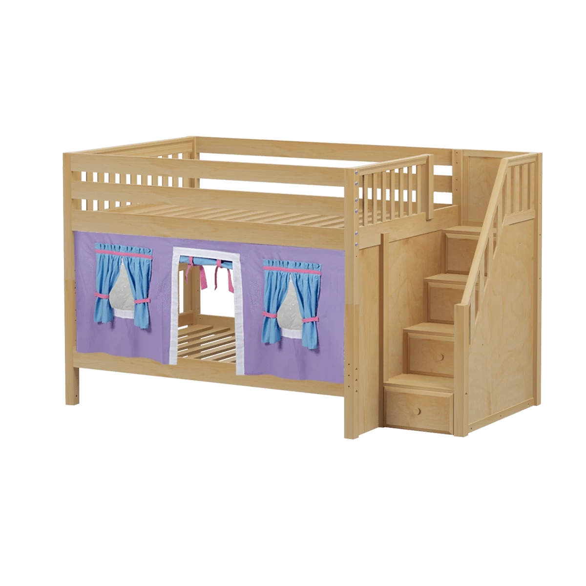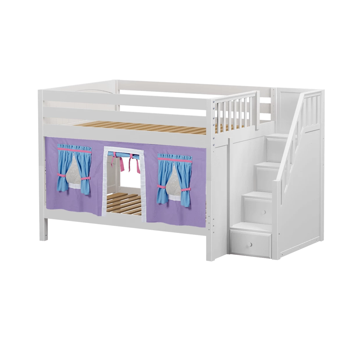 Colorful curtains turn up the fun on our full-size low bunk + staircase! Stacked design sleeps two comfortably – low height is perfect for small rooms and little ones. Stairs are a safe way to climb into bed, plus each step doubles as a drawer for built in storage.