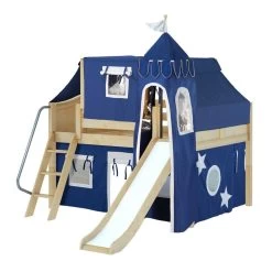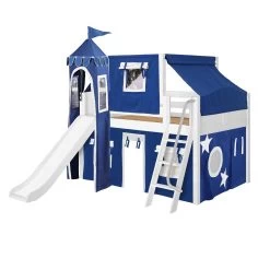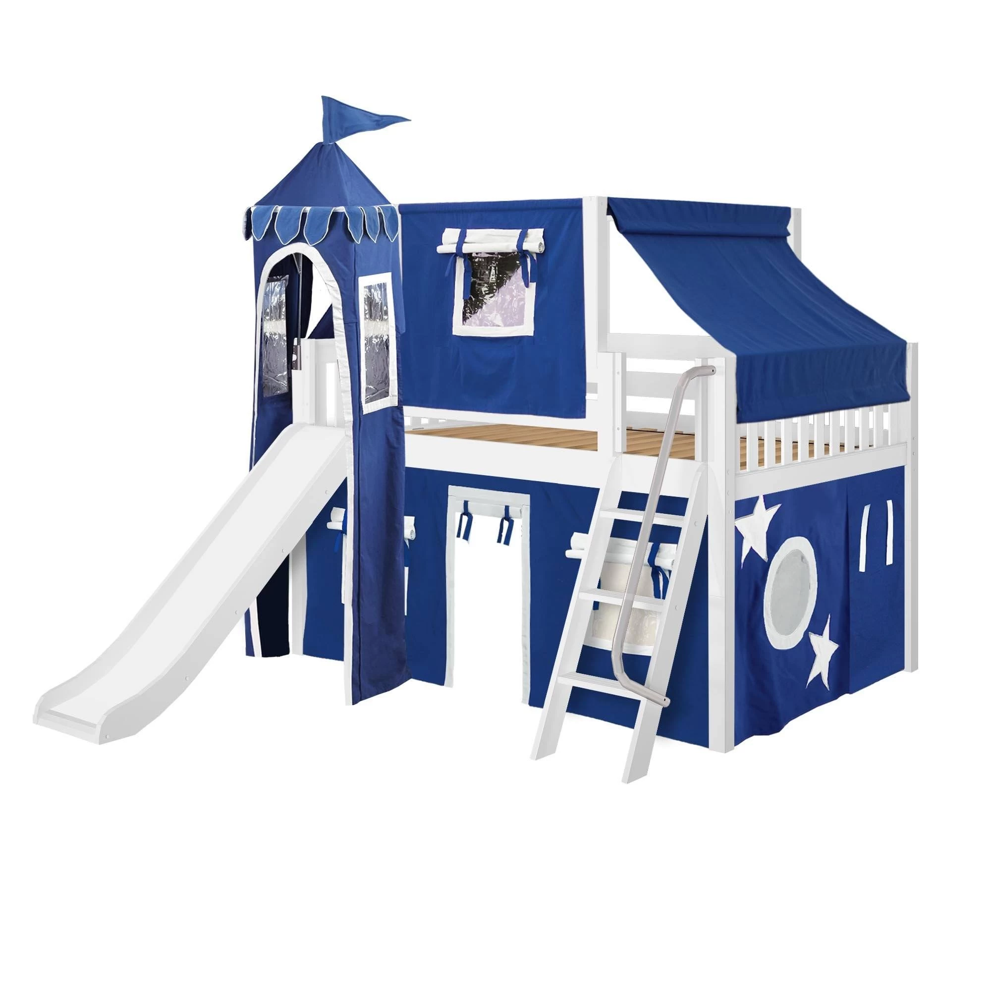 Maxtrix Full Low Loft Bed With Angled Ladder, Curtain, Top Tent, Tower + Slide