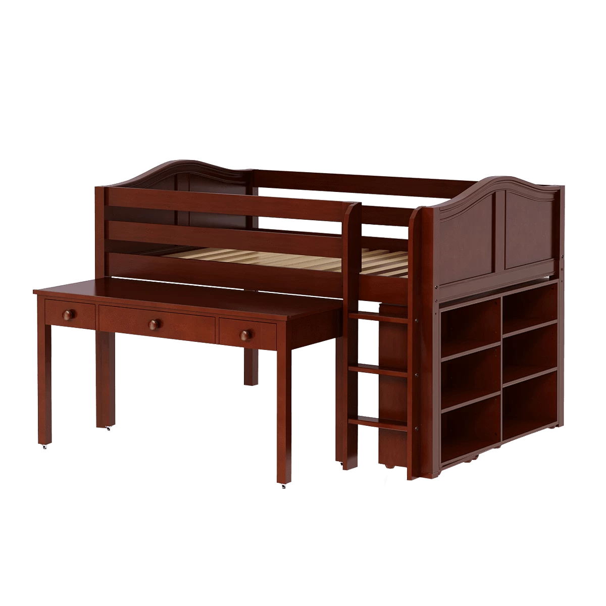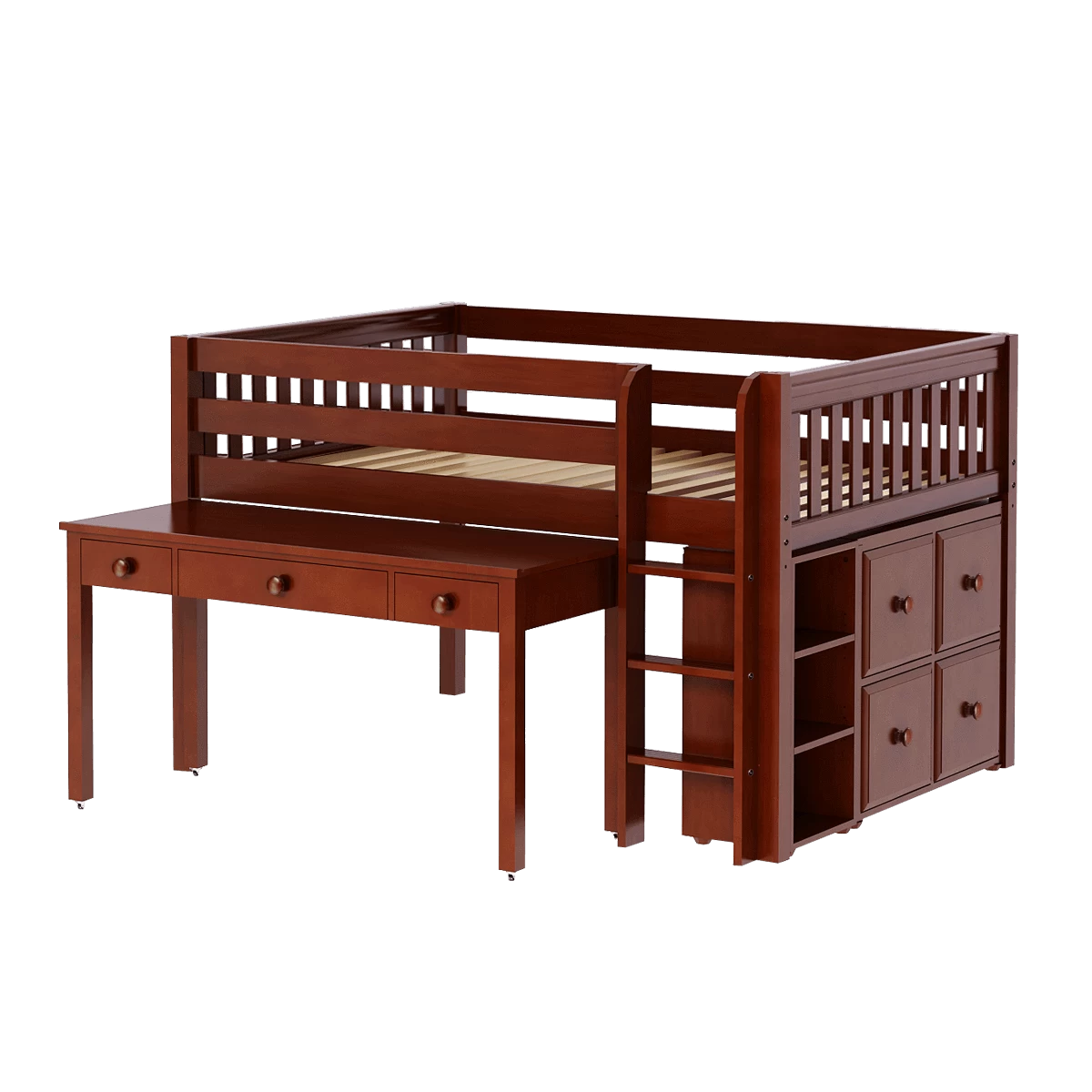 Our full-size low loft bed with straight ladder becomes the ultimate storage + study cube! Long desk with tilt top and drawers = plenty of space for schoolwork or arts and crafts. Matching case goods designed to fit perfectly underneath. Each piece is freestanding so you can also use separately.