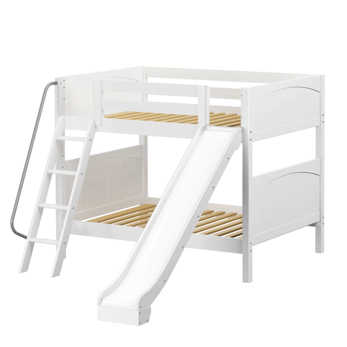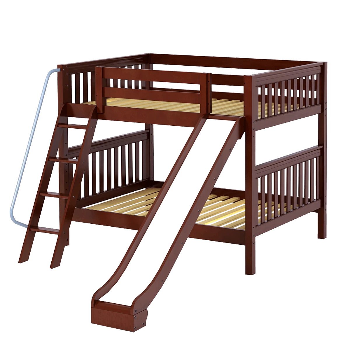 We added a slide to our best-selling style for the ultimate combination of fun and function. Full size = extra room for growing kids, sleepovers or snuggling with parents. Medium height bunk designed with more space between beds, but still safe enough little ones + fits average ceilings.