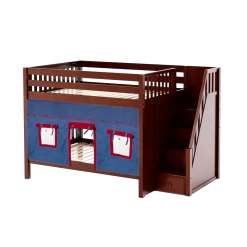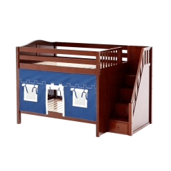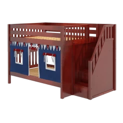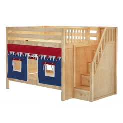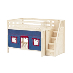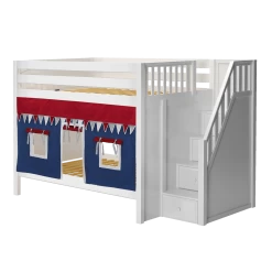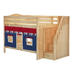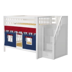 Our medium bunk with staircase gets a super fun makeover when we add colorful curtains! Stairs are a safe way to climb into bed, plus steps double storage drawers. Full size = extra room for growing kids, sleepovers or snuggling with parents.