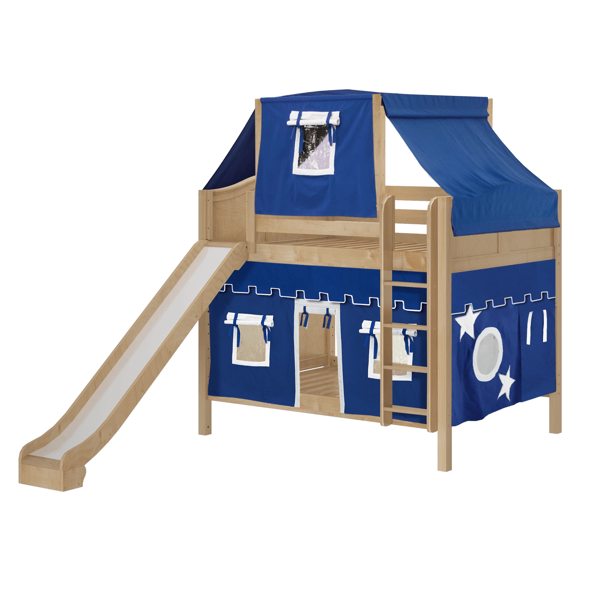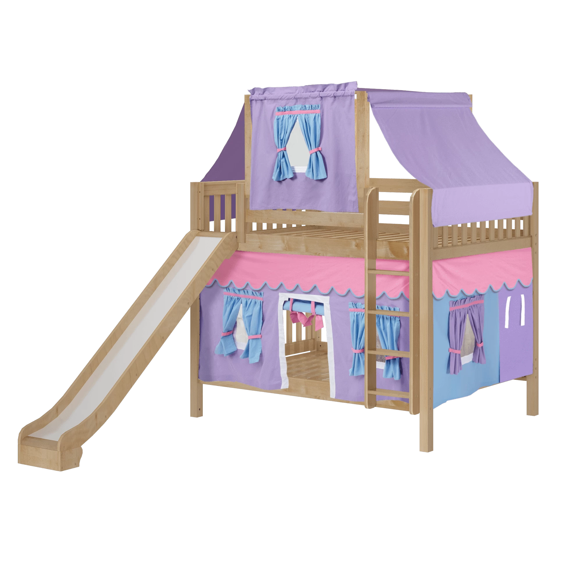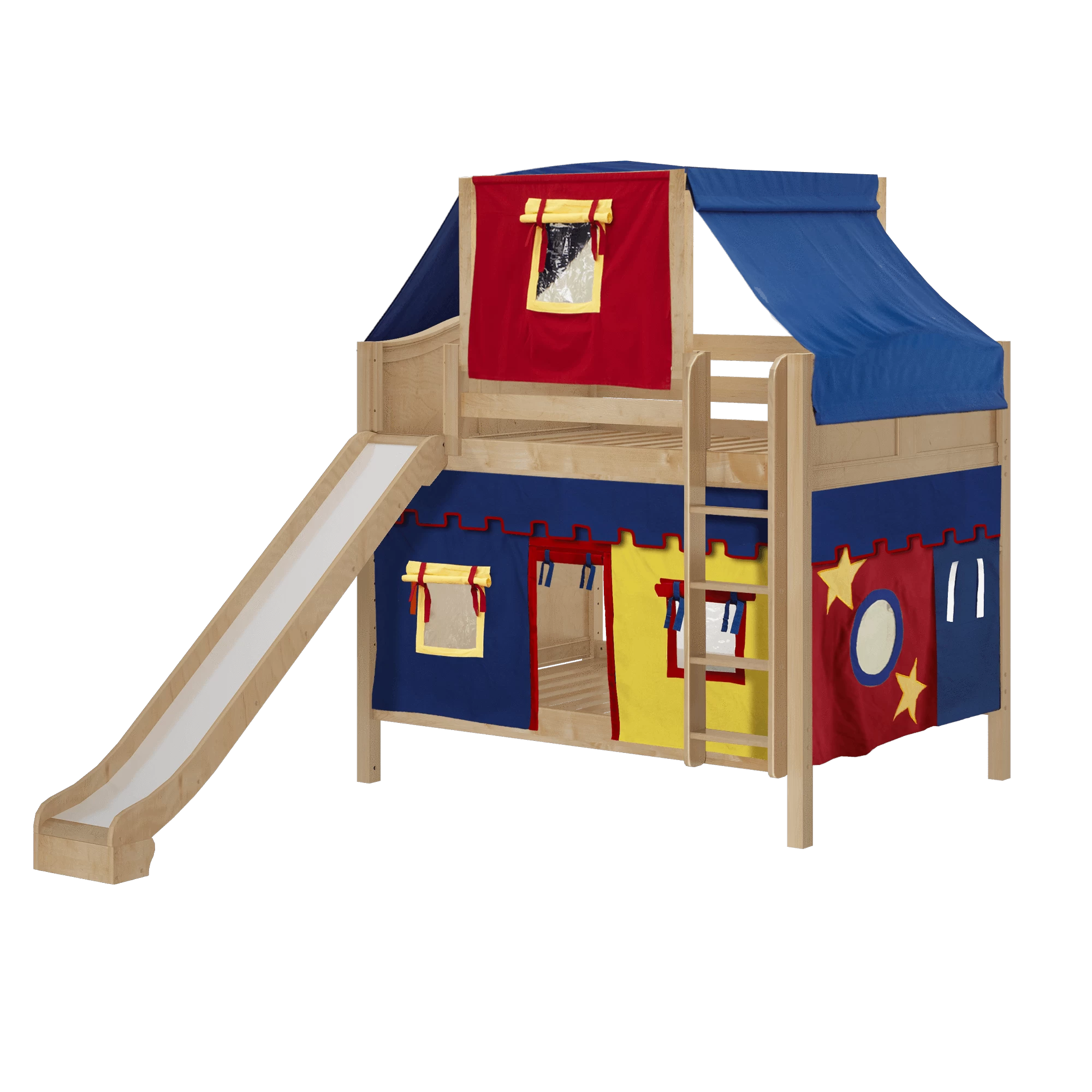 Colorful fabrics + slide turns our best-selling style into a bunk bed built for fun. Climb up straight ladder then take the slide back down. Medium bunk offers more space between top and bottom. Full size = extra room for growing kids, sleepovers or snuggling.