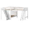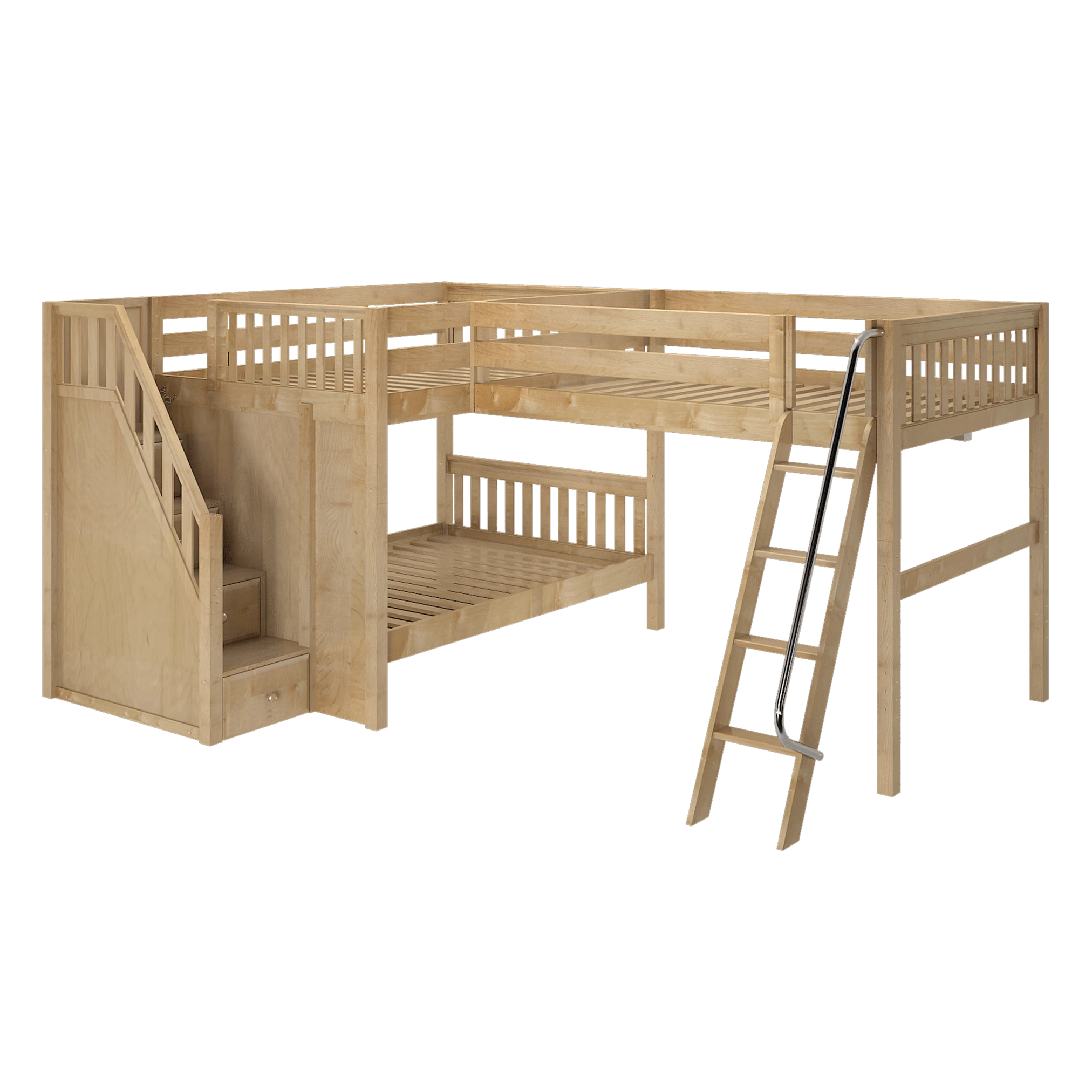 Sleep 3 without sacrificing all of your floorspace! We combined a full-size bunk bed + twin-size loft bed in a unique “L” shape that fits perfectly in the bedroom corner. Staircase is safe and easy to climb, plus each step doubles as a storage drawer. Full size = extra room for growing kids, sleepovers or snuggling.