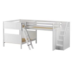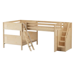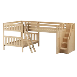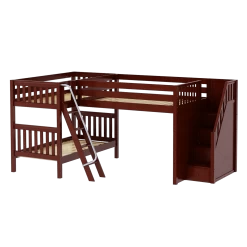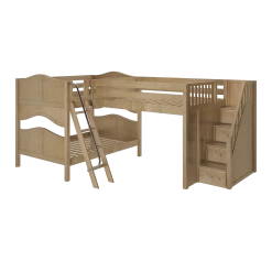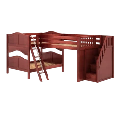 Our corner loft bunk is just that – two full size beds stacked on one side connected to a single twin size raised bed on the other. The result is a super functional “L” shape that fits perfectly in your bedroom corner.