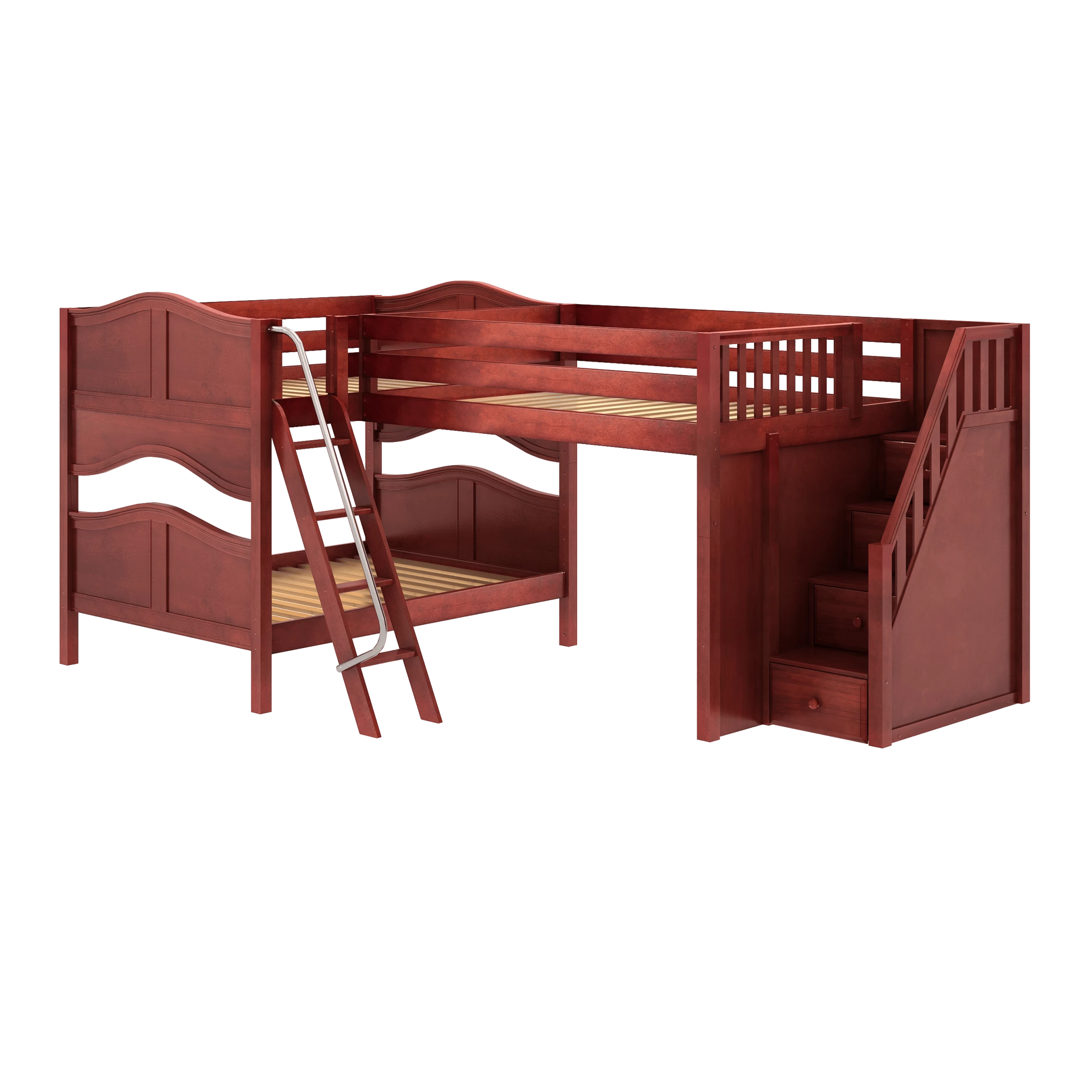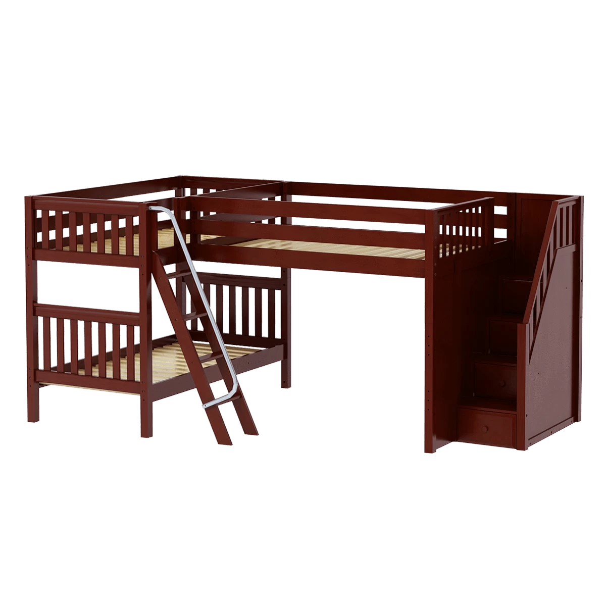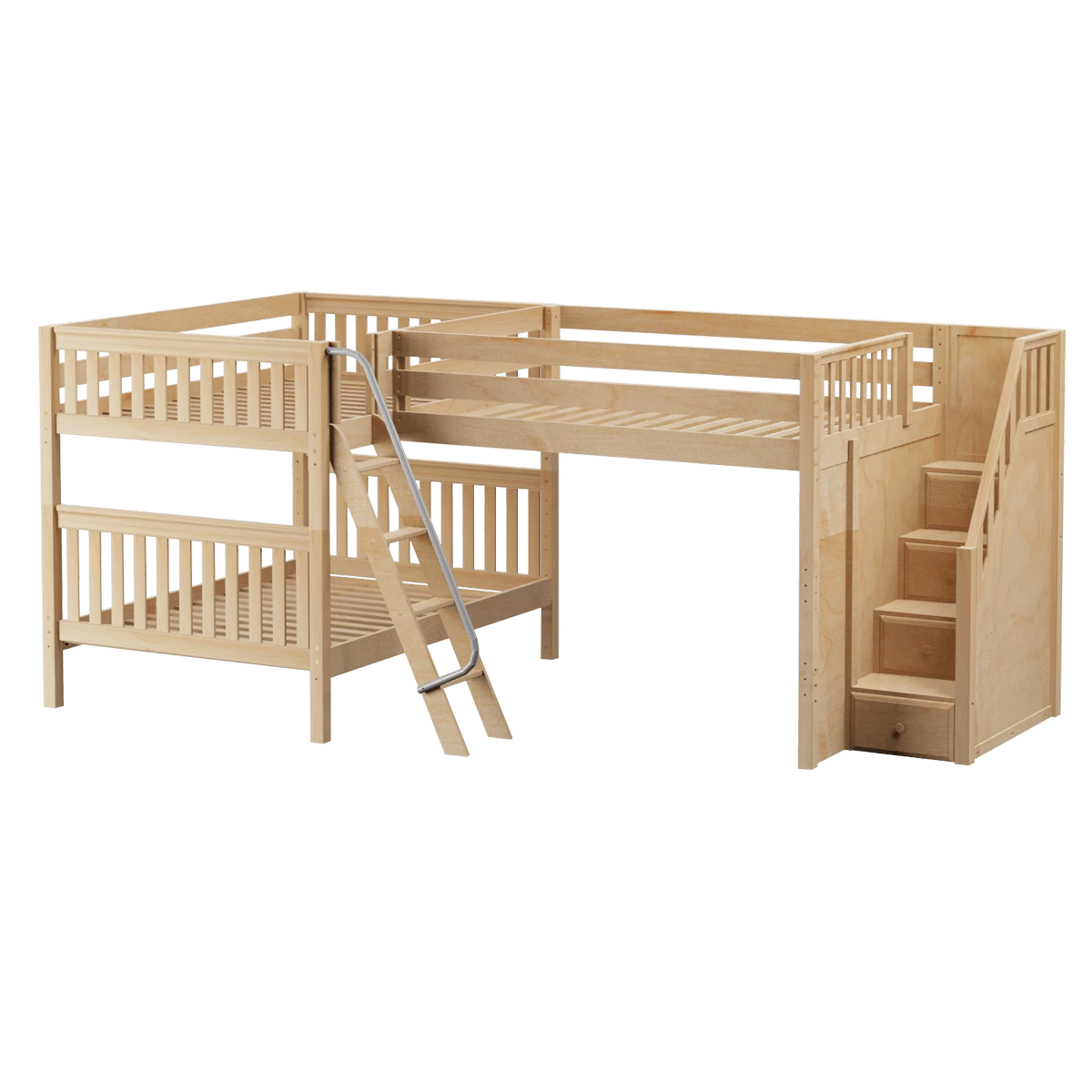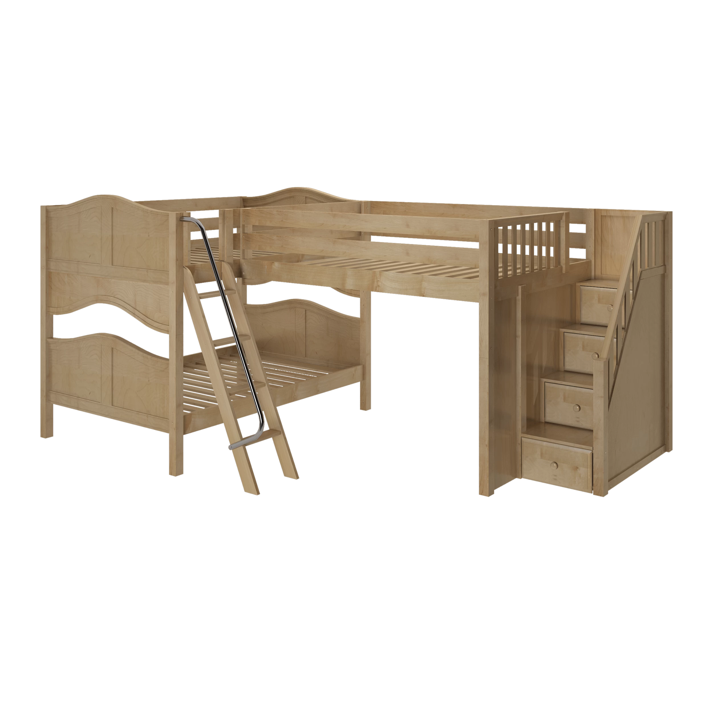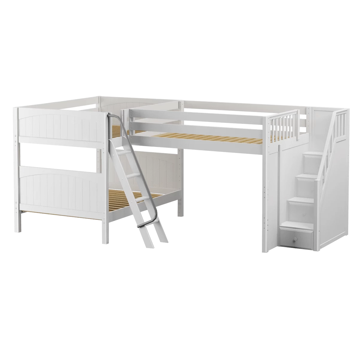 Sleep 3 without sacrificing all of your floorspace! We combined a full-size bunk bed + twin-size loft bed in a unique “L” shape that fits perfectly in the bedroom corner. Staircase is safe and easy to climb, plus each step doubles as a storage drawer. Full size = extra room for growing kids, sleepovers or snuggling.
