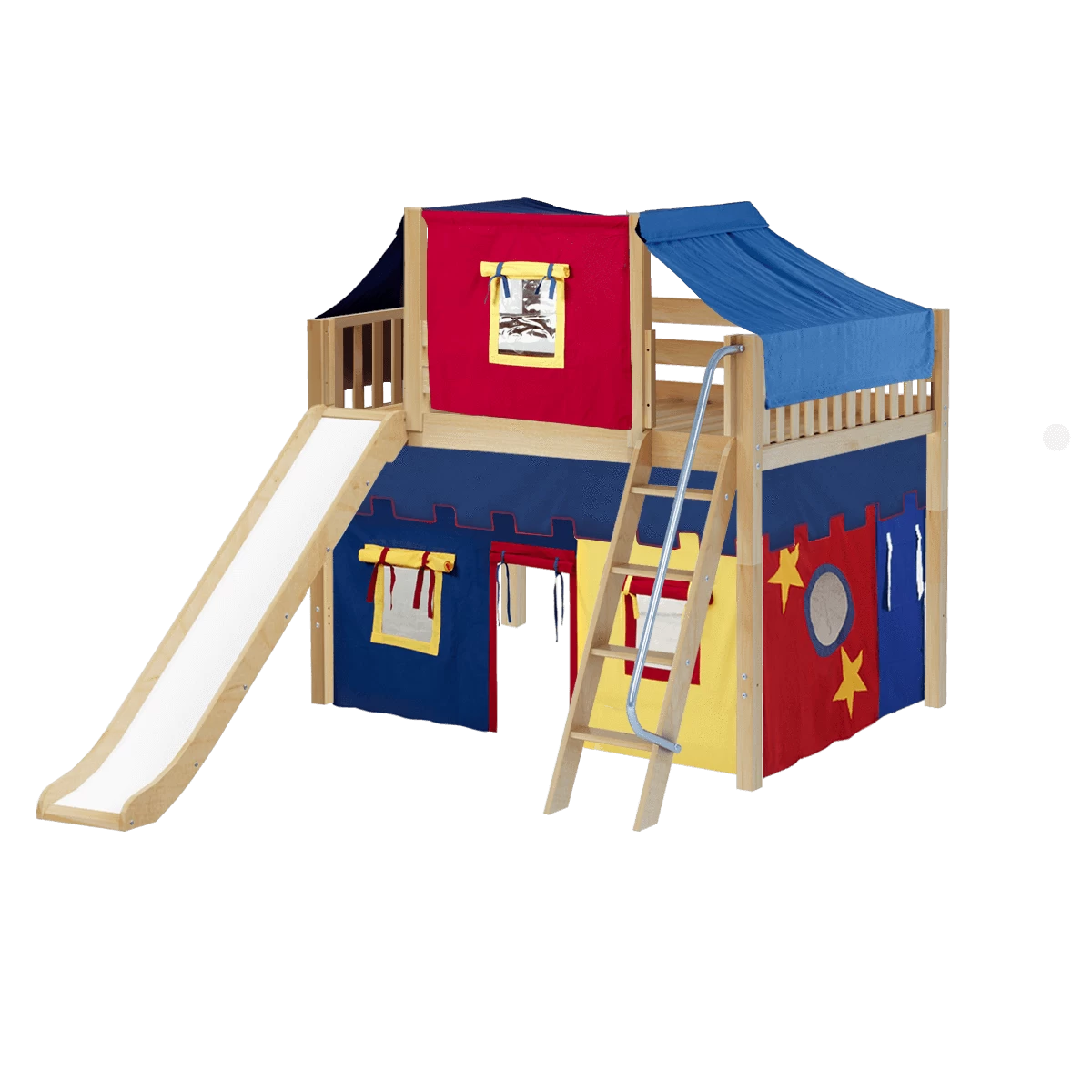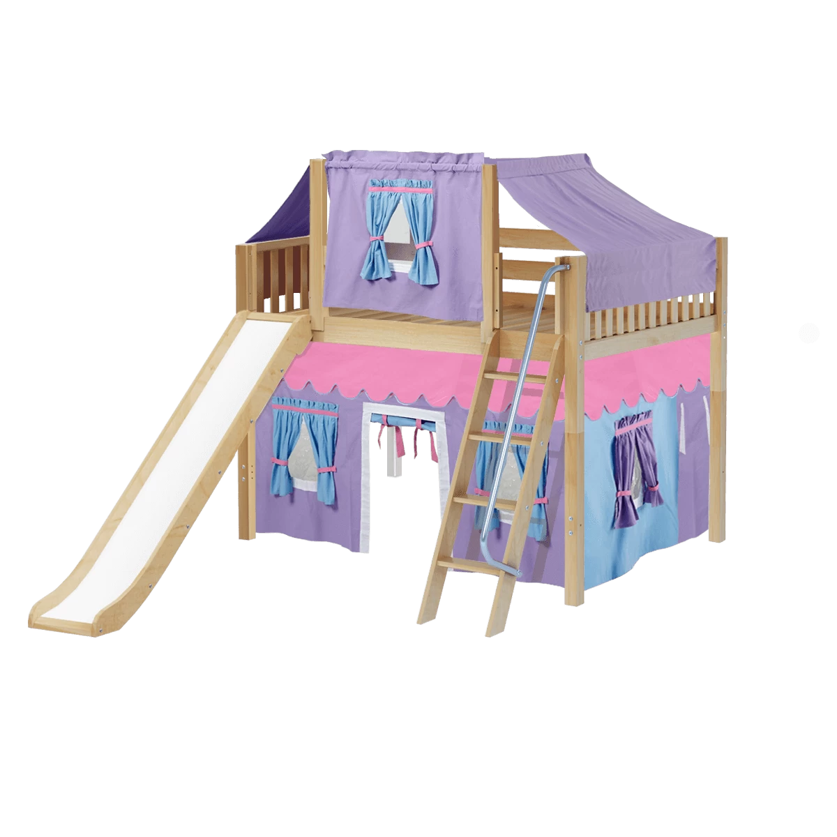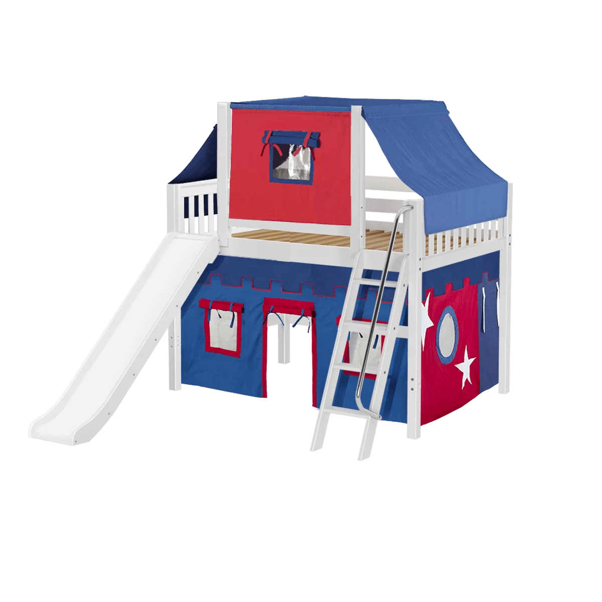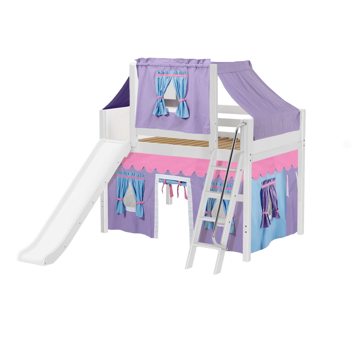 Our classic mid loft gets an extra dose of fun with the addition of colorful fabrics and a slide. Curtains + matching top tent will inspire your child’s imagination during the day, then help them sleep soundly at night. Full size = extra room for growing kids, sleepovers or snuggling.