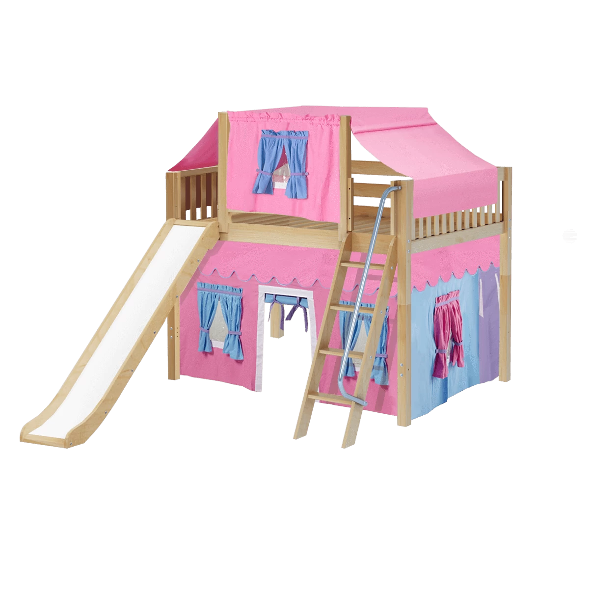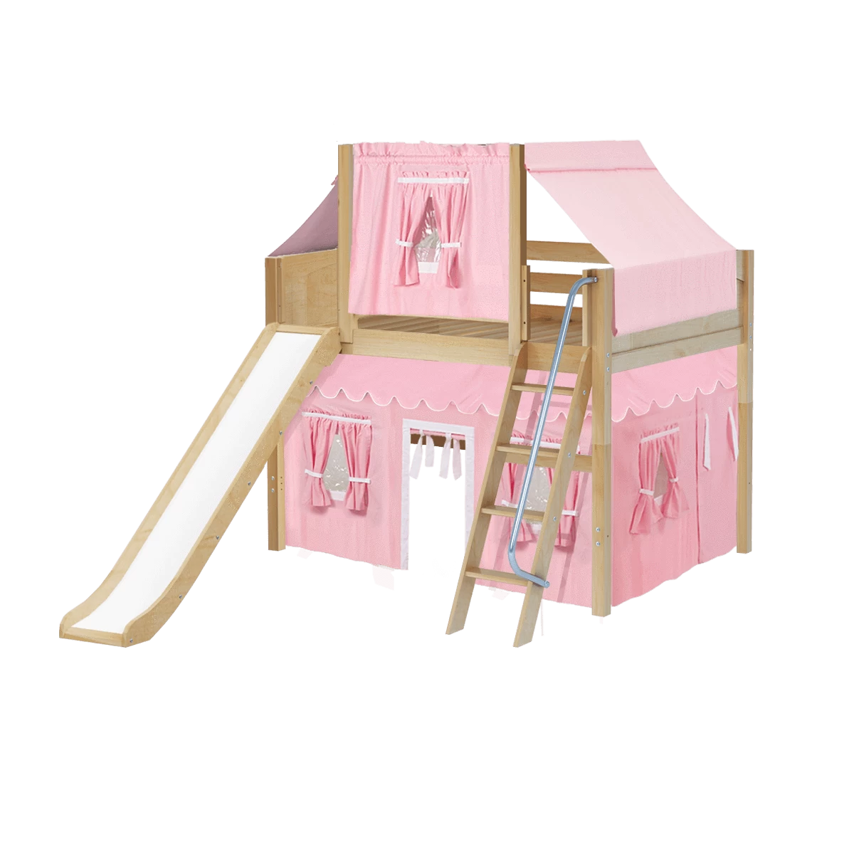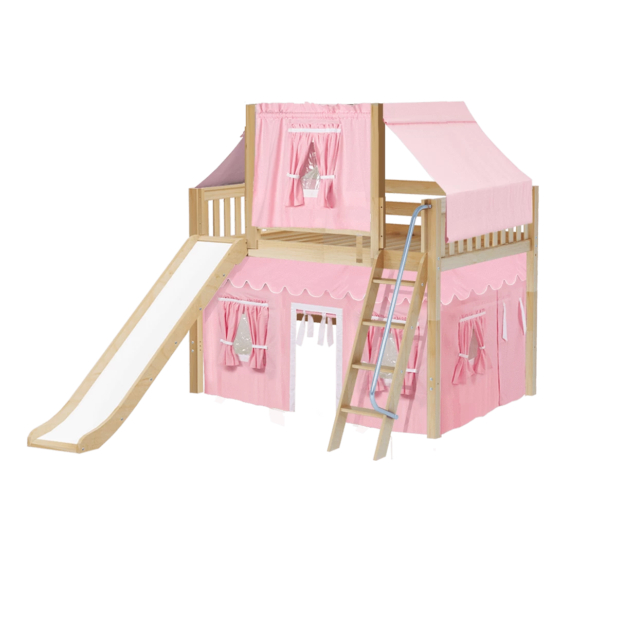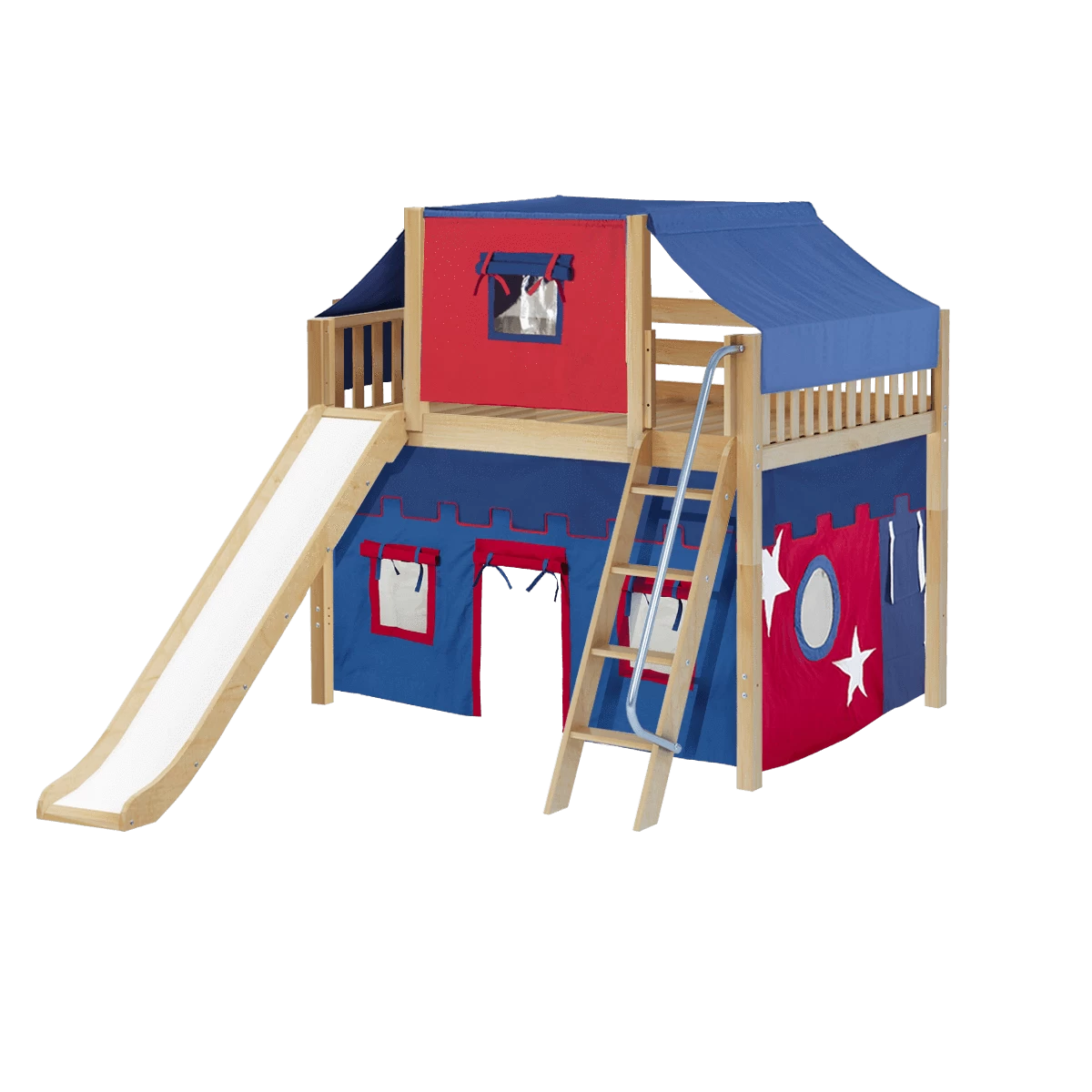 Our classic mid loft gets an extra dose of fun with the addition of colorful fabrics and a slide. Curtains + matching top tent will inspire your child’s imagination during the day, then help them sleep soundly at night. Full size = extra room for growing kids, sleepovers or snuggling.