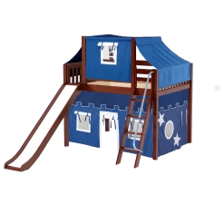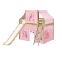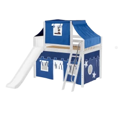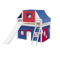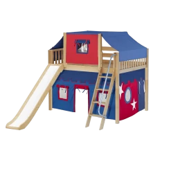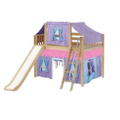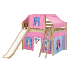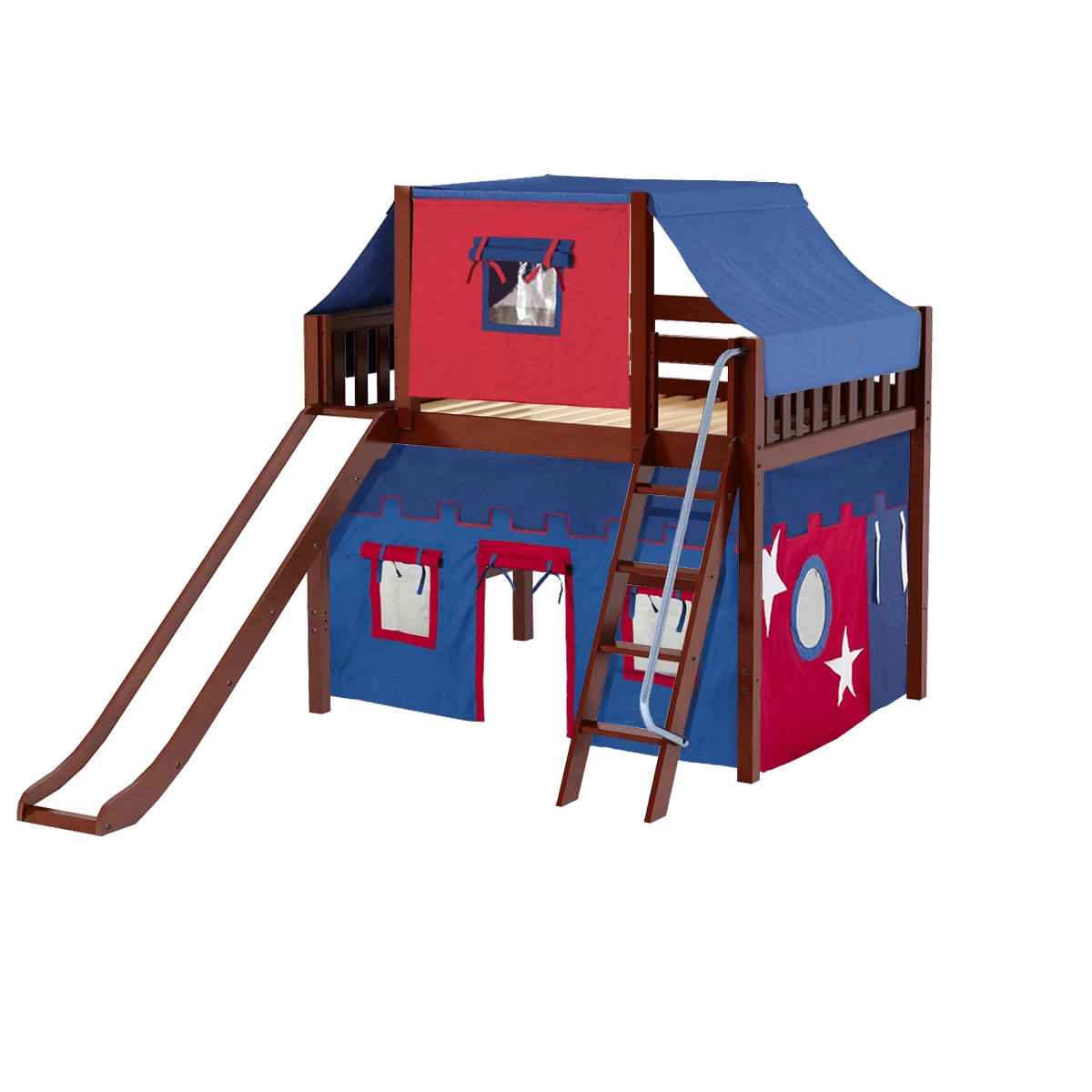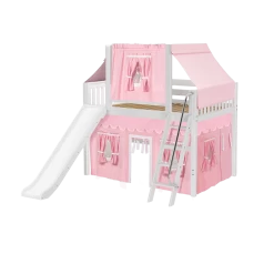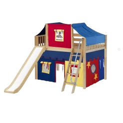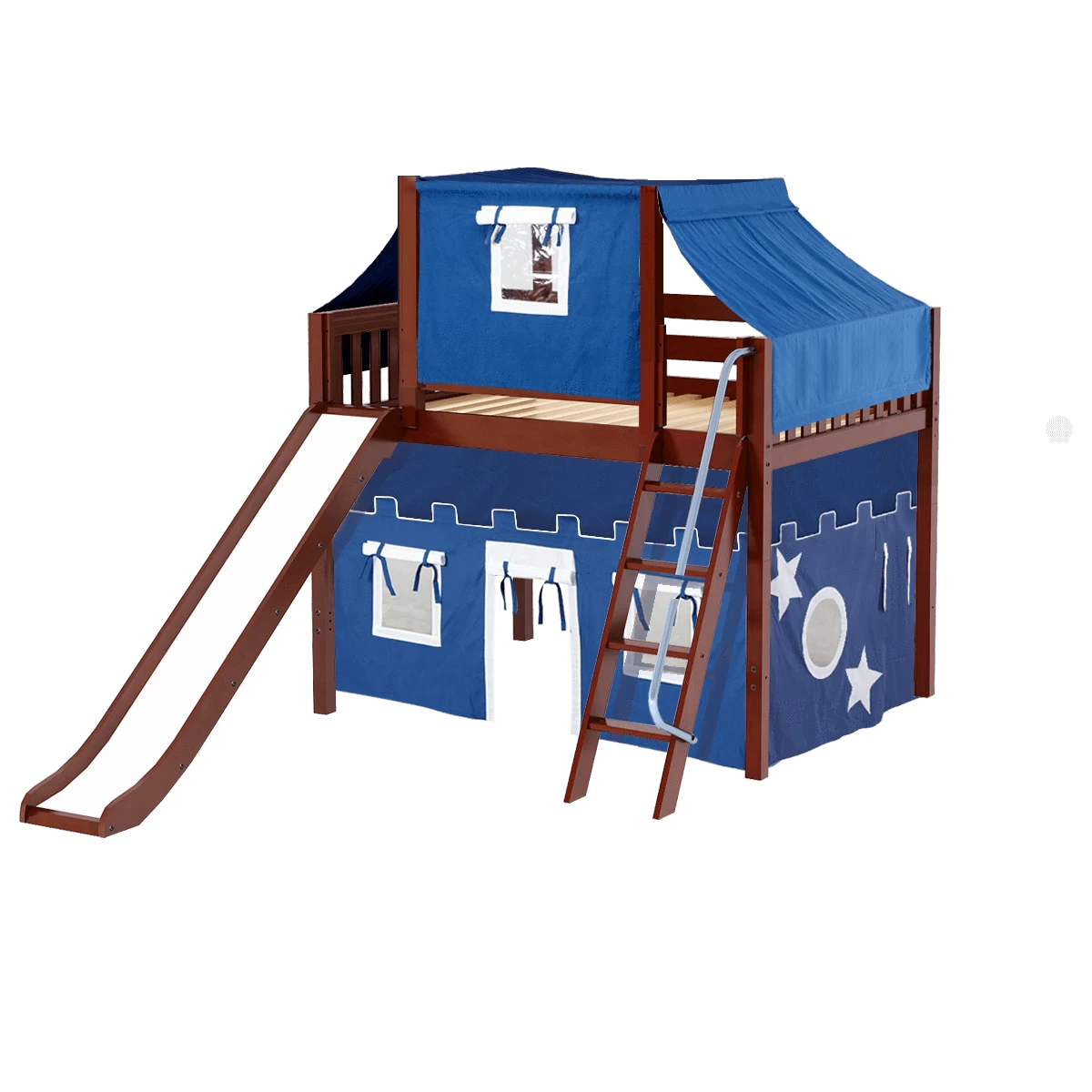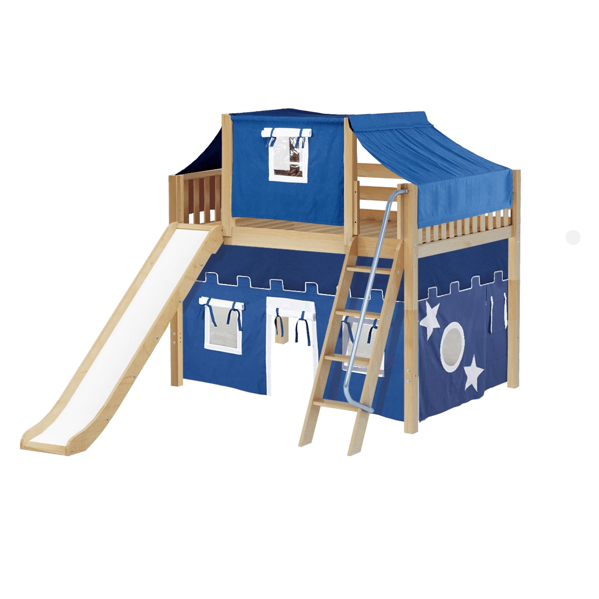 Our classic mid loft gets an extra dose of fun with the addition of colorful fabrics and a slide. Curtains + matching top tent will inspire your child’s imagination during the day, then help them sleep soundly at night. Full size = extra room for growing kids, sleepovers or snuggling.