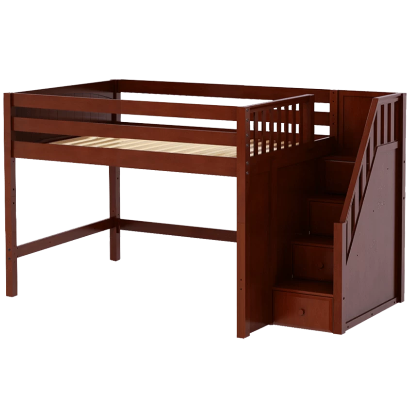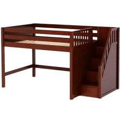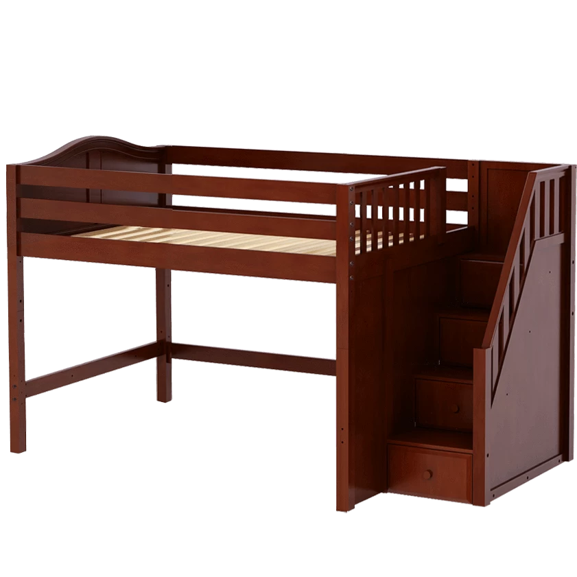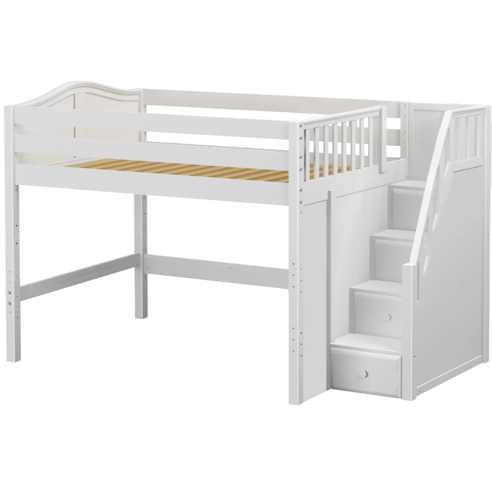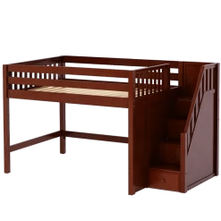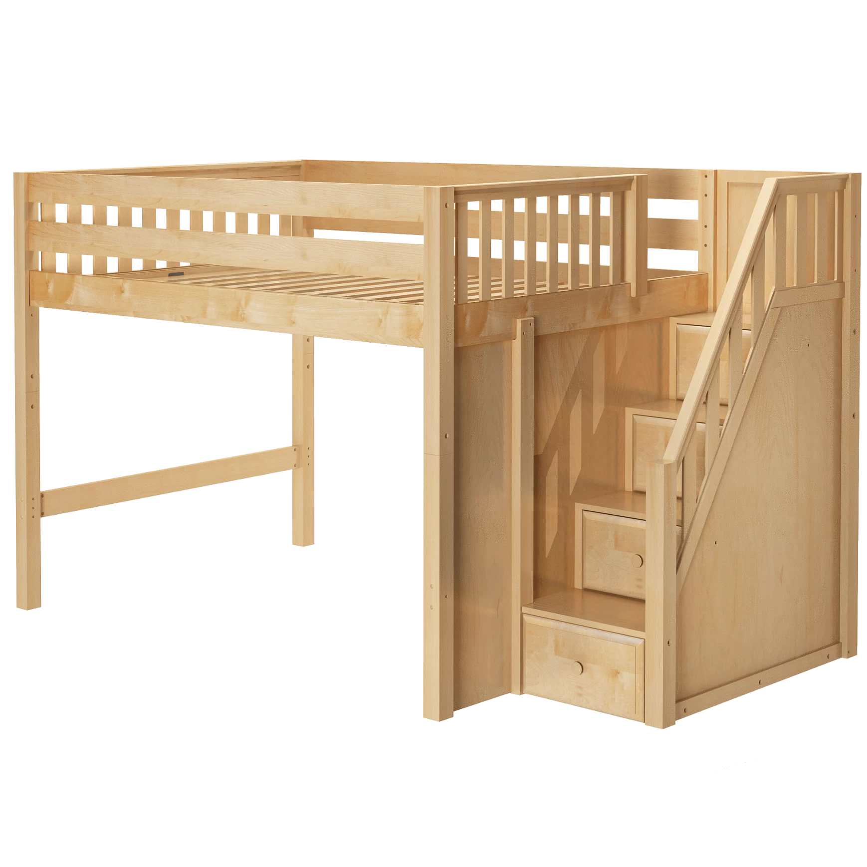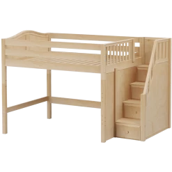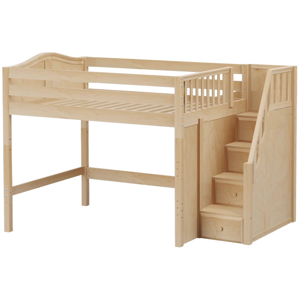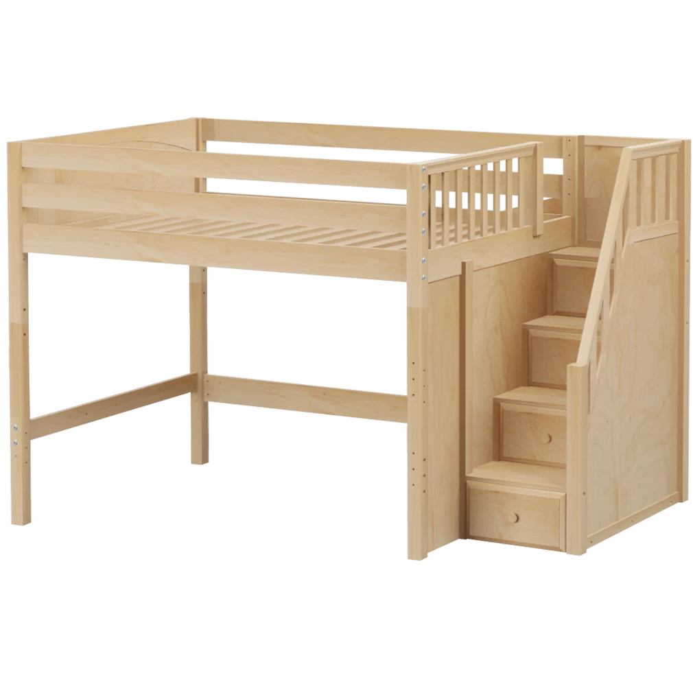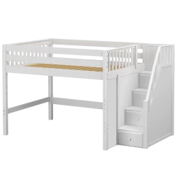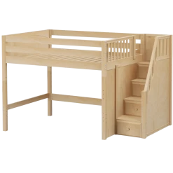 Raised high enough for ample underbed space (10+ inches than the low loft!), but still suitable for younger children and low ceilings, our popular mid loft bed with stairs works for all.