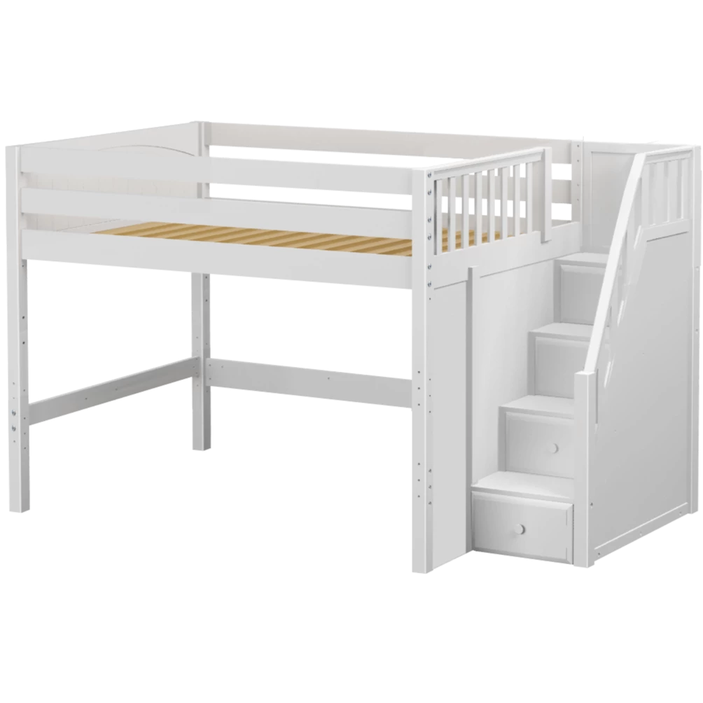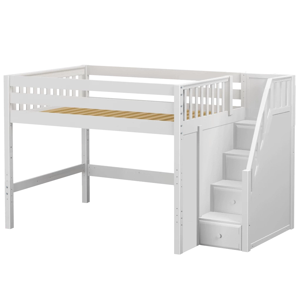 Space for sleep, study and play all one place makes this the ultimate combination of fun and function. Sturdy, easy to climb steps double as storage drawers, great for clothes or toys. More underbed space, but not too high, our popular full Mid Loft with staircase = the perfect happy medium!