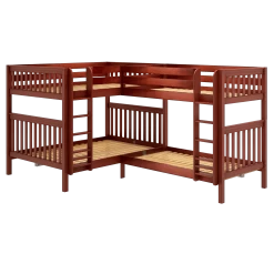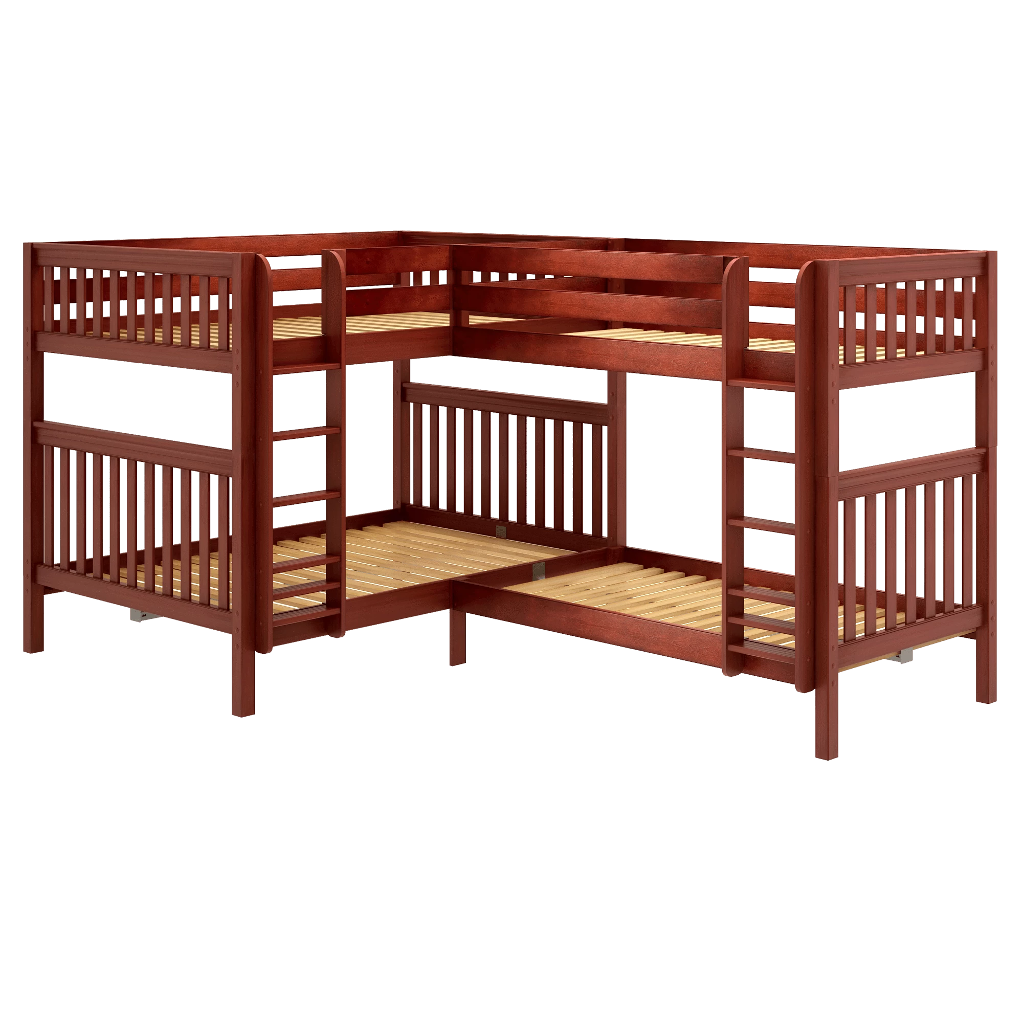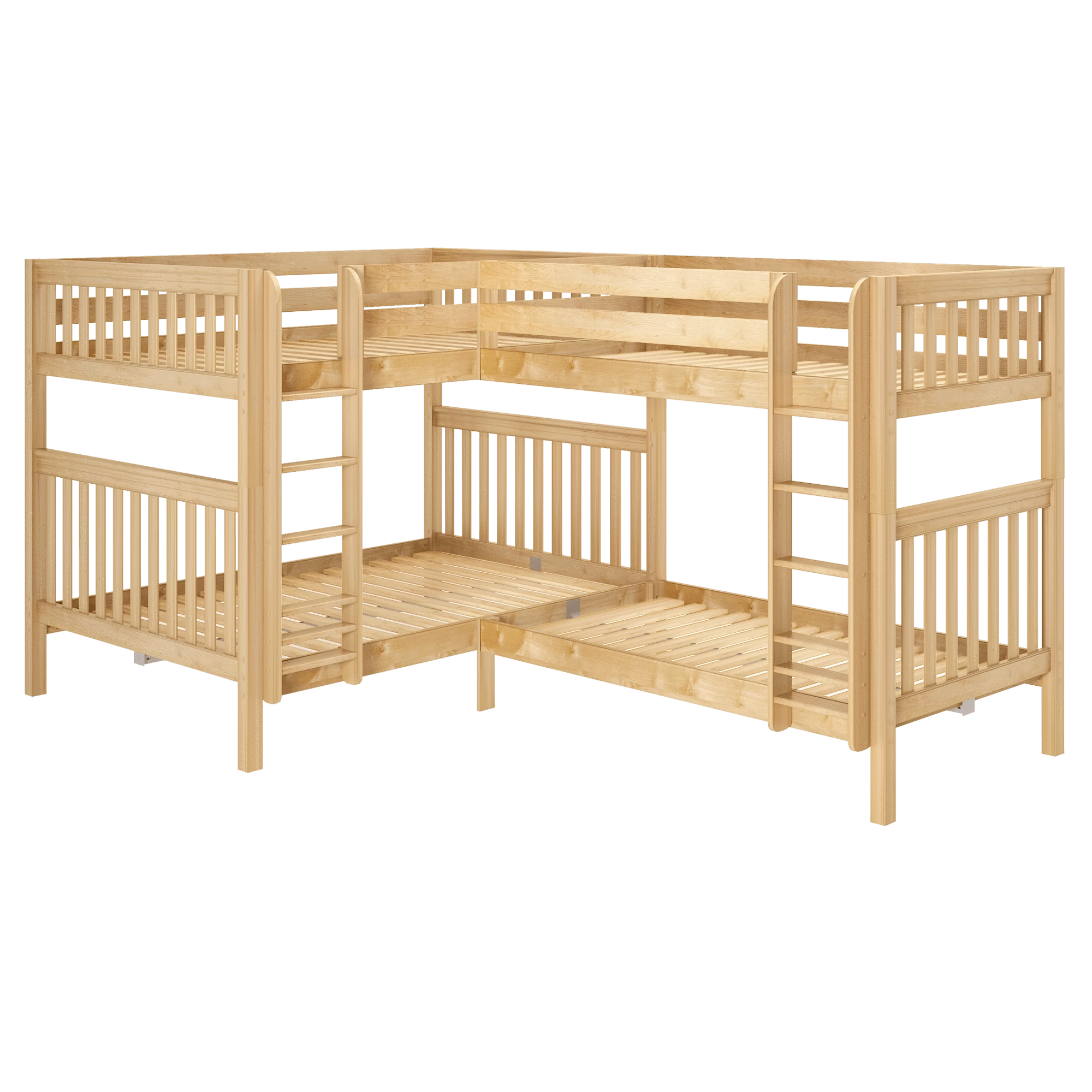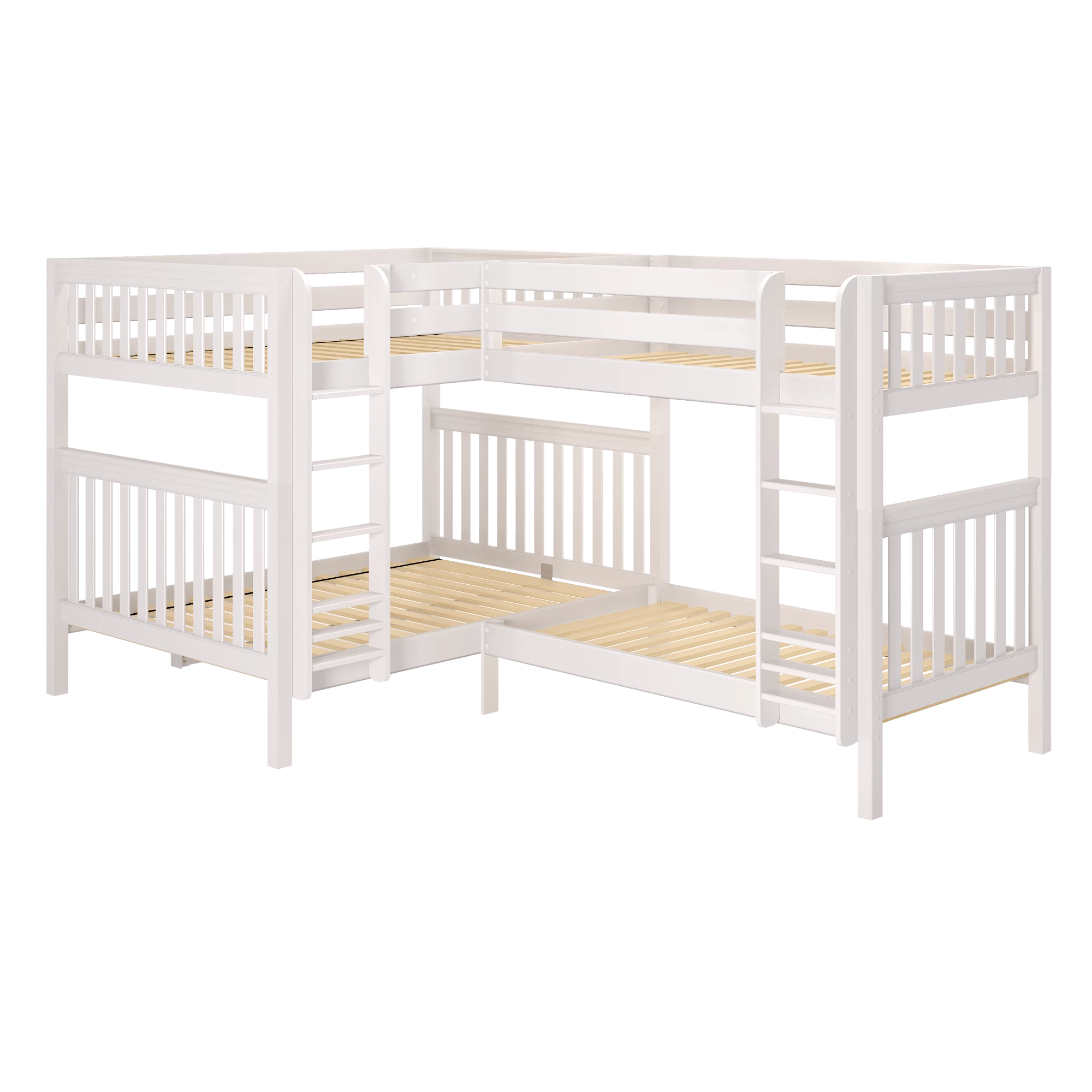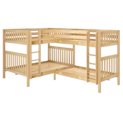 We combined two bunk beds to form an “L” shape that fits perfectly in a bedroom corner. Designed as a space-saving way to sleep four, it’s the perfect solution for a shared bedroom or vacation home. Easy-to-climb, solid wood ladders on each end for dual access points. Patented Rock Lock system keeps stacked beds super sturdy + secure.