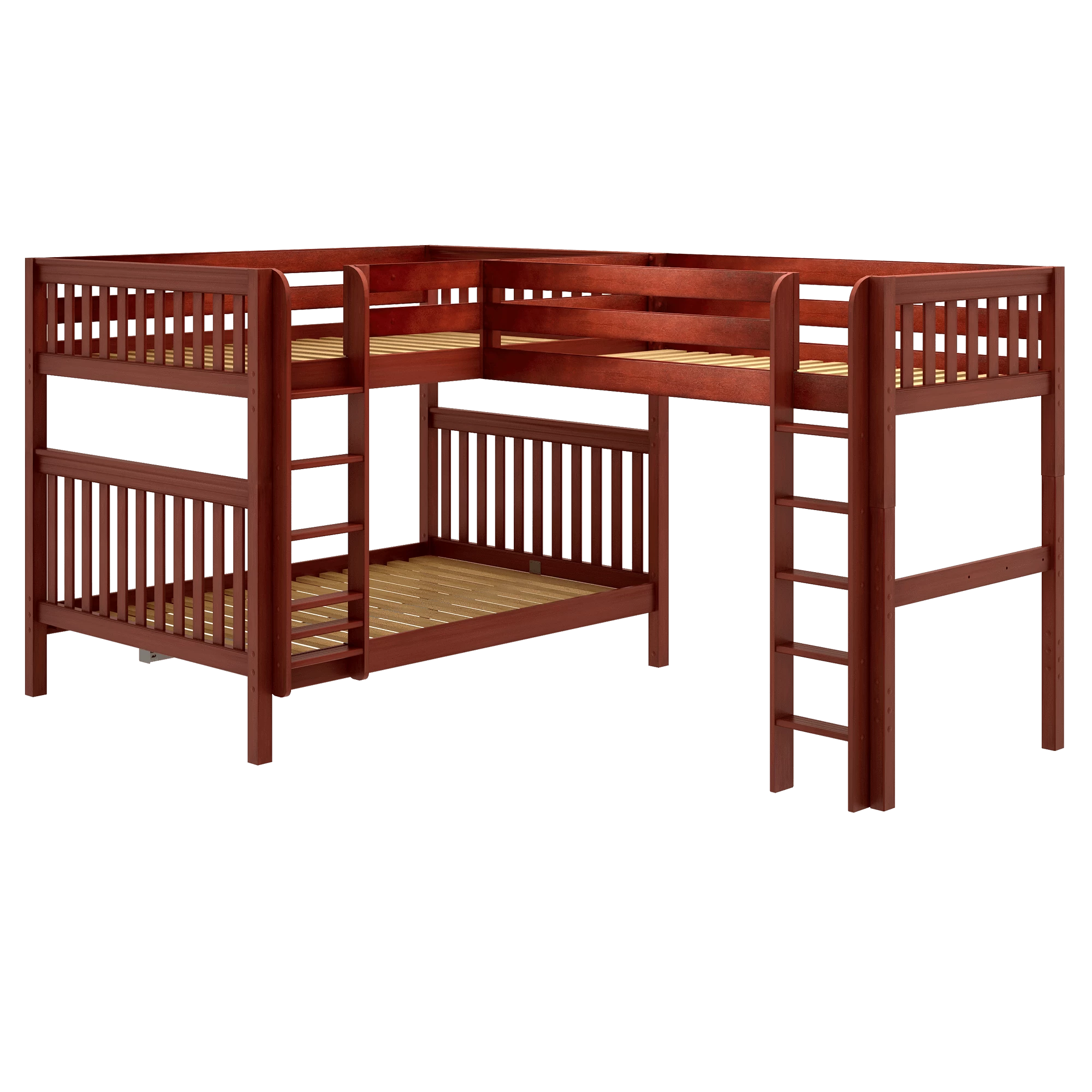 This βLβ shaped design fits your bedroom corner for a space-saving way to sleep three! High height = extra headroom between stacked beds and more clearance beneath the loft. Customize free space for storage, study or play. Safe + sturdy ladders on both ends provide dual points of access to top.