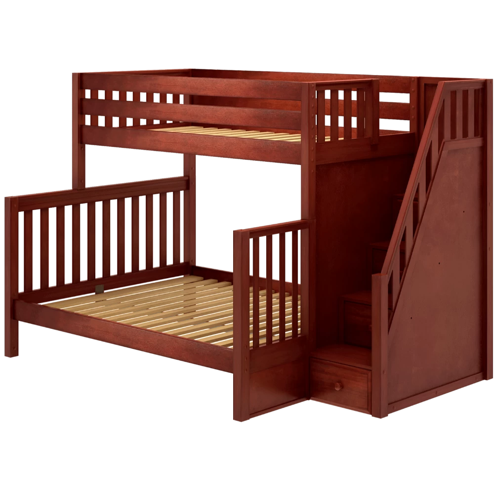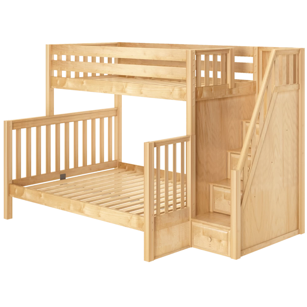 Sleep different sizes and ages comfortably in our high Full XL over Queen bunk bed with stairs! Top bunk raised higher for more space between beds = no more bumped heads on the bottom. Staircase is a super safe way for young children to climb + each step doubles as a storage drawer.