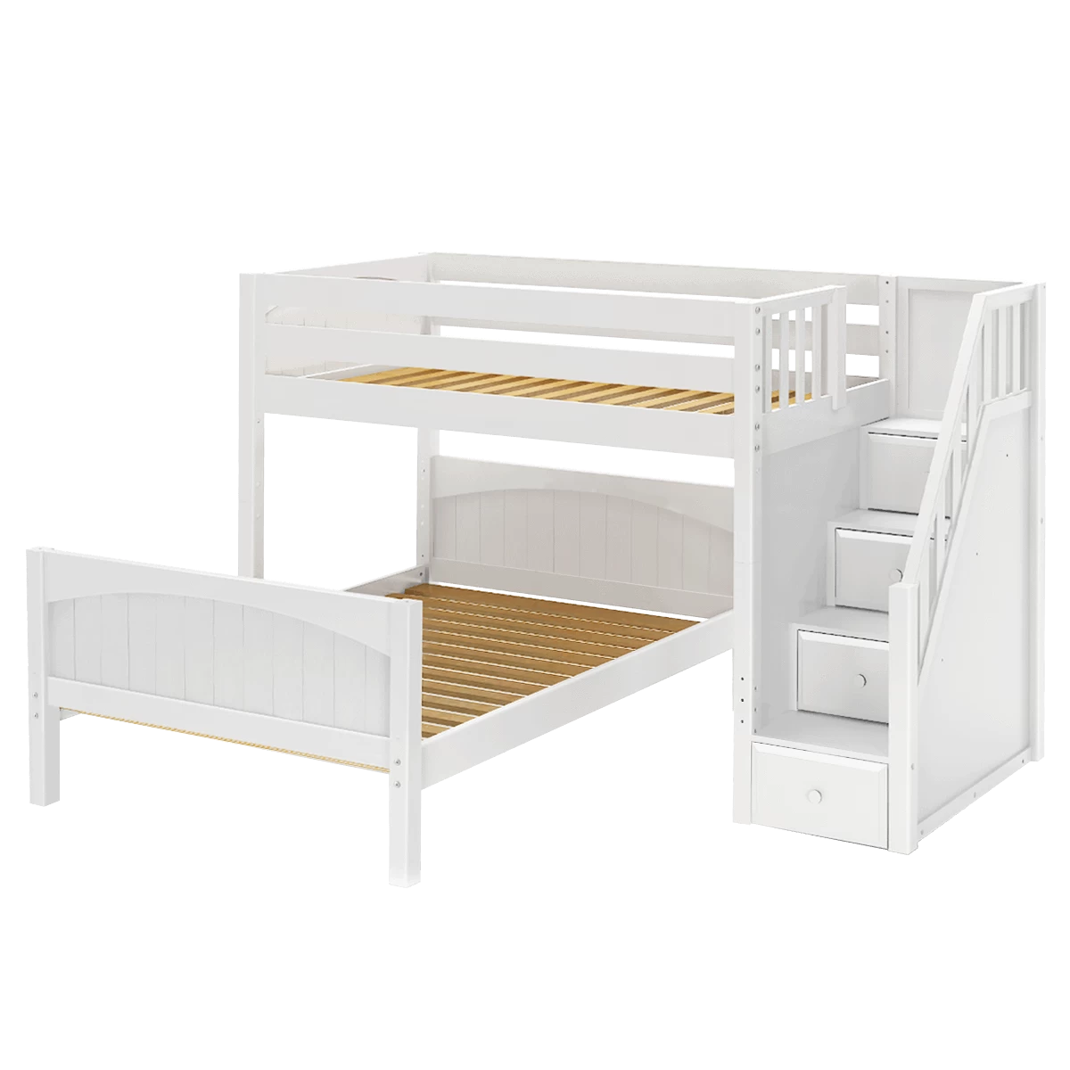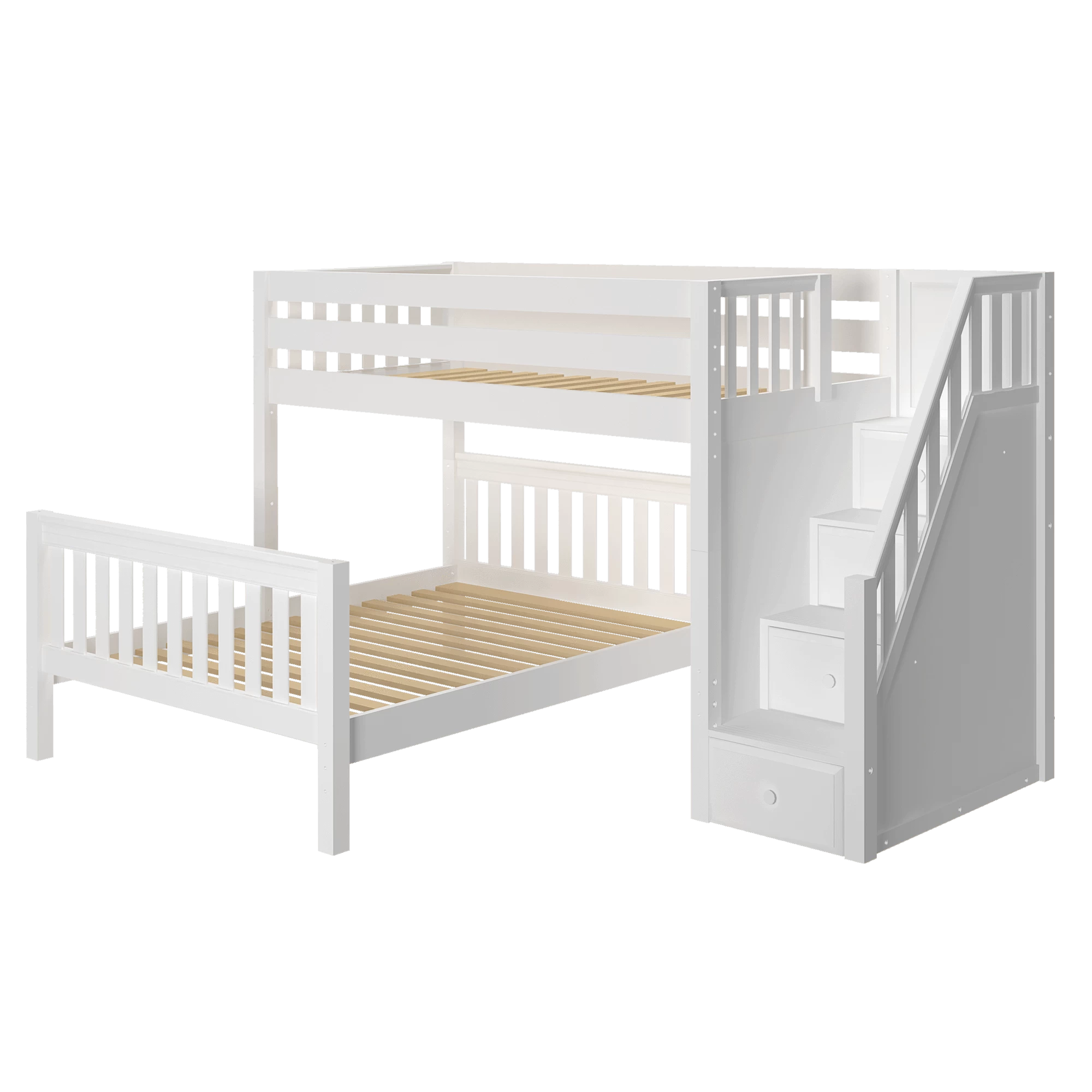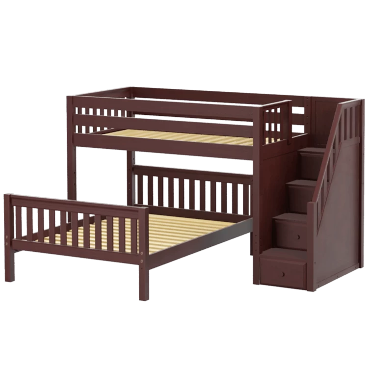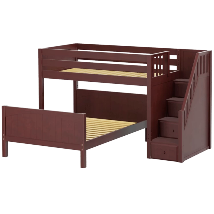 Twin up top, Full size below. This space saving L-shaped design is the perfect solution for sleeping different sizes & ages comfortably in one room. Stairs are a safe way for young children to climb into bed + plenty sturdy enough for adults. Added bonus – steps double as storage drawers, great for clothes or toys.Â