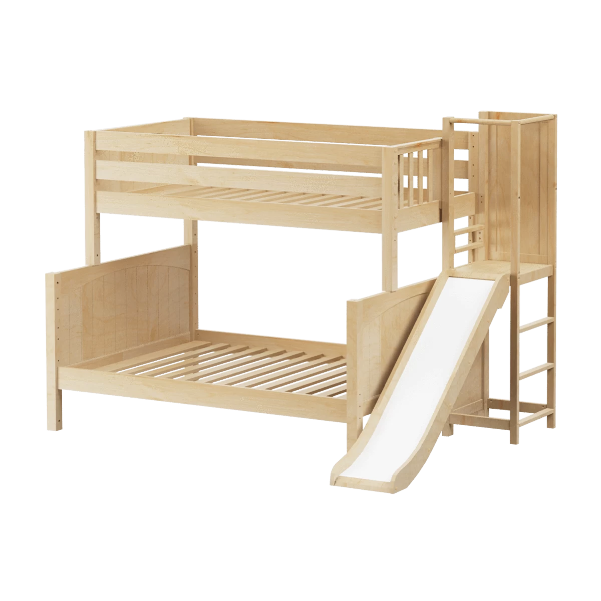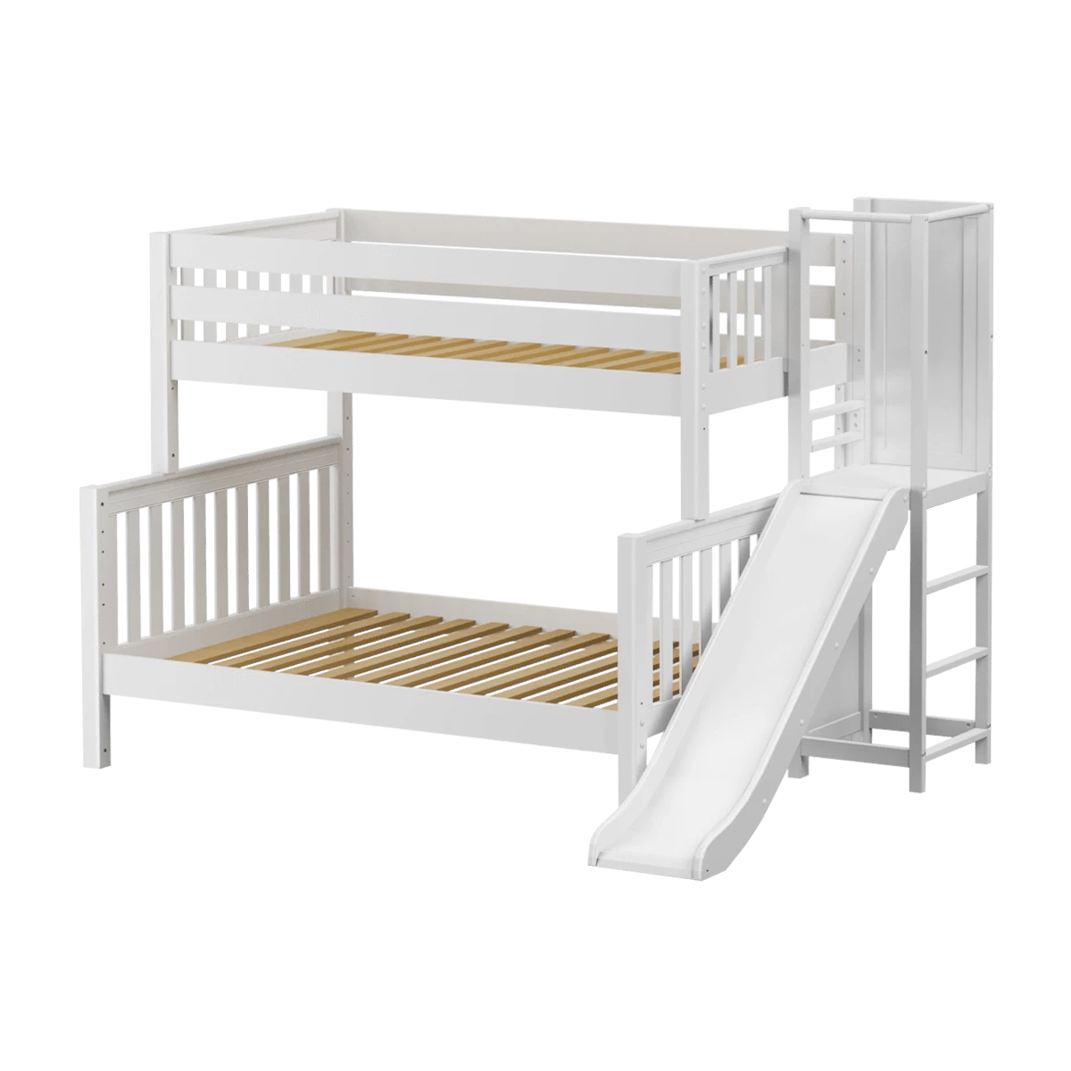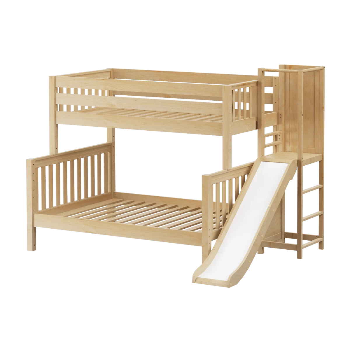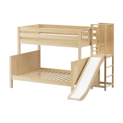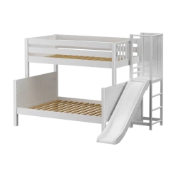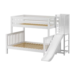 We added a slide to our classic twin over full bunk bed for the ultimate combination of fun and function. Staggered design sleeps different sizes and ages comfortably in one room. Platform positioned at the bed end + doubles as entry way to top.