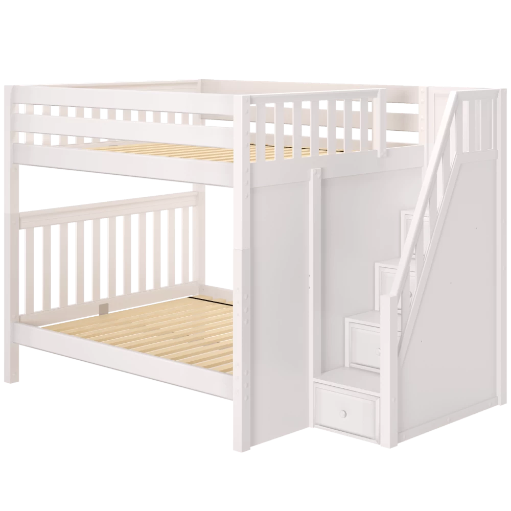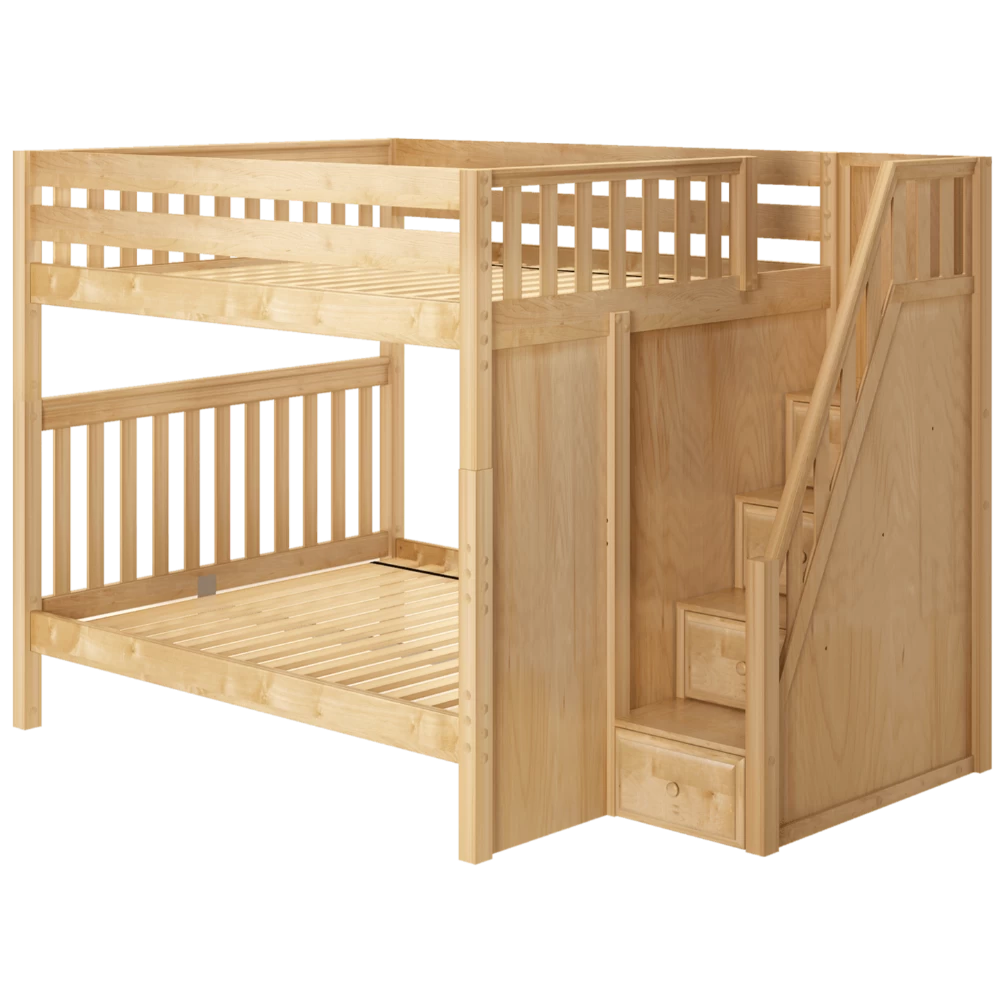 With 3.5 ft of space between top and bottom, our high bunk bed ensures no more bumped heads! Queen size = extra room for growing kids, or adult overnight guests. Stairs are a safe way for young children to climb into bed + sturdy enough for grown ups. Added bonus – steps double as storage drawers.