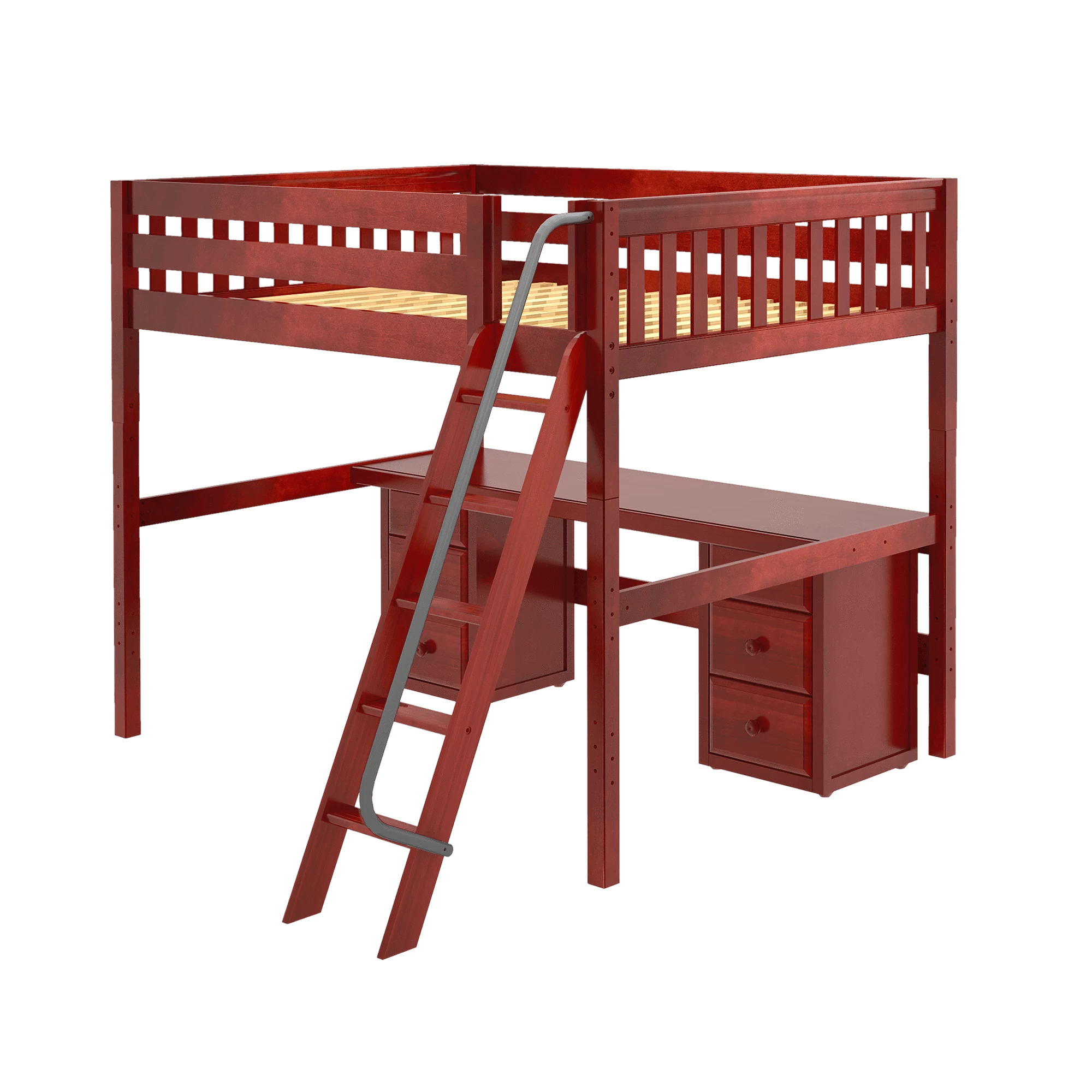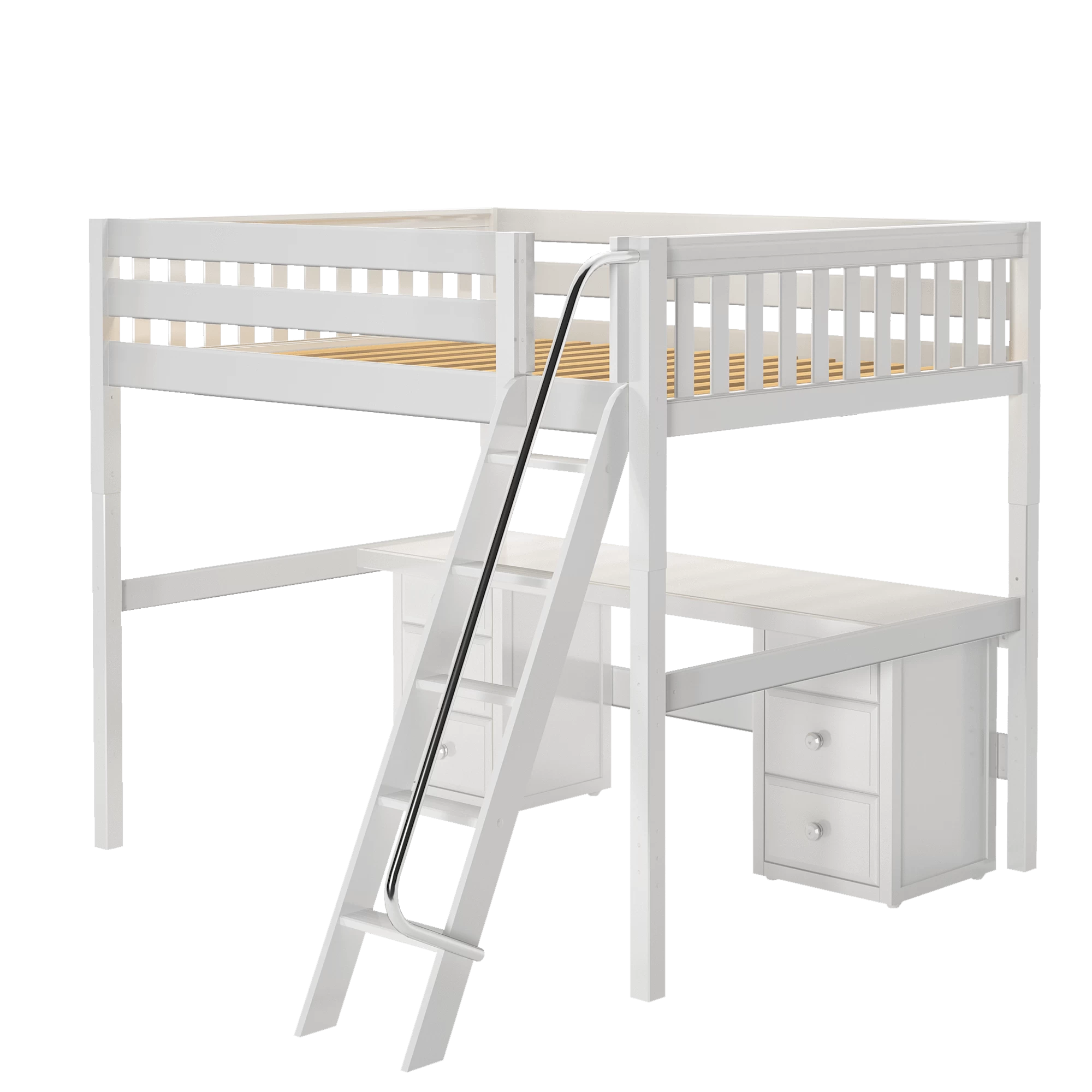 Our high loft with angled ladder becomes the ultimate sleep + study combo! Matching desk attaches directly underneath, freeing up valuable floorspace. Over 4 ft of underbed clearance means even taller teenagers can sit up comfortably. Queen size = extra room for long limbs to stretch out.