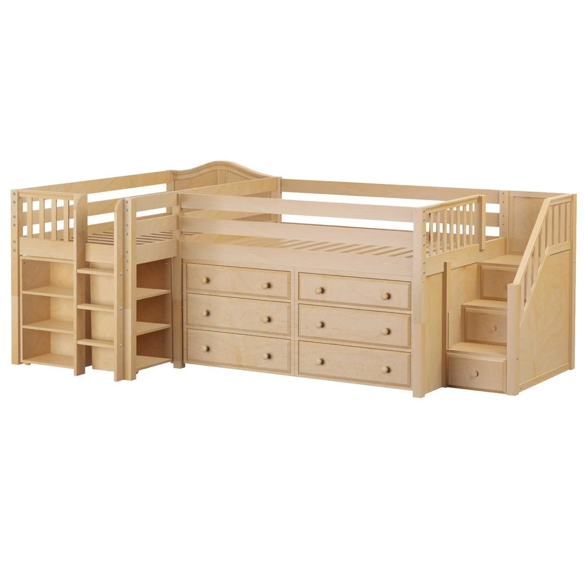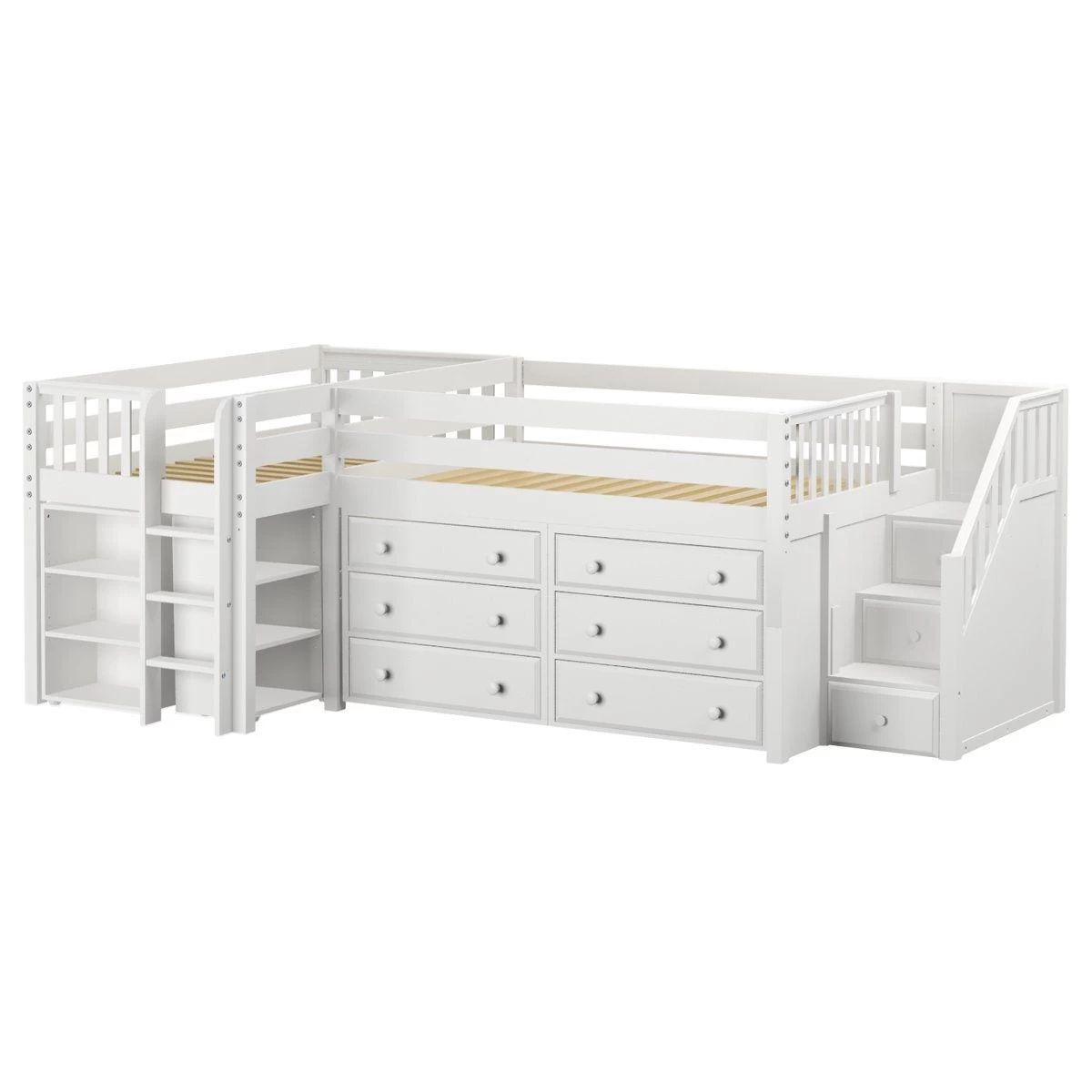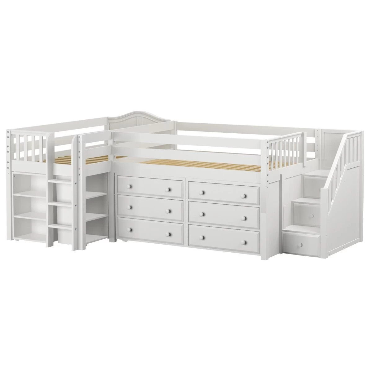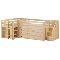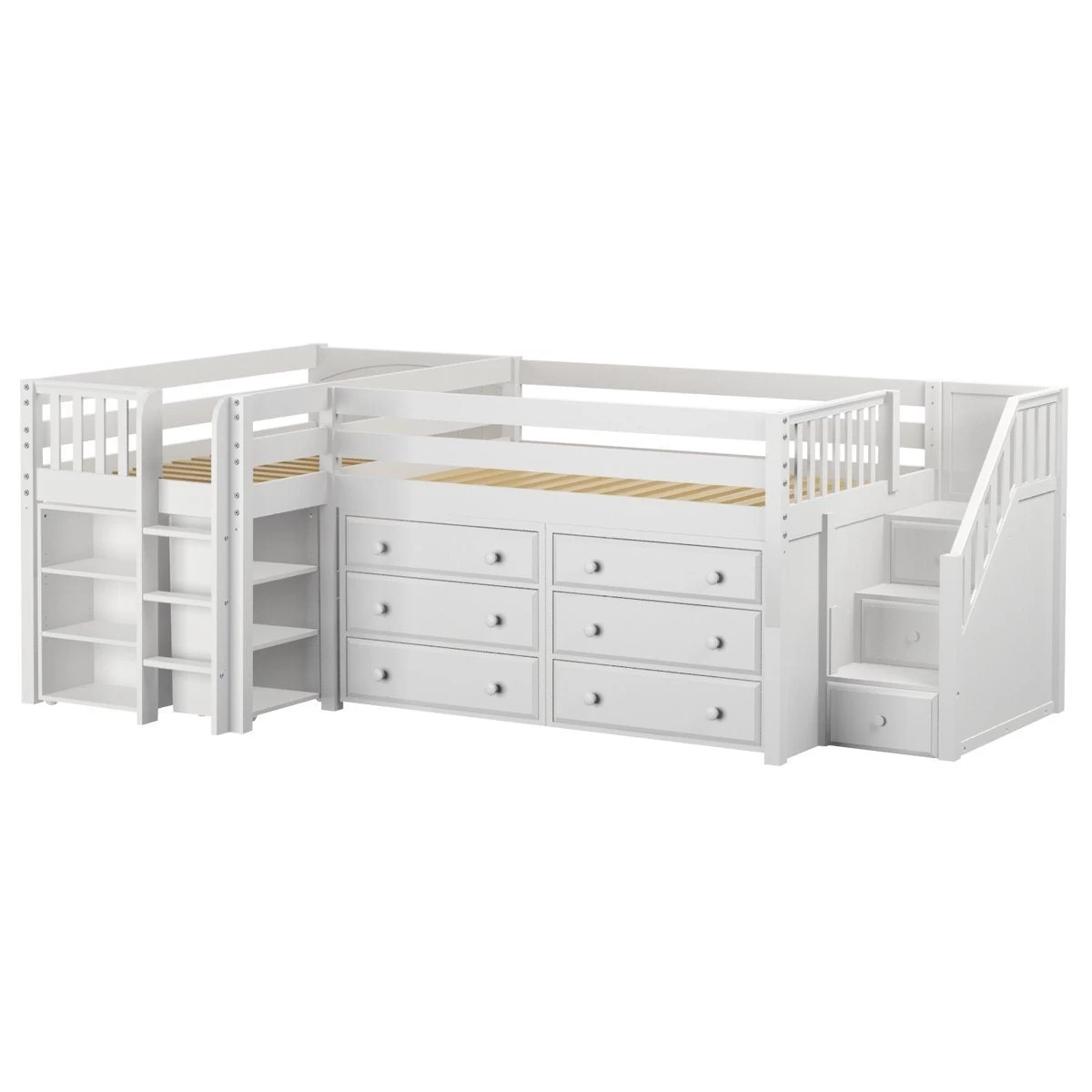 We combined our Twin Low Loft with a Full Low Loft to form this super functional L-shaped design, perfectly suited to fit your bedroom corner. By adding matching dressers & bookcases directly below the beds, you gain tons of storage without losing valuable floorspace!