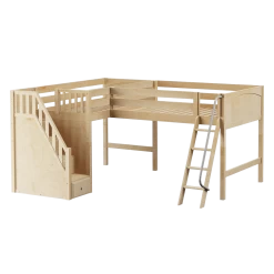 Raised “L” shape fits perfectly in a bedroom corner for a unique way to sleep two. Full bed with staircase on one side is connected to a twin size bed + angled ladder on the other. Added bonus, staircase steps double as drawers for built in storage! Loft design frees up valuable floorspace.