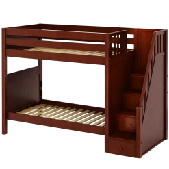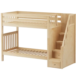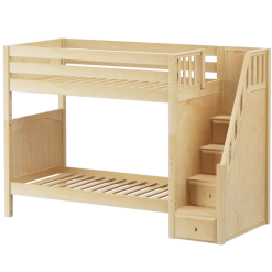 Avoid bumped heads with the Maxtrix high bunk bed! 3.5 ft of space between top and bottom allows big kids and teens to sit up comfortably. Stairs are a safe way for young children to climb into bed + sturdy enough for adults. Added bonus – steps double as storage drawers, great for clothes or toys.