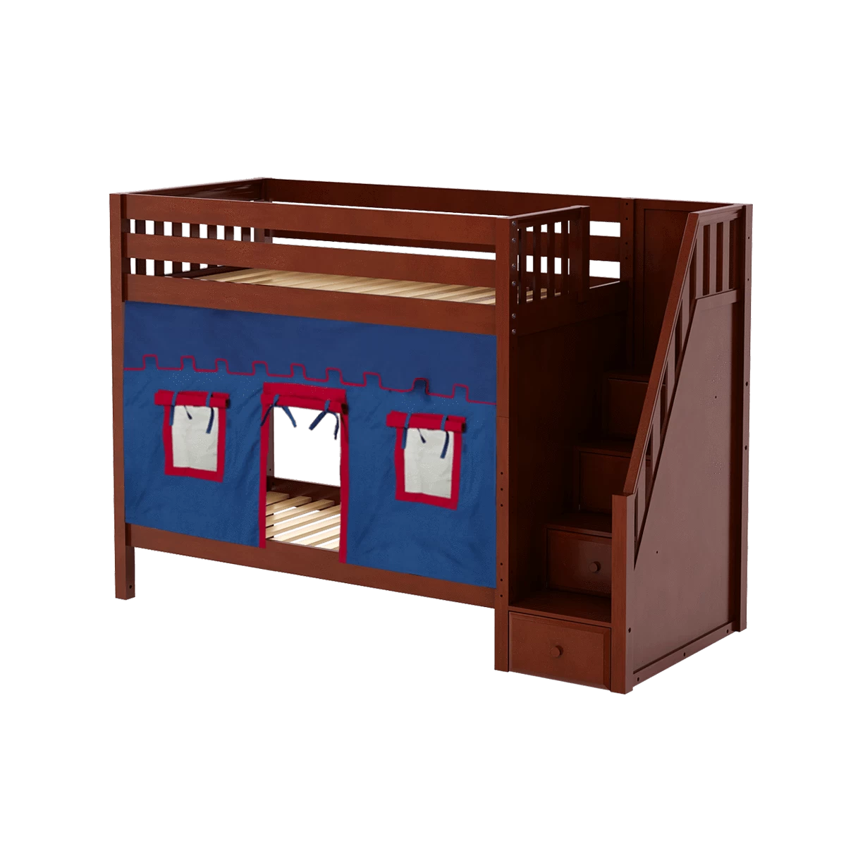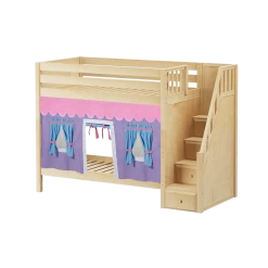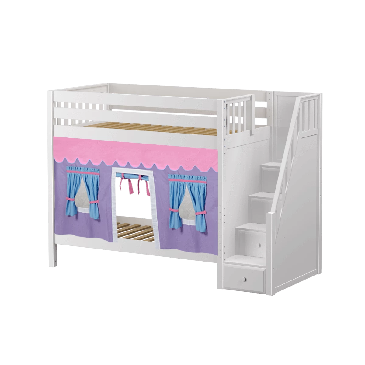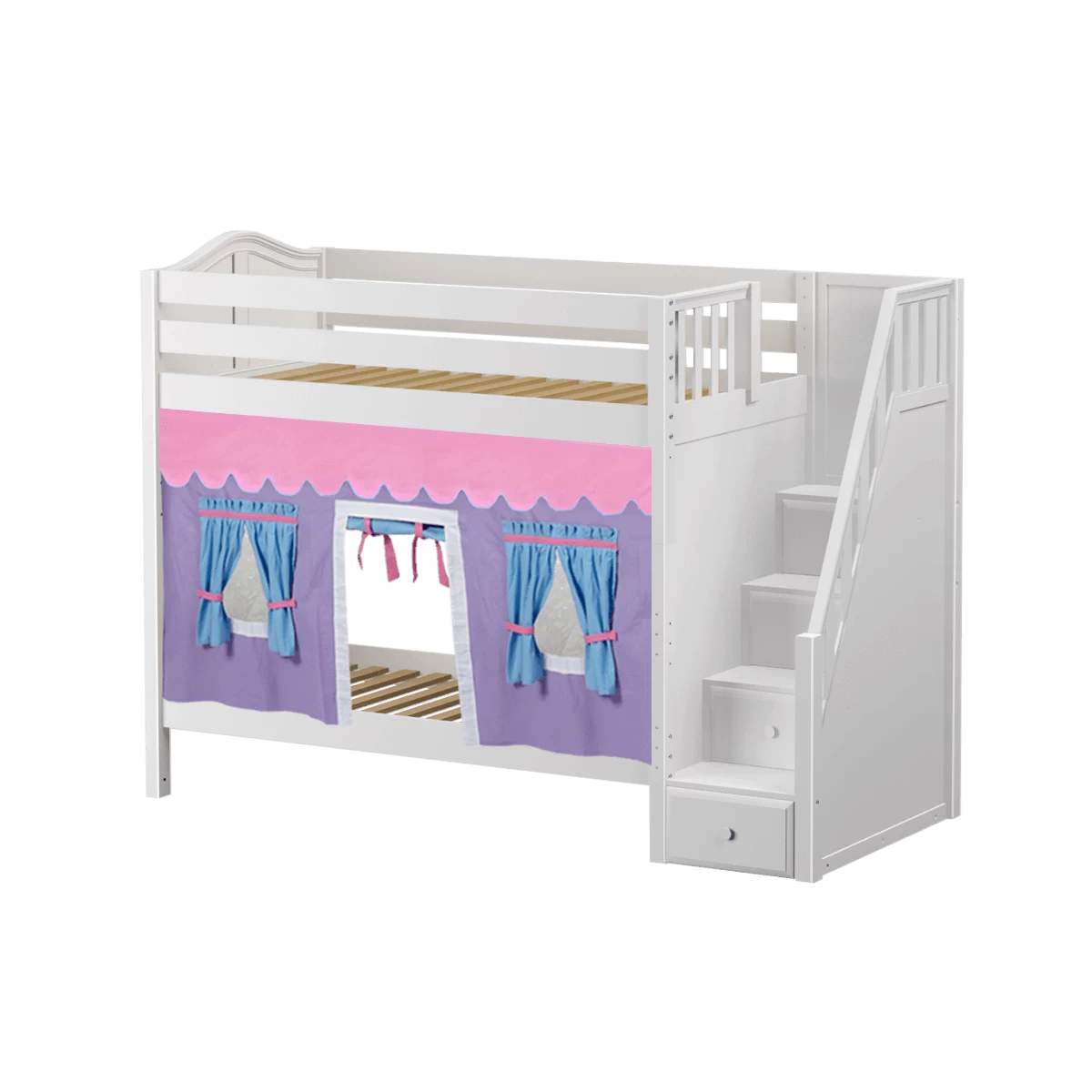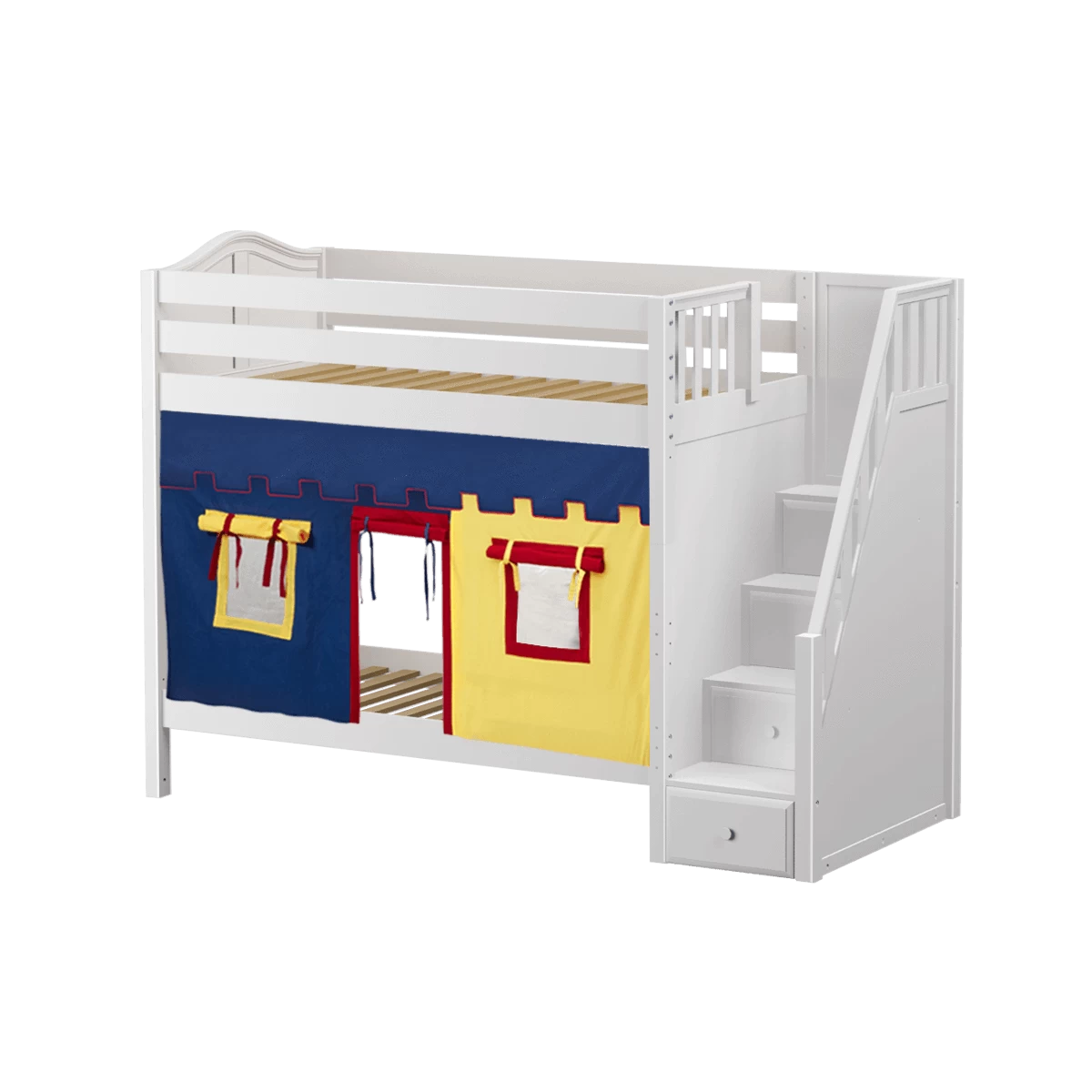 We added colorful curtains to our high bunk bed with stairs so you can create the ultimate shared room or sleepover-headquarters.