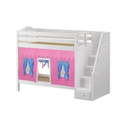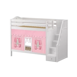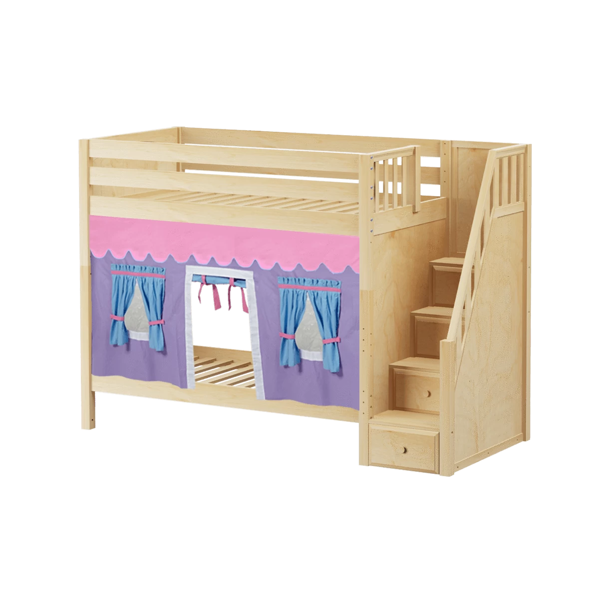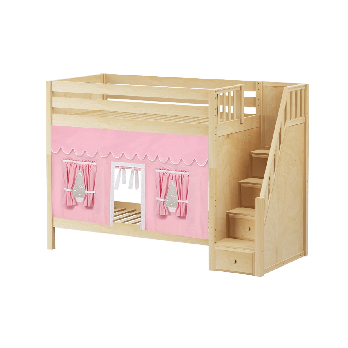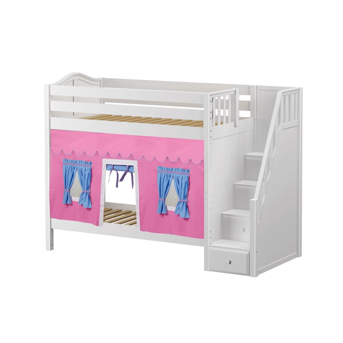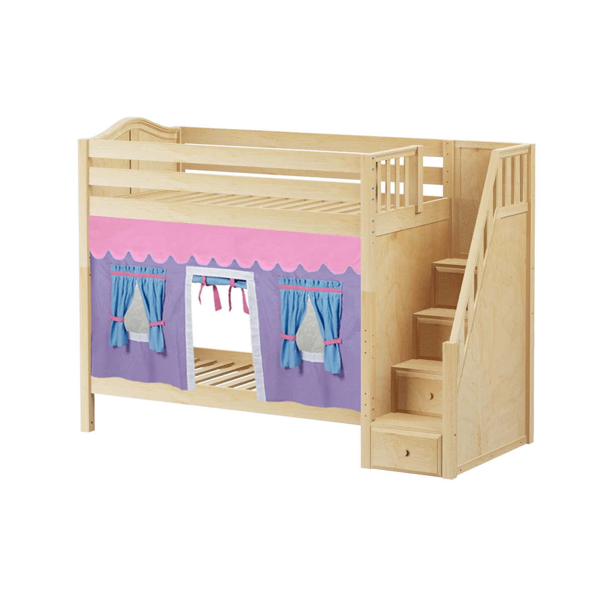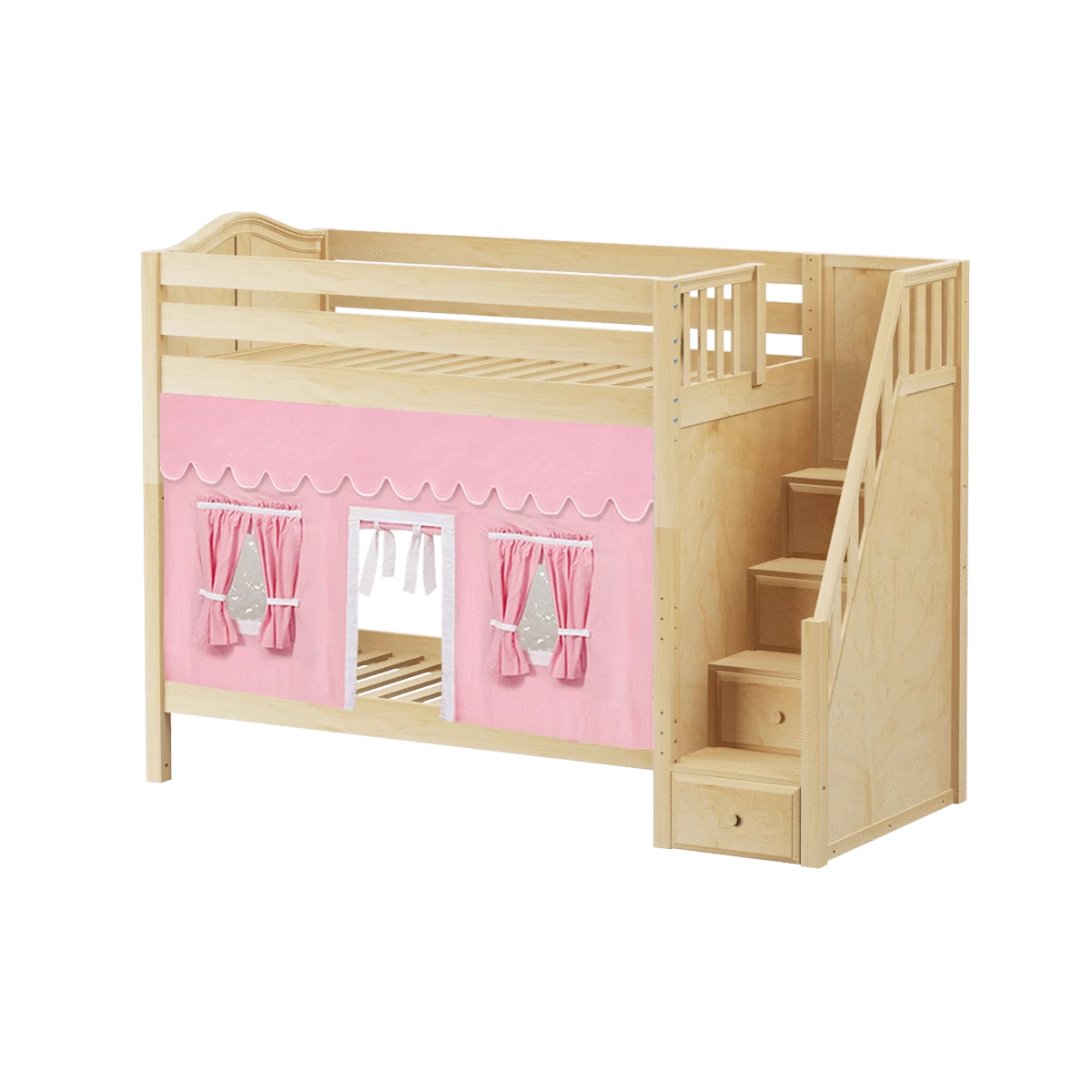 Playful underbed curtains turn up the fun on our high bunk bed with staircase! 3.5 ft of space between top and bottom means no more bumped heads – even big kids and adults can sit up comfortably. Stairs are a safe way to climb into bed + steps double storage drawers.