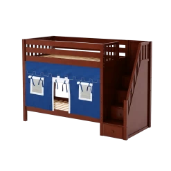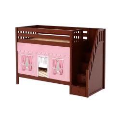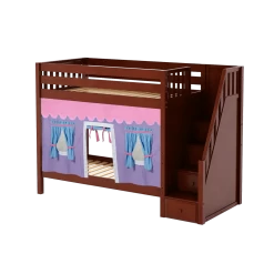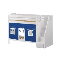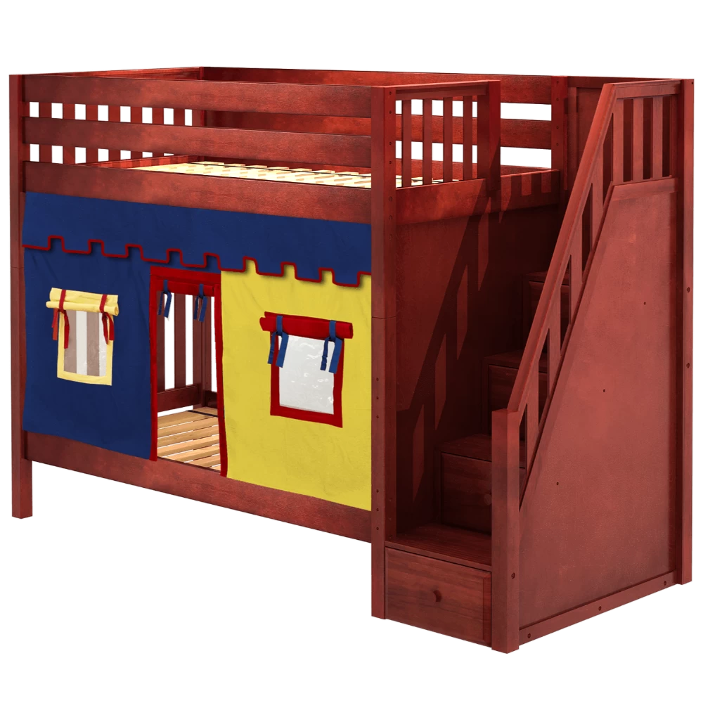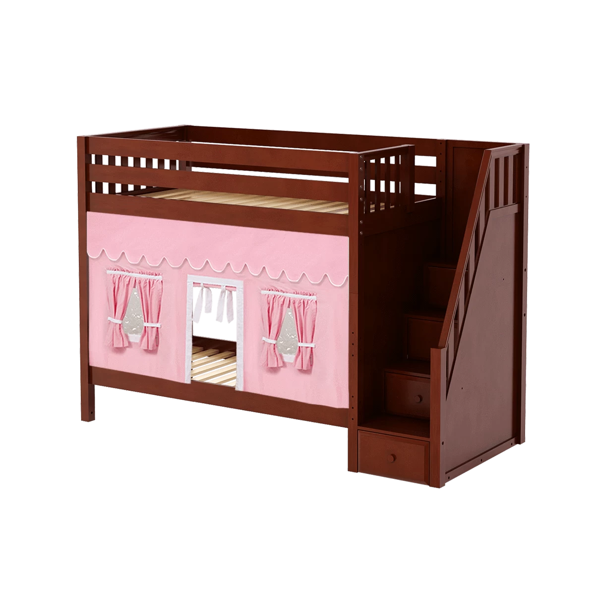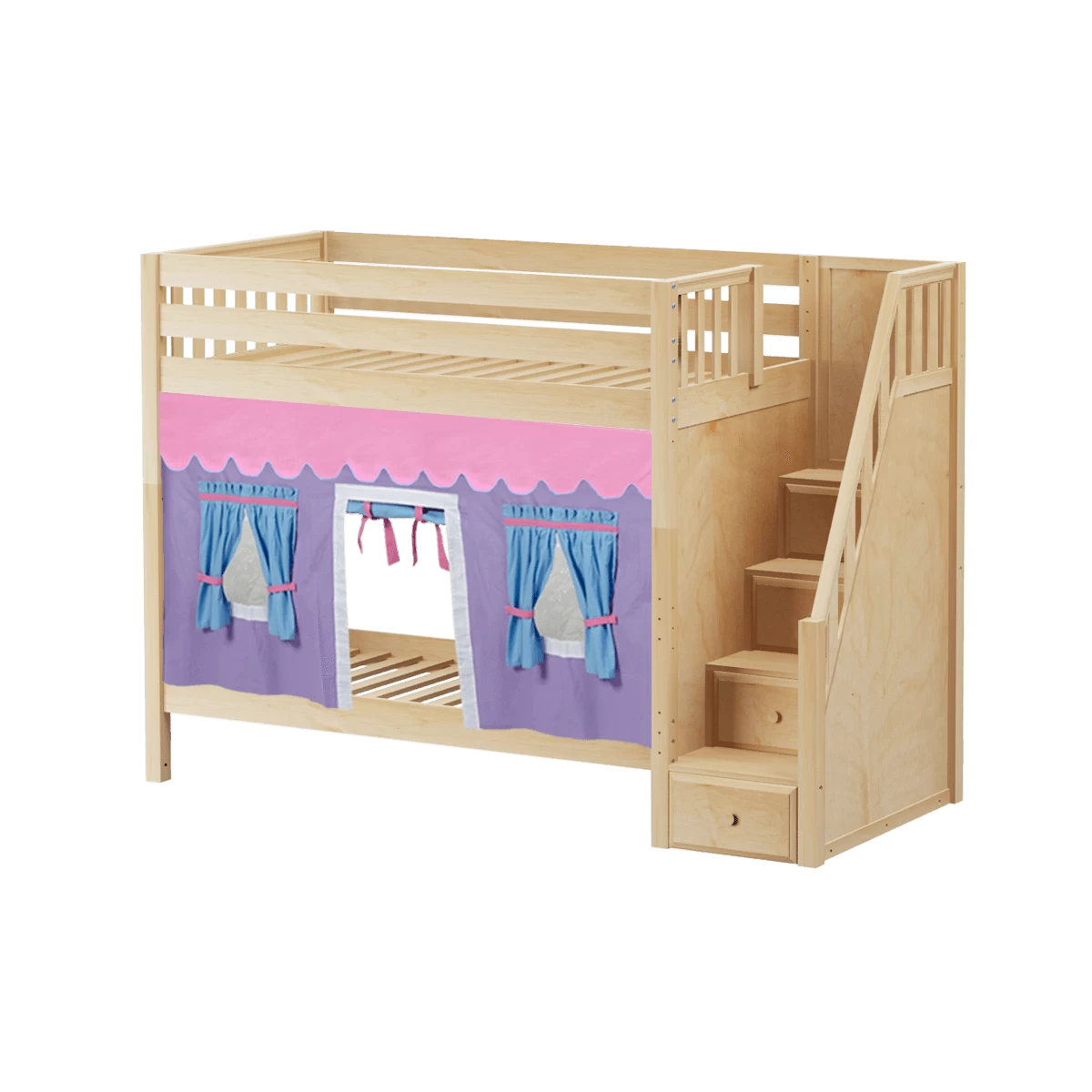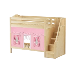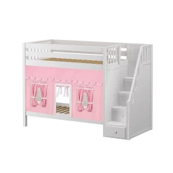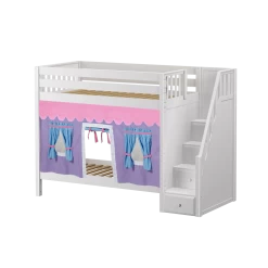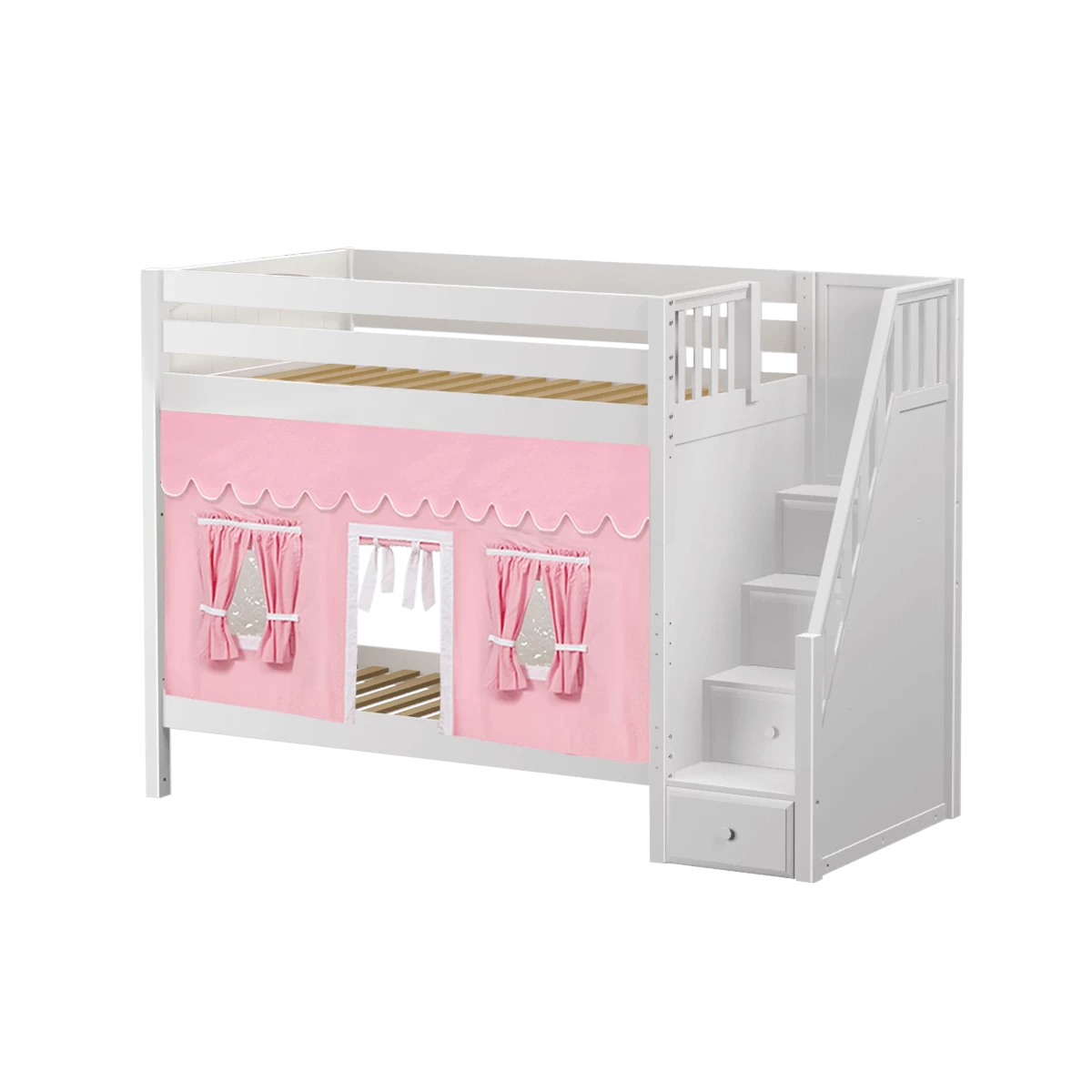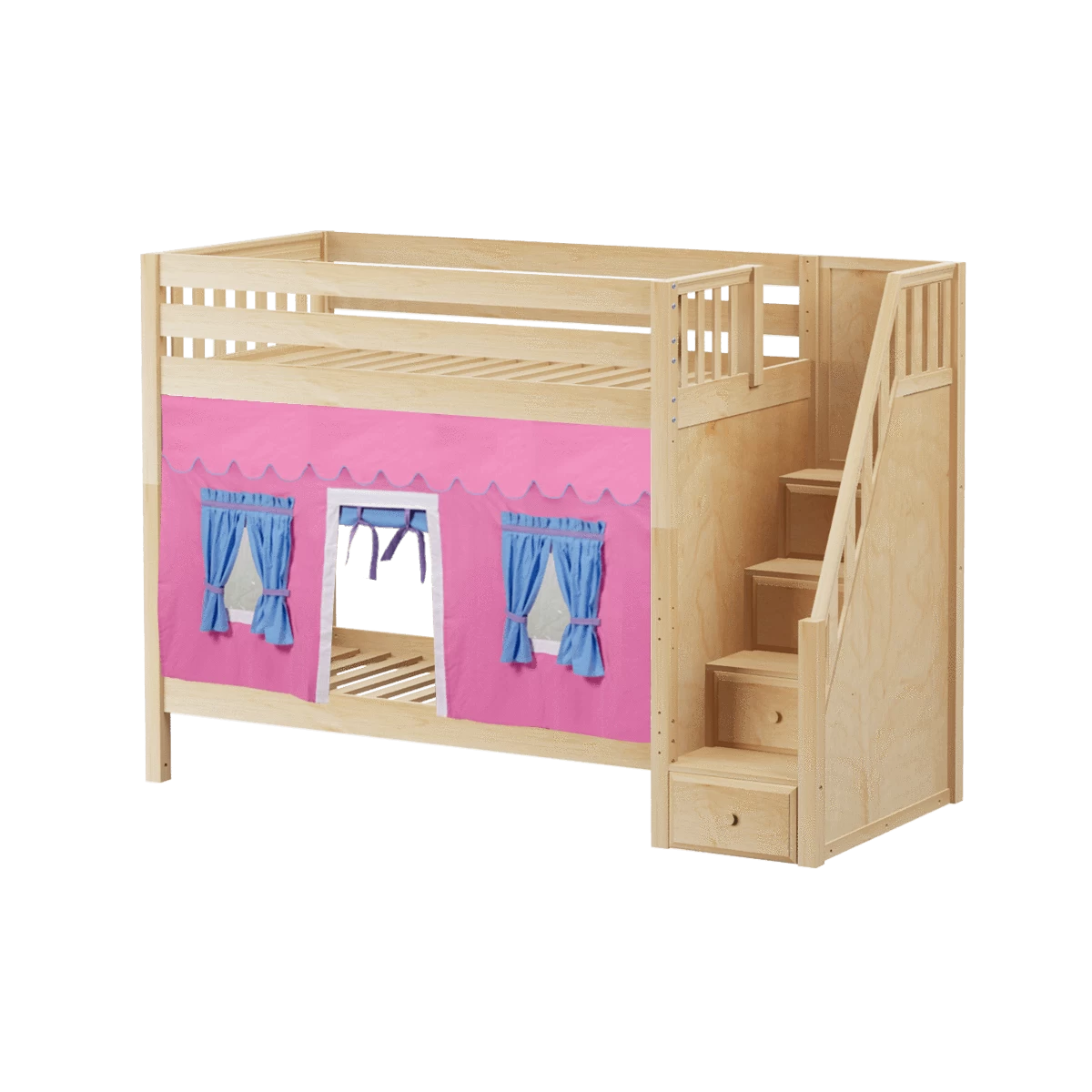 Playful underbed curtains turn up the fun on our high bunk bed with staircase! 3.5 ft of space between top and bottom means no more bumped heads – even big kids and adults can sit up comfortably. Stairs are a safe way to climb into bed + steps double storage drawers.