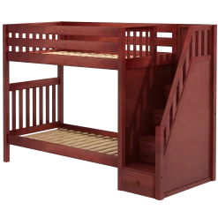Avoid bumped heads with the Maxtrix high bunk bed! 3.5 ft of space between top and bottom allows big kids and teens to sit up comfortably. Stairs are a safe way for young children to climb into bed + sturdy enough for adults. Added bonus – steps double as storage drawers, great for clothes or toys.