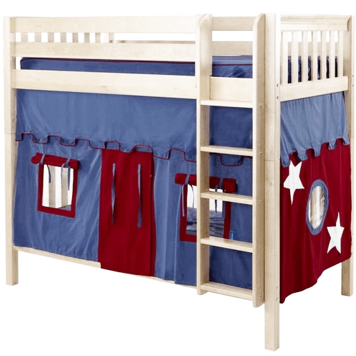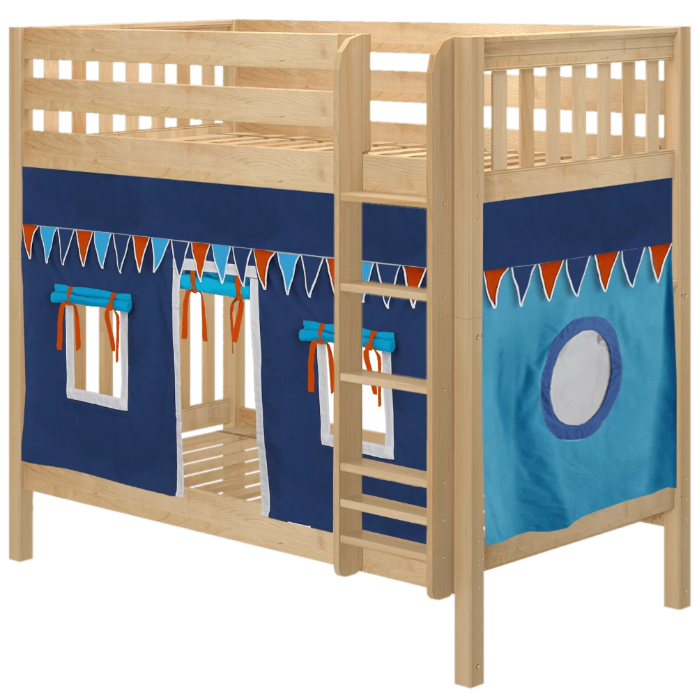 We added adorable curtains to our high bunk bed with straight ladder for a playful take on this Maxtrix classic! 3.5 ft of space between top and bottom allows taller kids + adults to sit up comfortably. Two twin beds are stacked using patented Rock Lock system to form one solid unit.