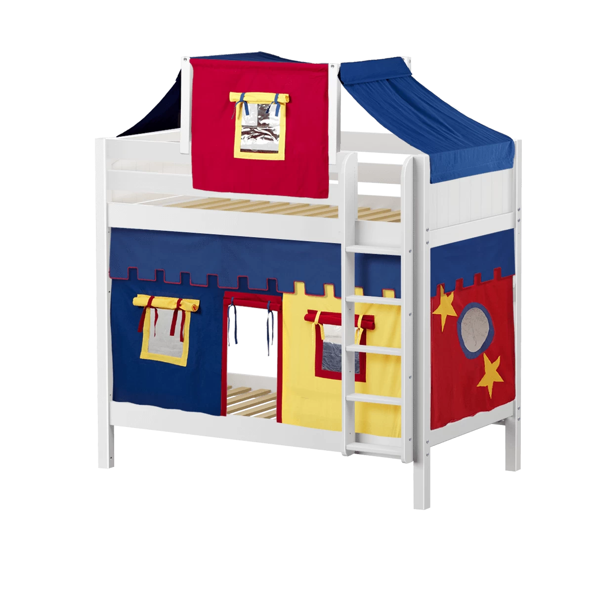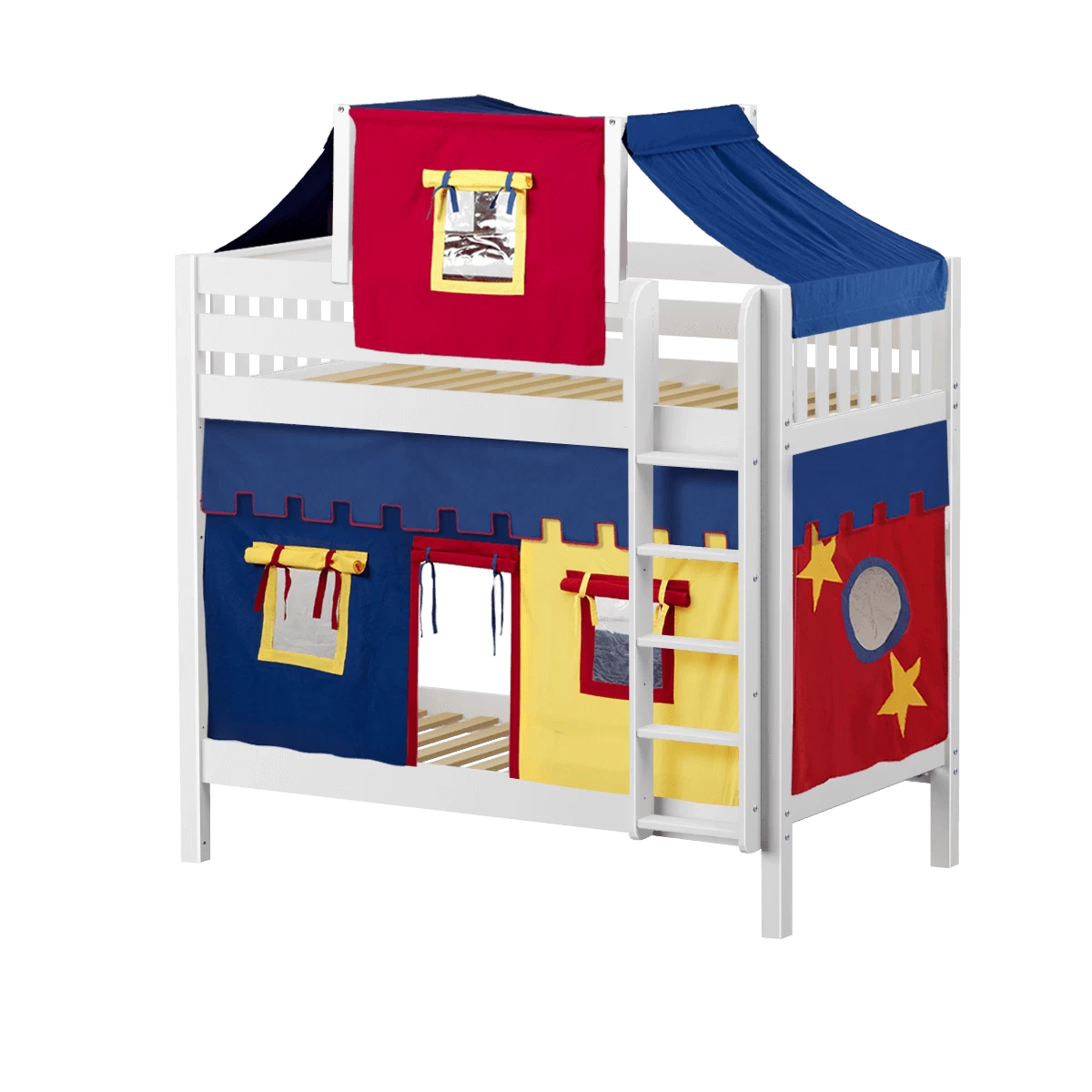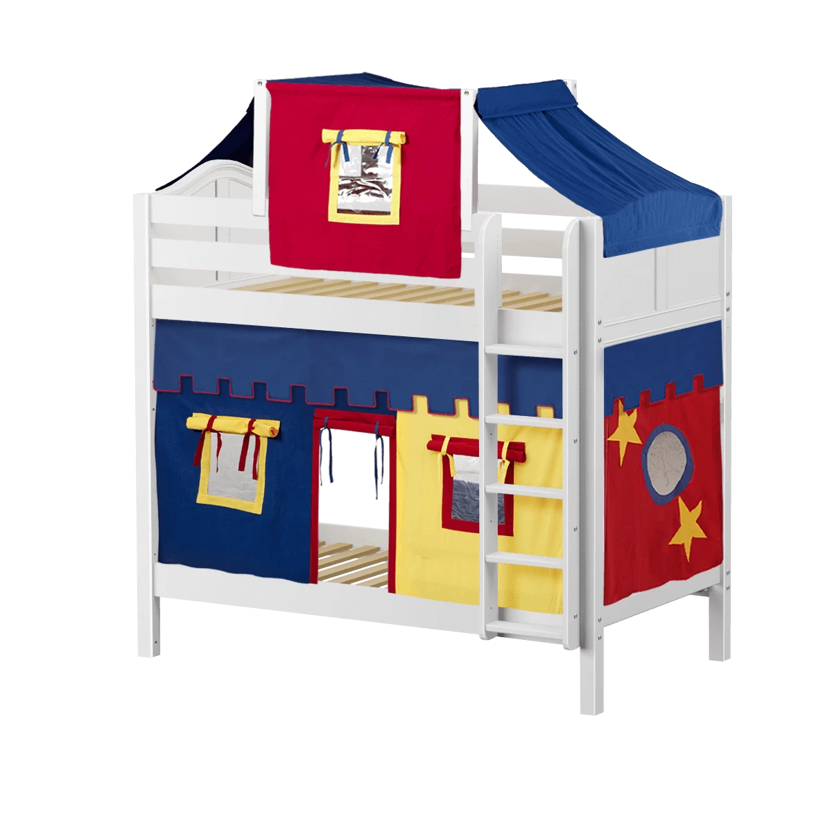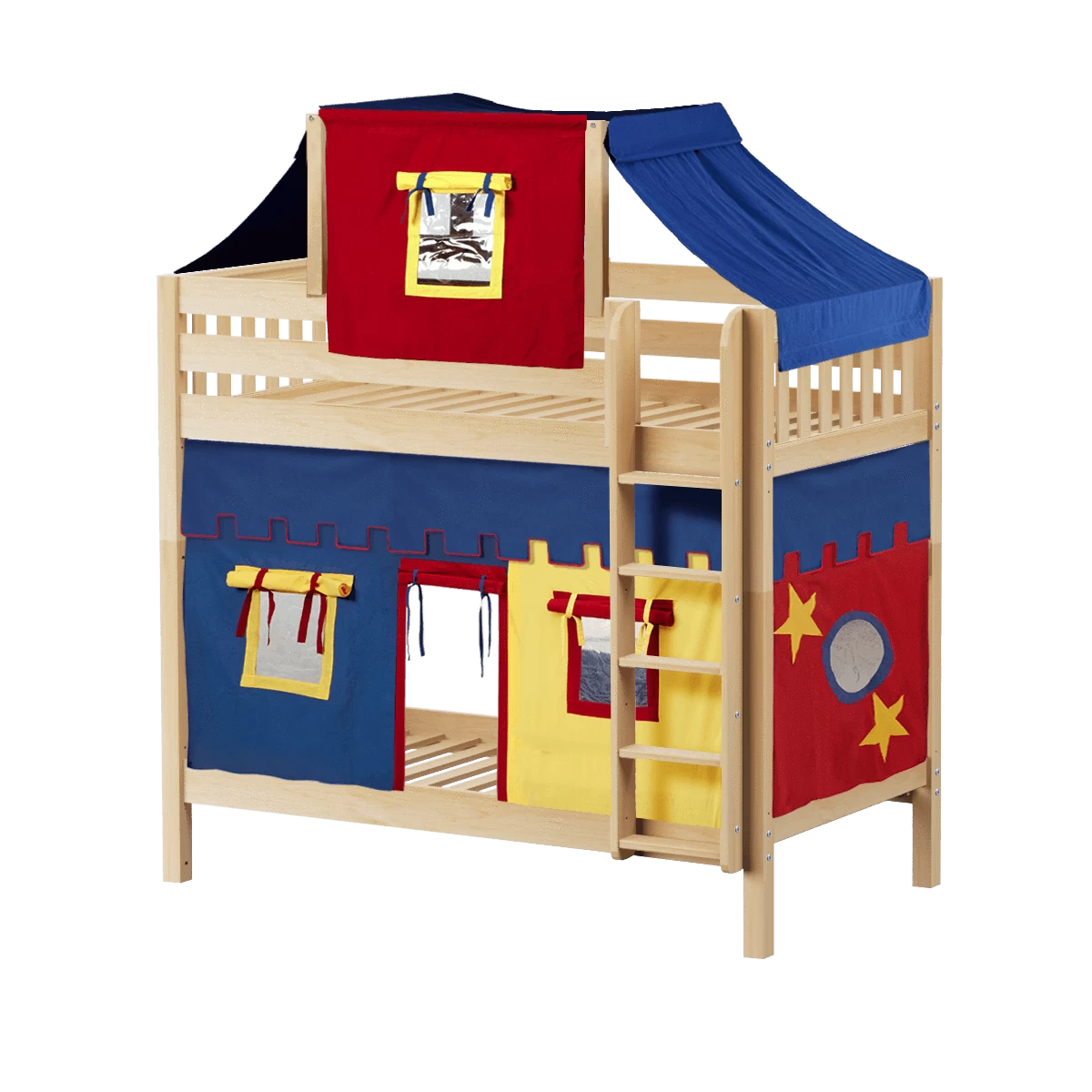 Colorful fabrics put a playful spin on our classic high bunk bed with straight ladder! Curtains + matching top tent will inspire your child’s imagination during the day and help them sleep soundly at night. 3.5 ft of space between top and bottom allows taller kids and adults to sit up comfortably.