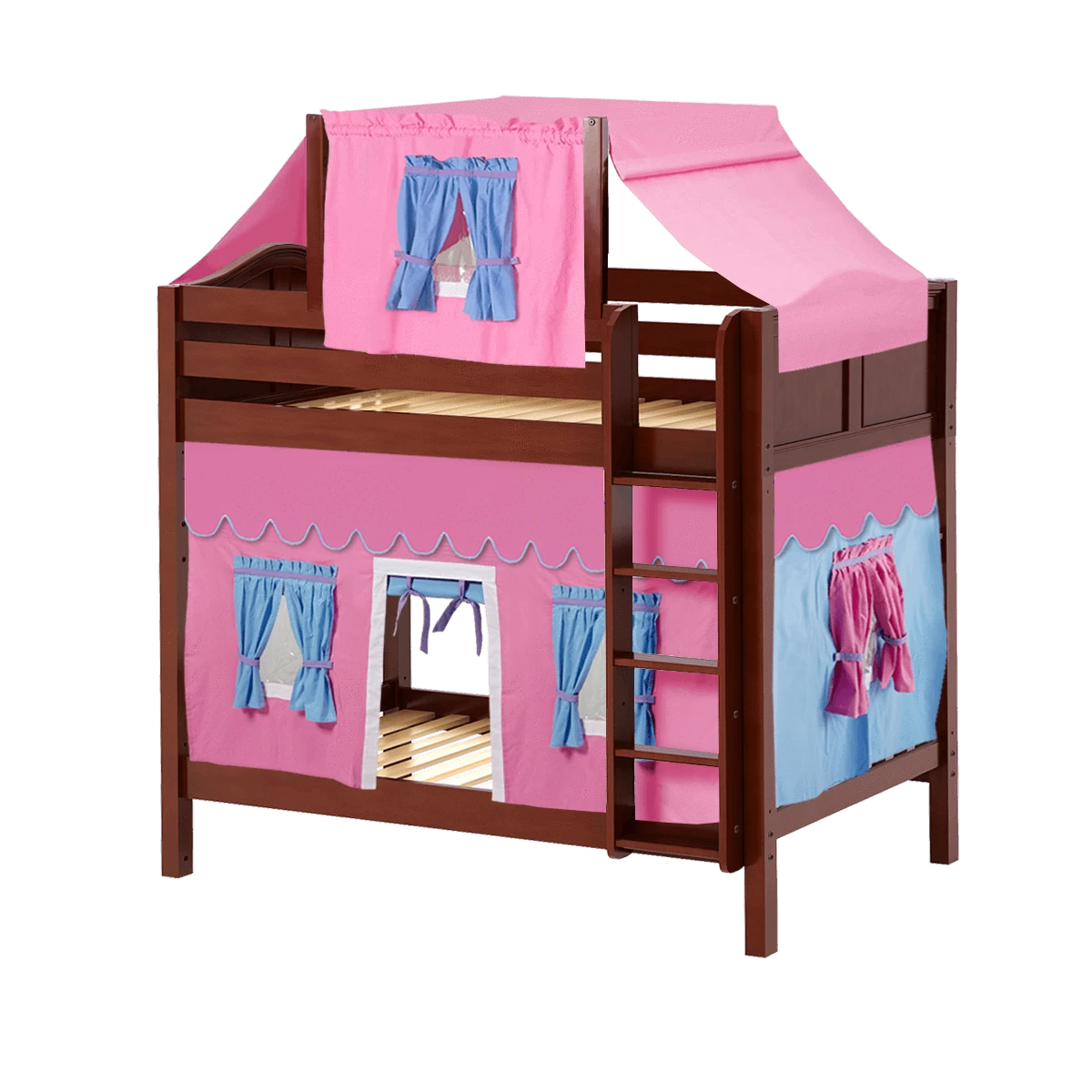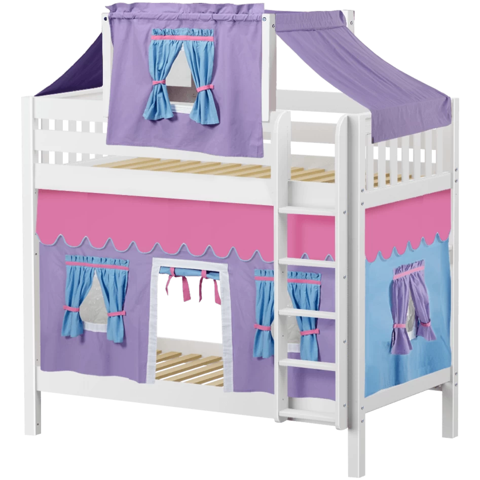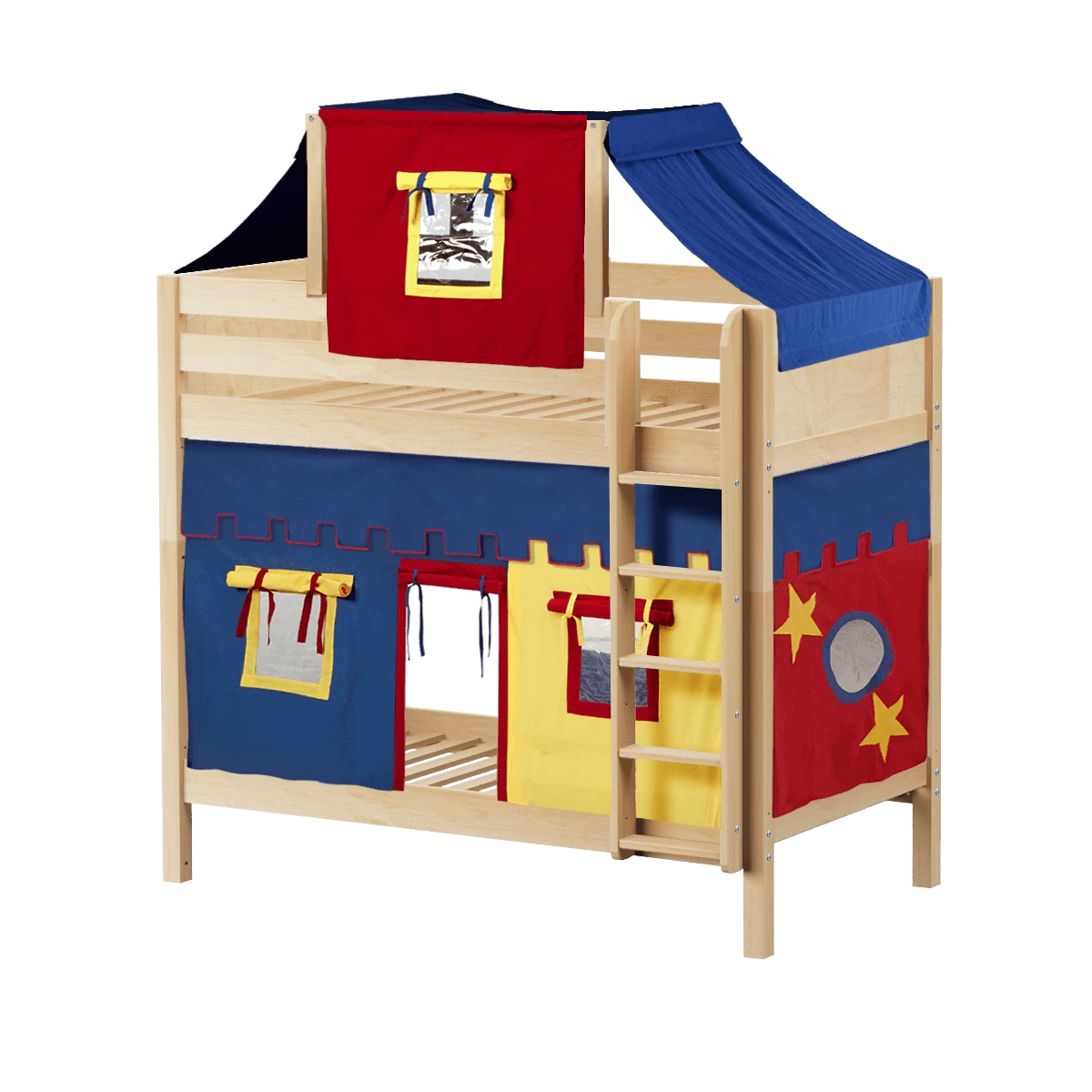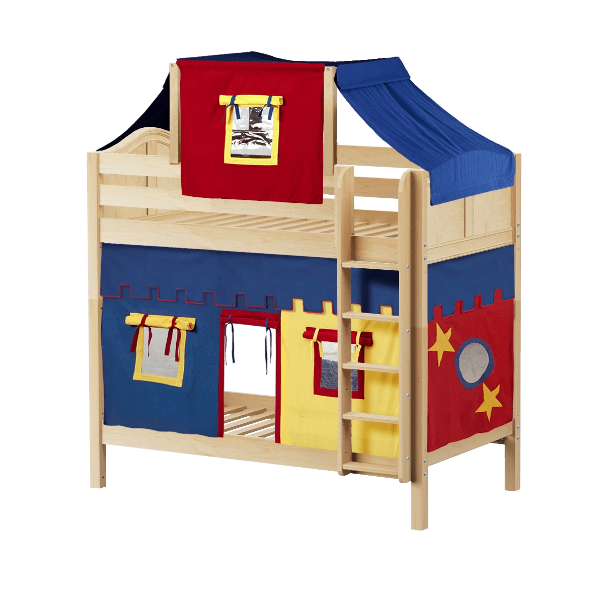 Colorful fabrics put a playful spin on our classic high bunk bed with straight ladder! Curtains + matching top tent will inspire your child’s imagination during the day and help them sleep soundly at night. 3.5 ft of space between top and bottom allows taller kids and adults to sit up comfortably.