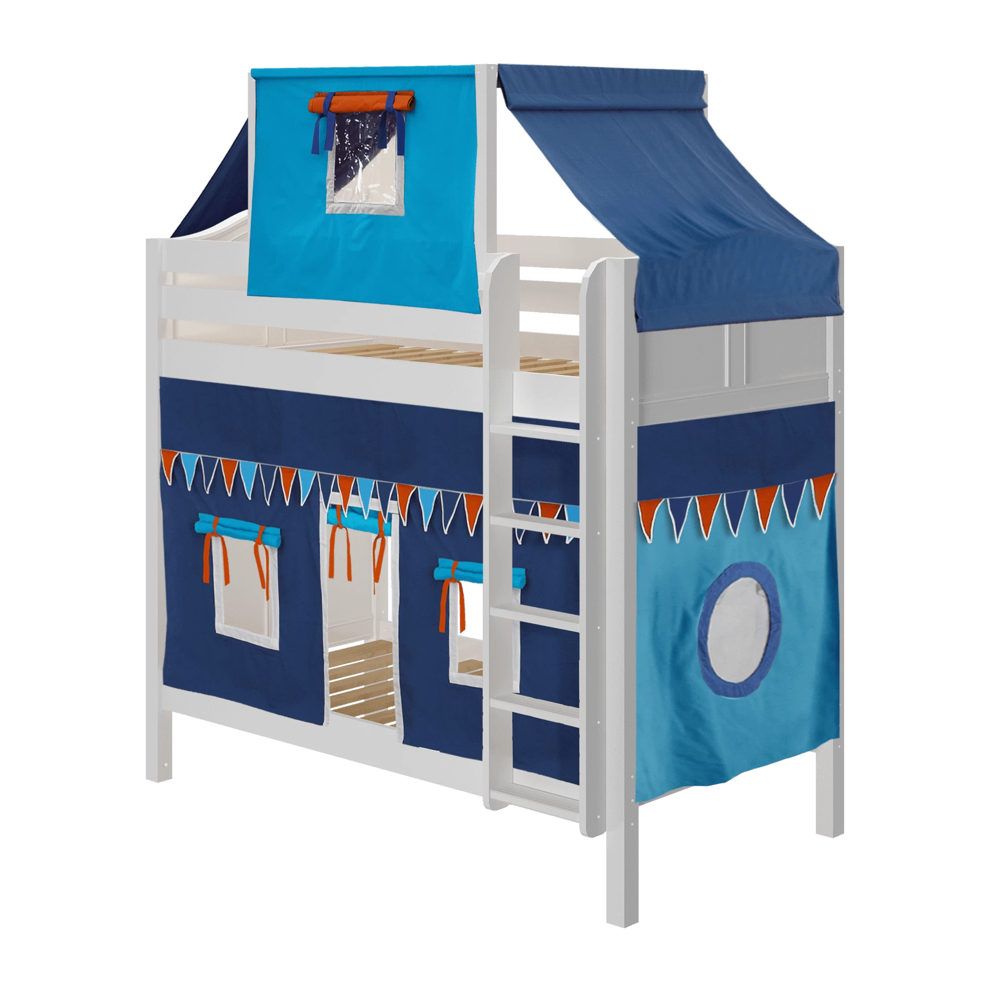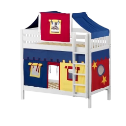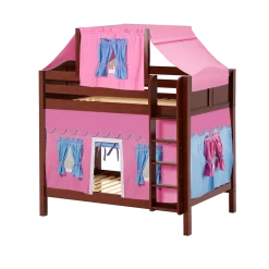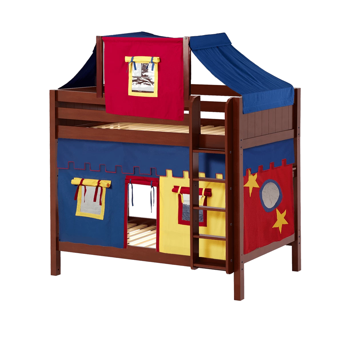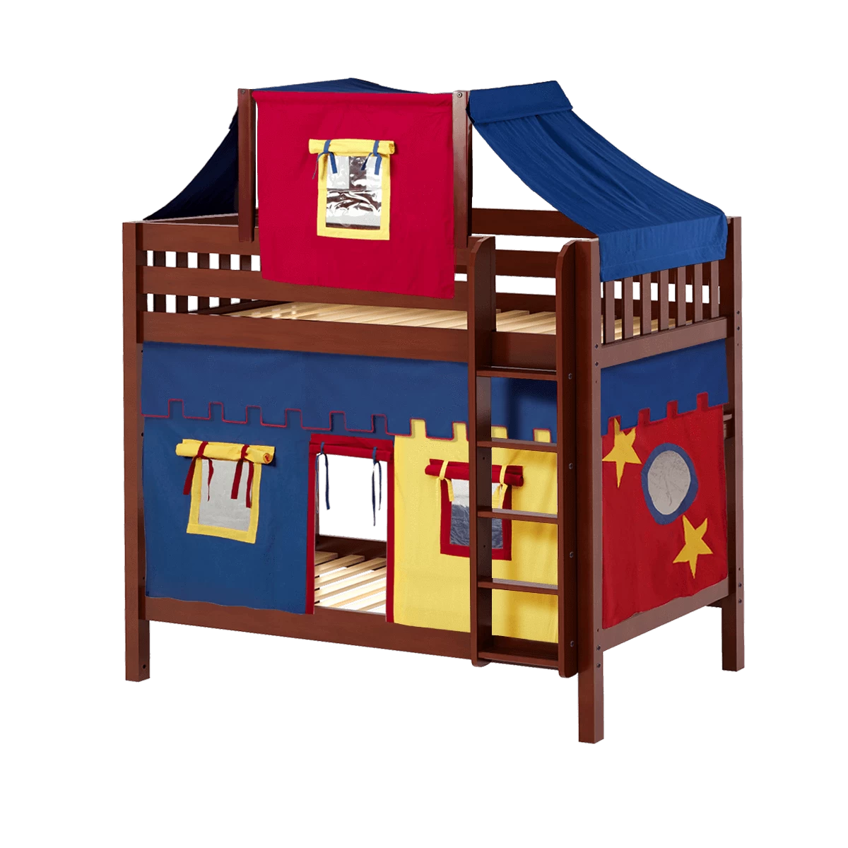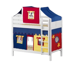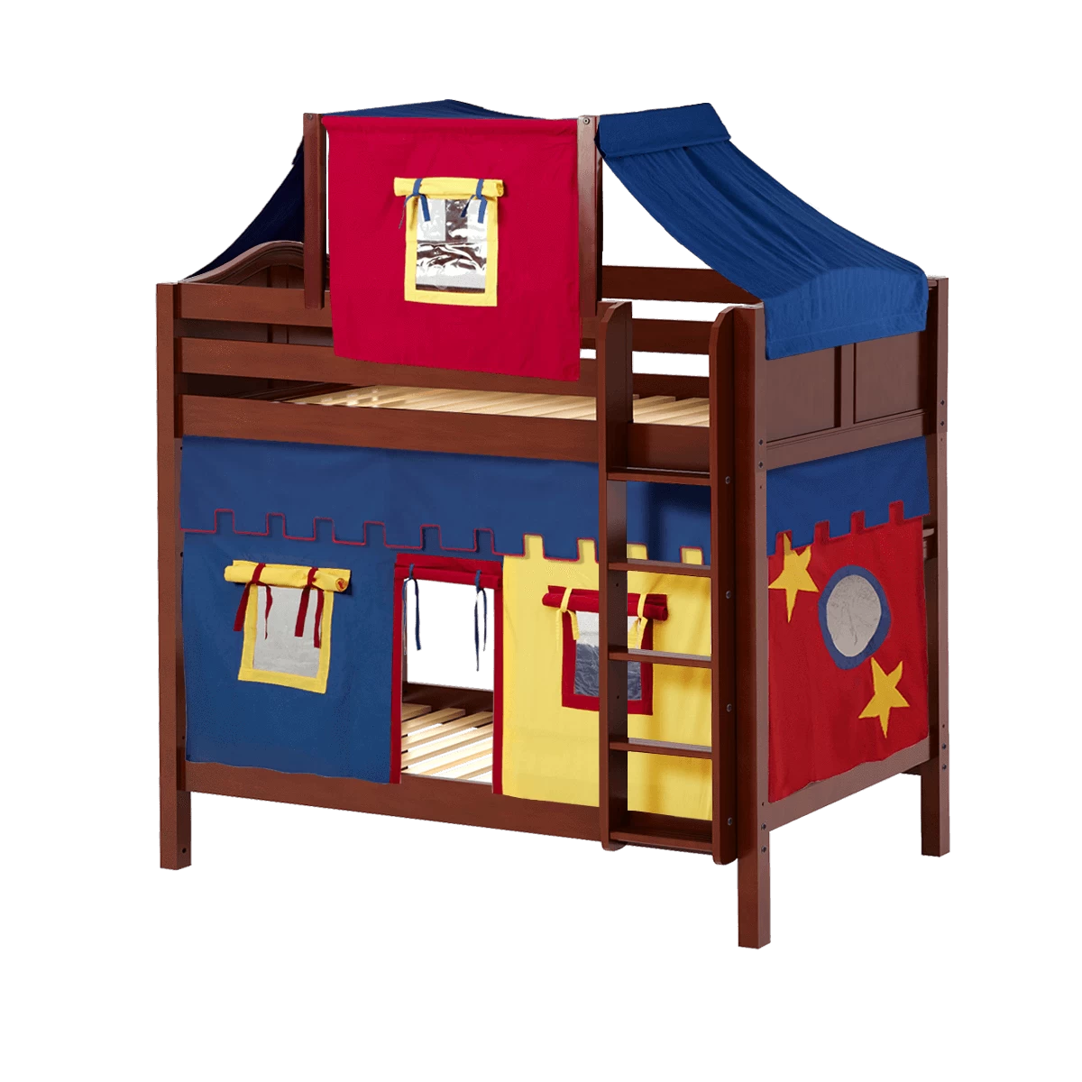 Colorful fabrics put a playful spin on our classic high bunk bed with straight ladder! Curtains + matching top tent will inspire your child’s imagination during the day and help them sleep soundly at night. 3.5 ft of space between top and bottom allows taller kids and adults to sit up comfortably.